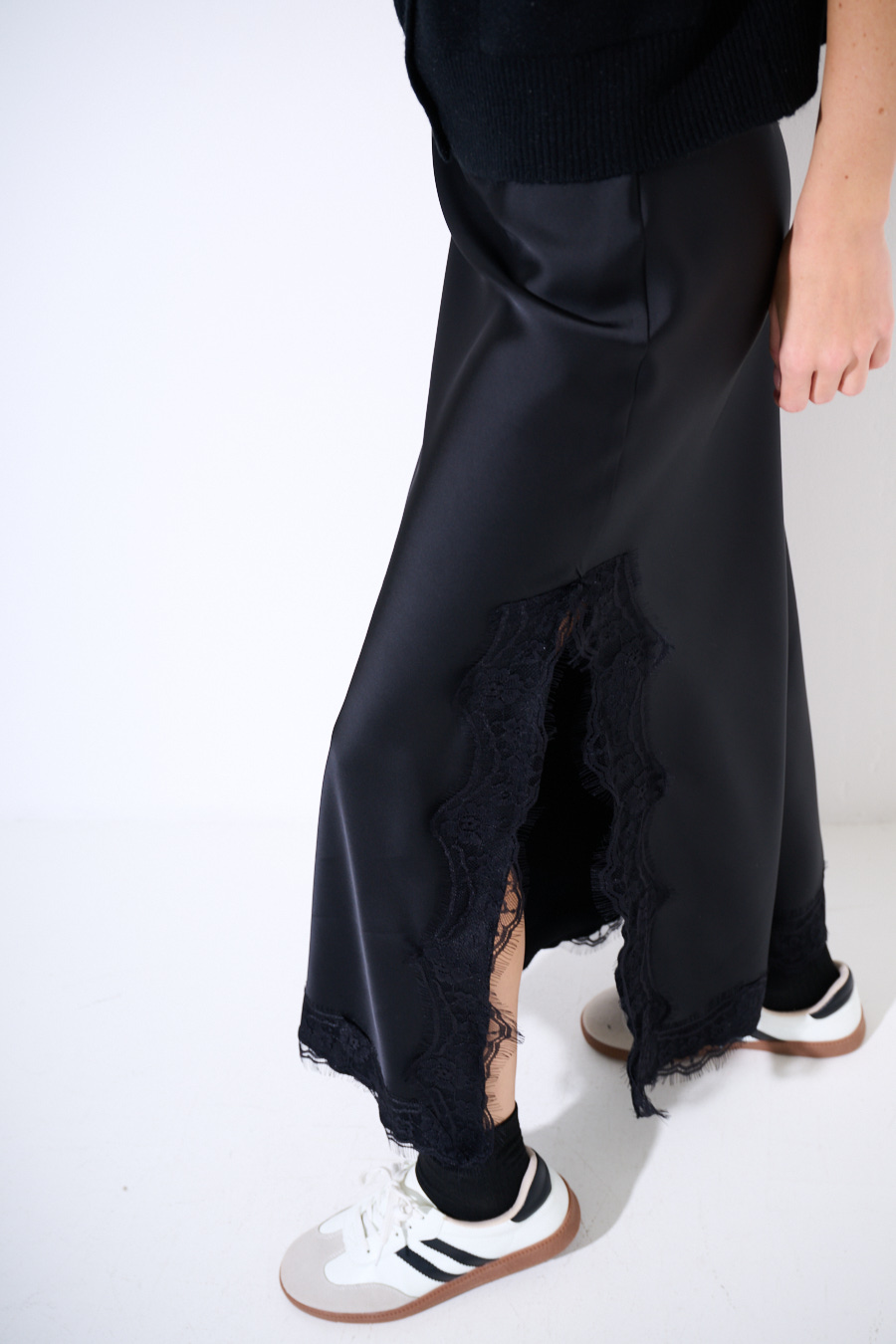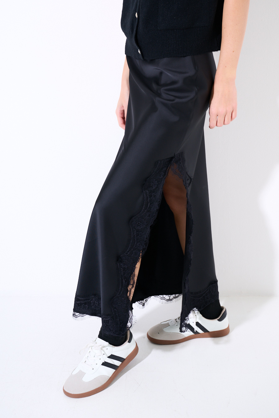 Gonna lunga con pizzo applicato a contrasto, con ampio spacco laterale ed elasticizzata in vita.