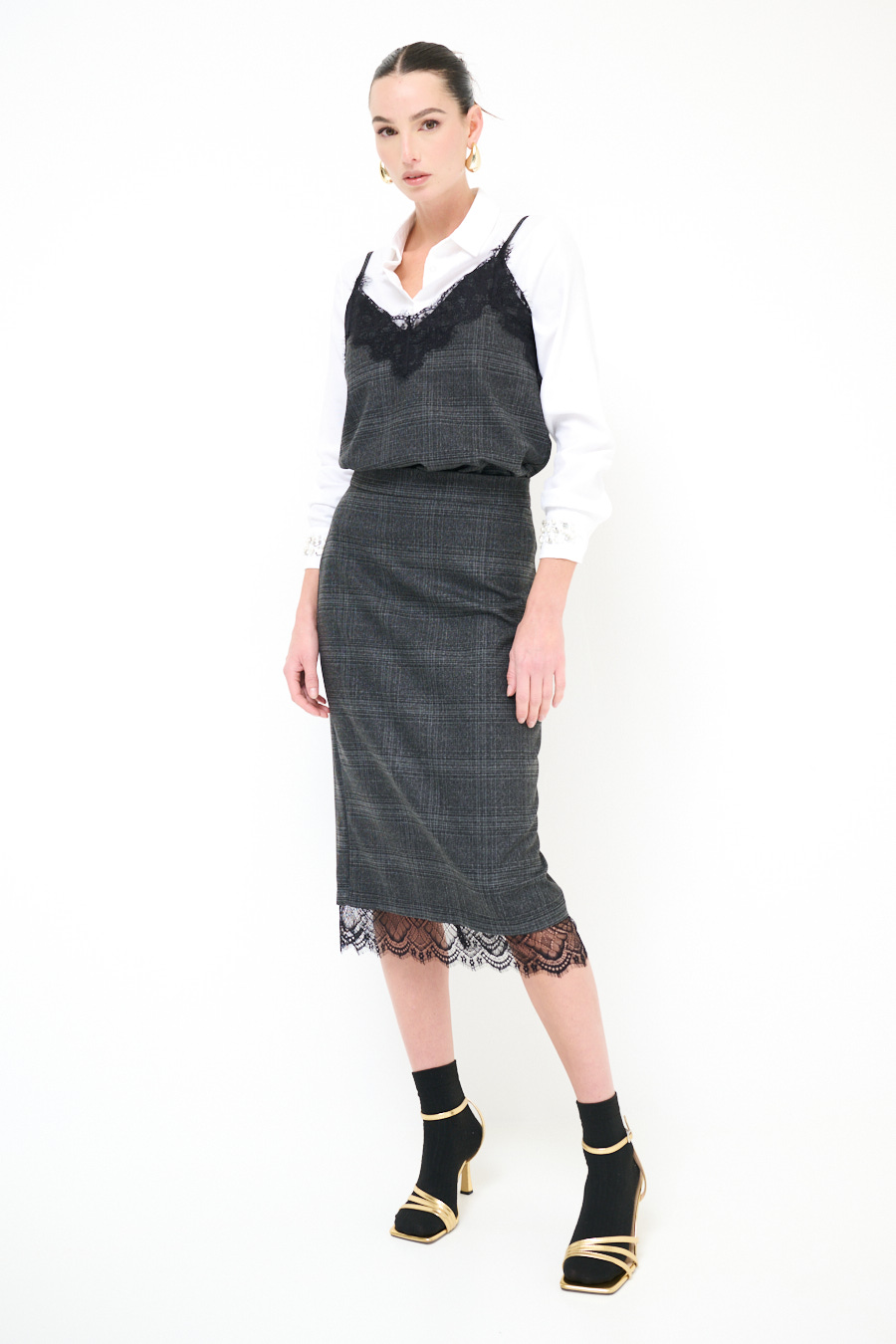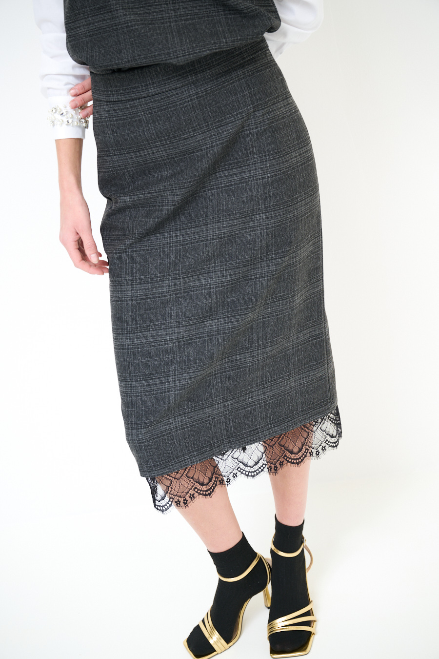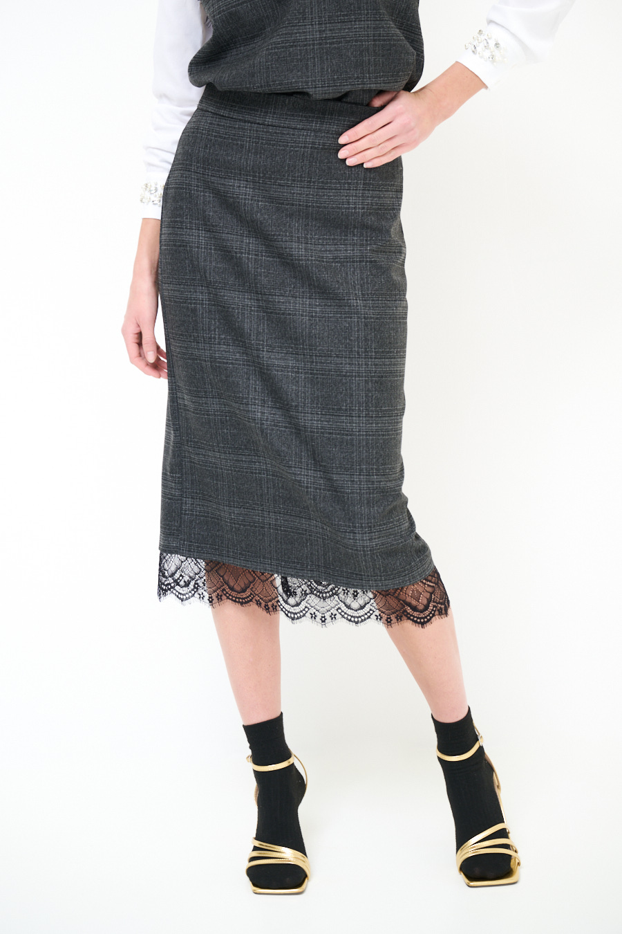 Gonna midi longuette con micro check con pizzo applicato sul fondo e chiusura con zip nascosta sul retro.