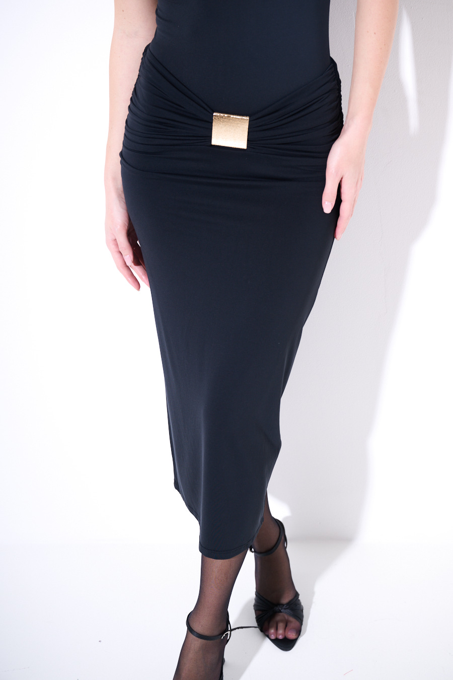 Gonna midi in tessuto elasticizzato con arricciatura e dettaglio dorato in vita.
