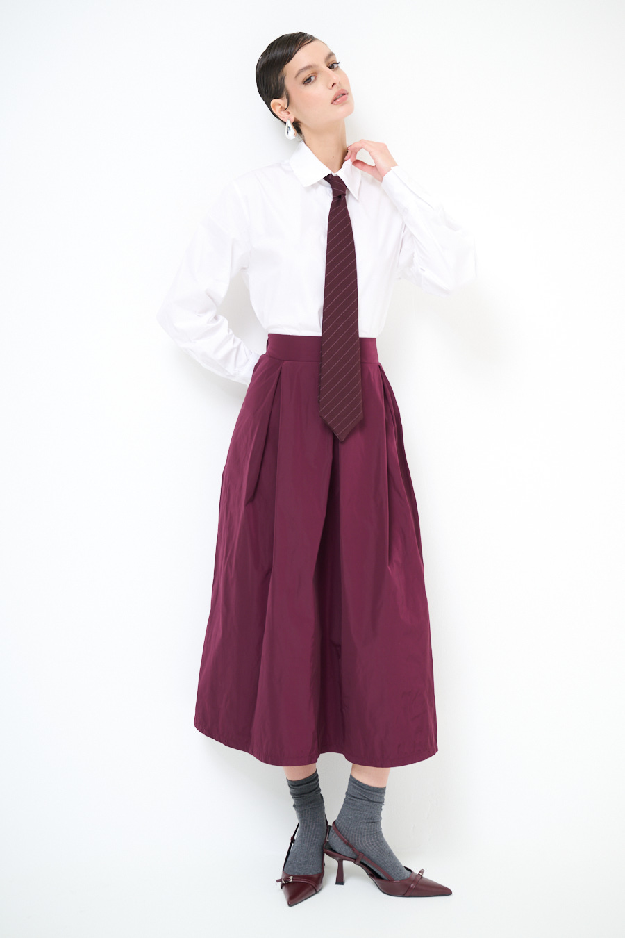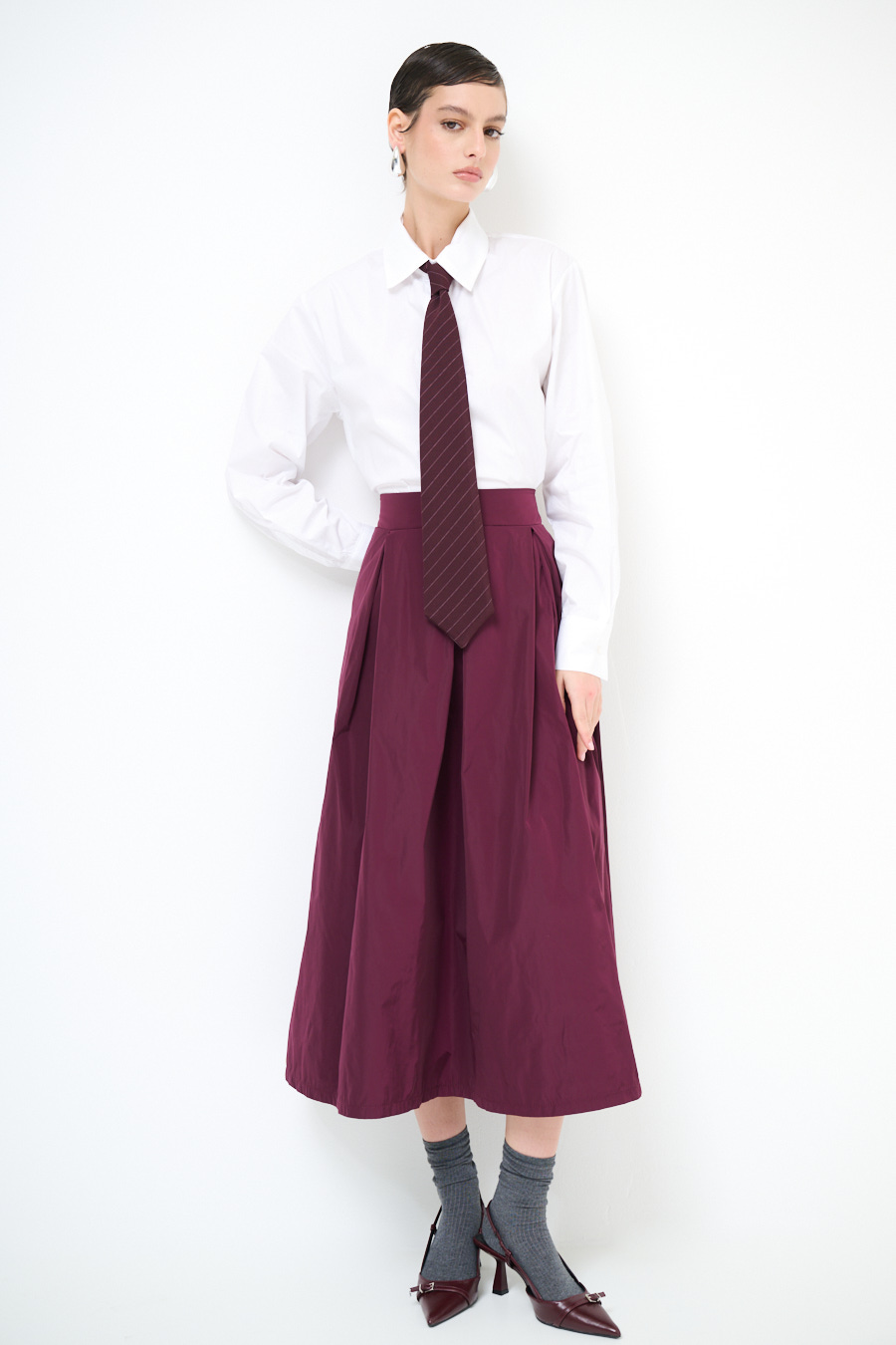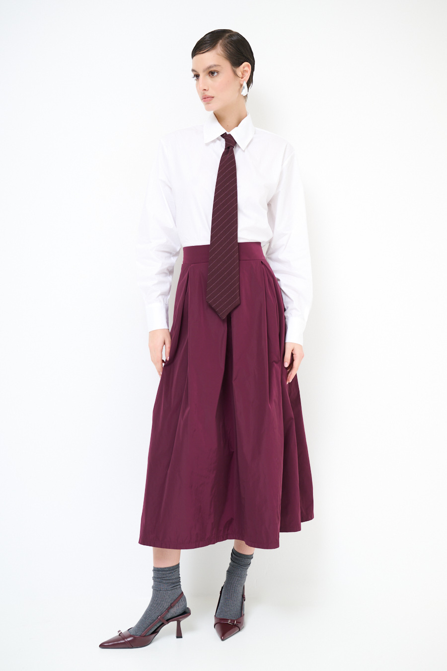 Gonna midi in taftà leggera con elastico sul retro in vita e pieghe frontali.