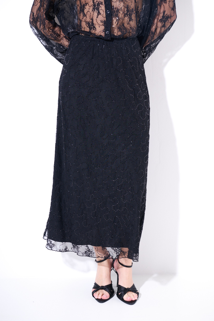 Gonna in pizzo midi svasata con ricamo paillettes e fodera interna, elasticizzata in vita.