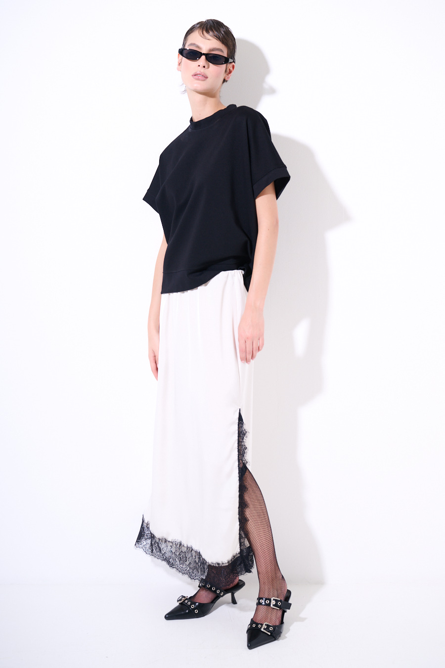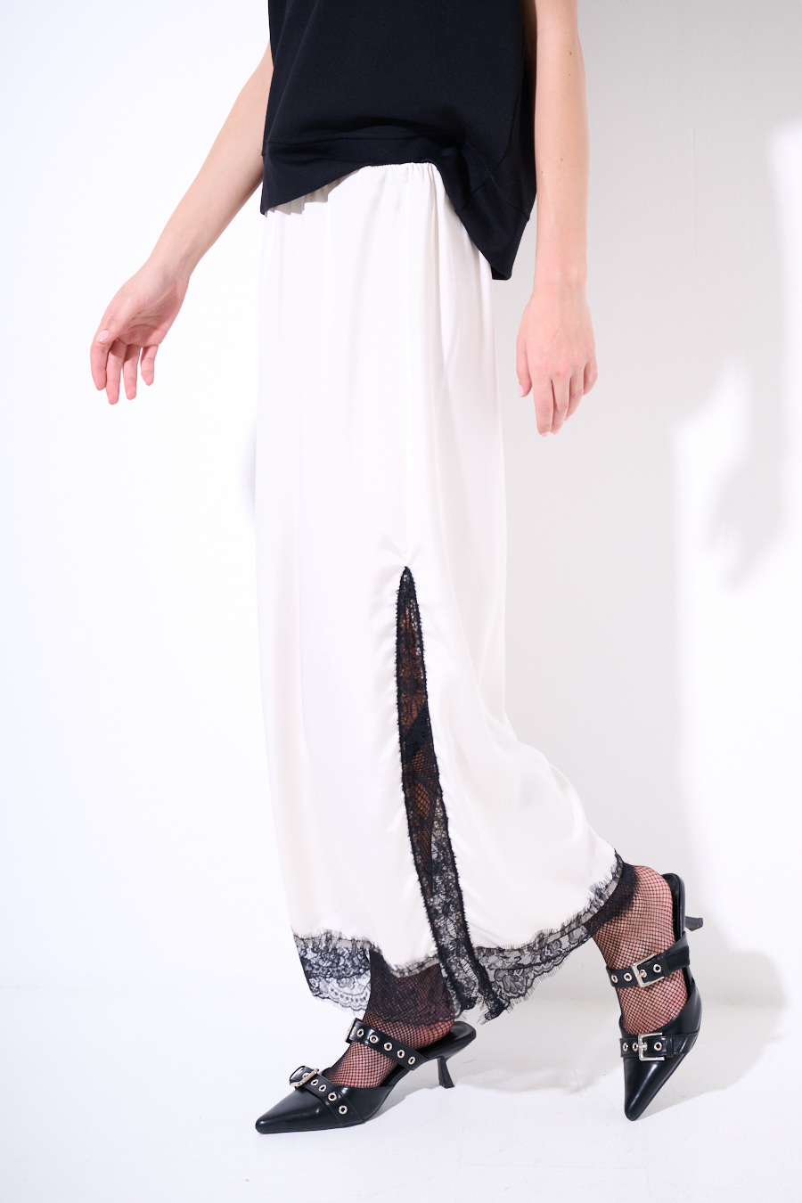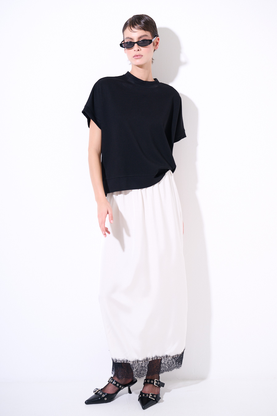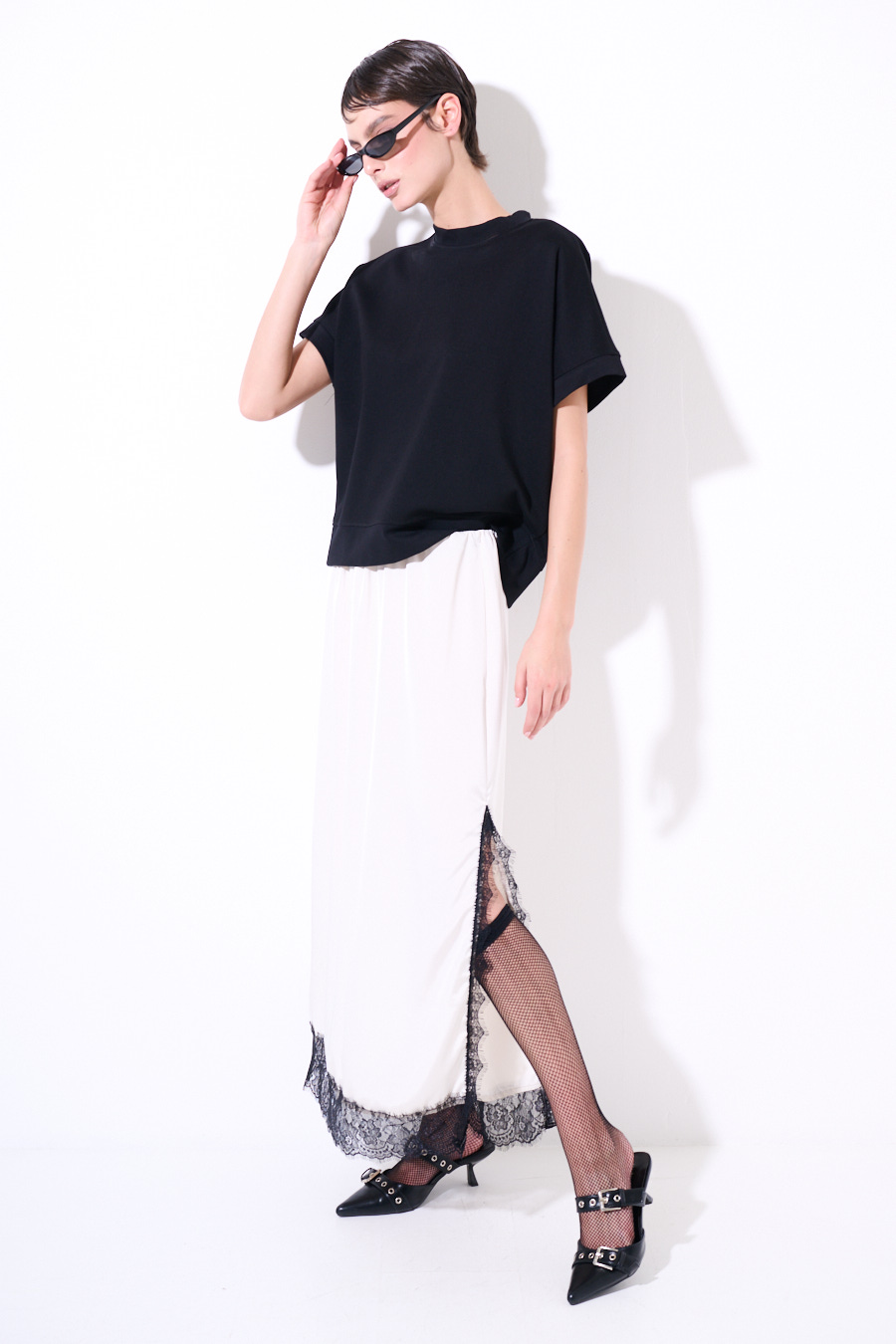 Gonna lunga con pizzo applicato a contrasto, con ampio spacco laterale ed elasticizzata in vita.