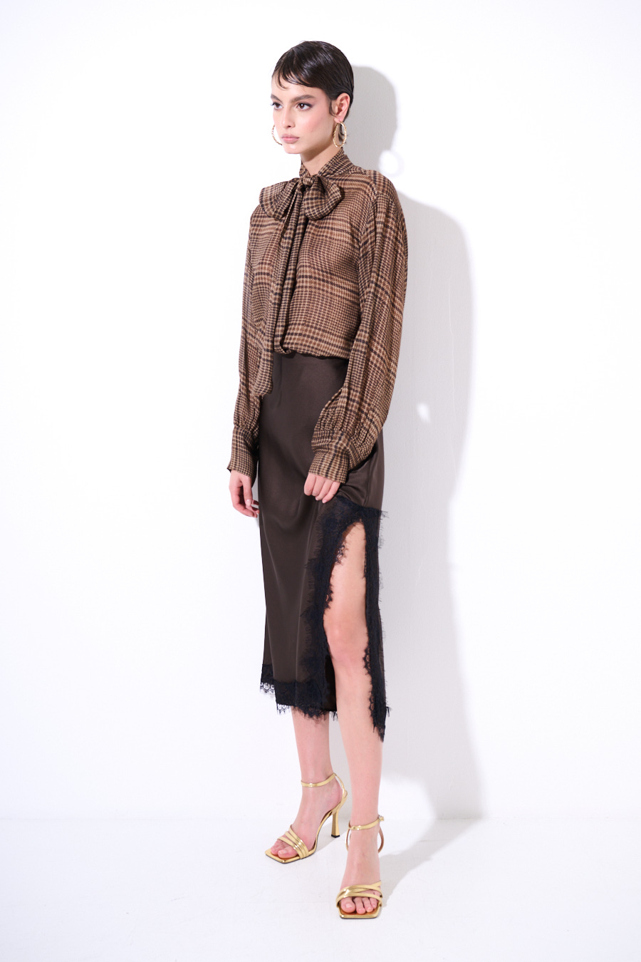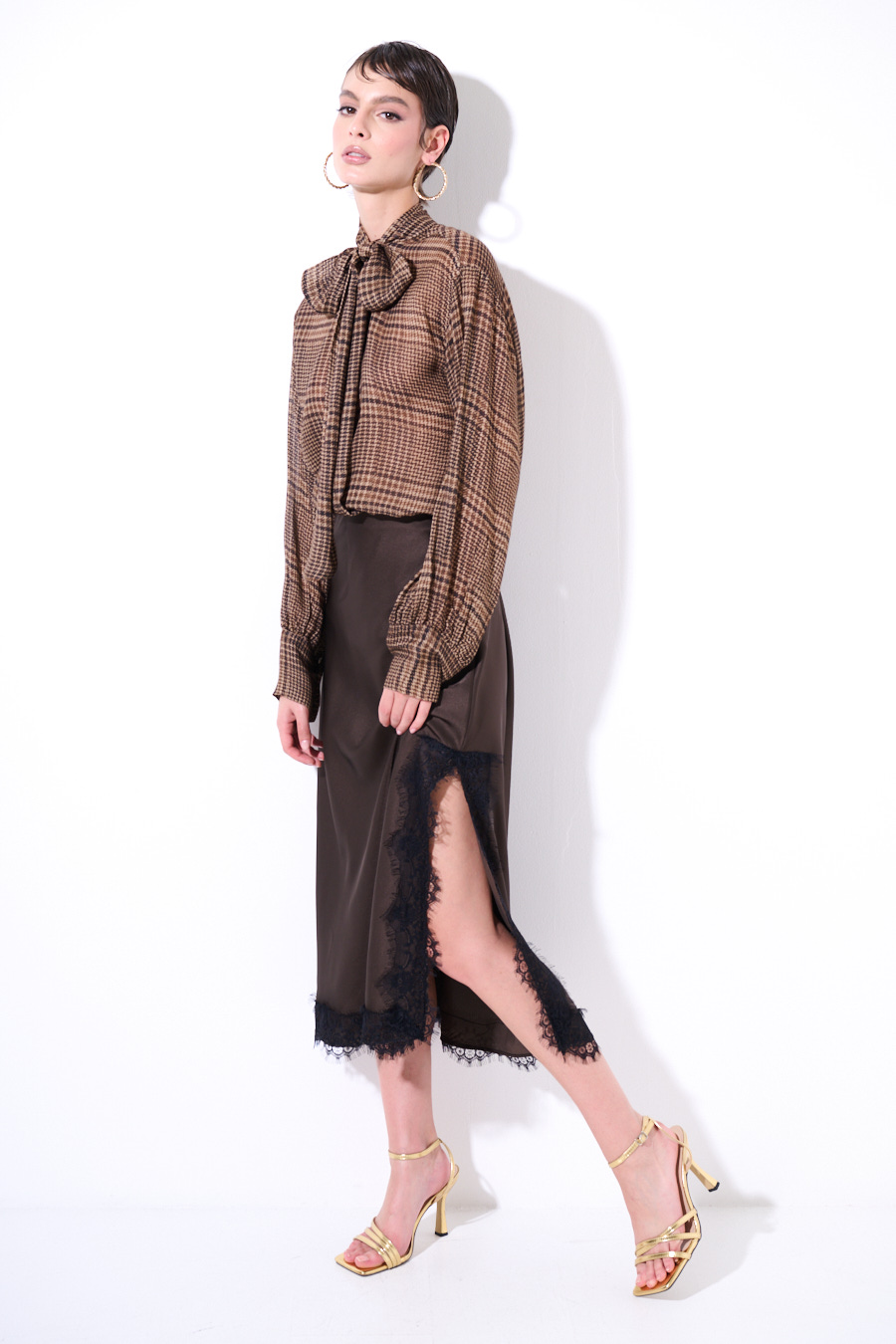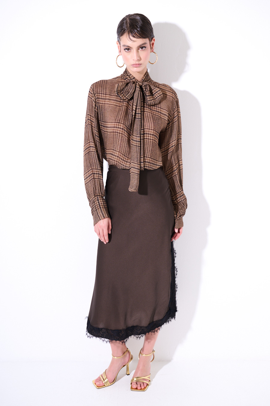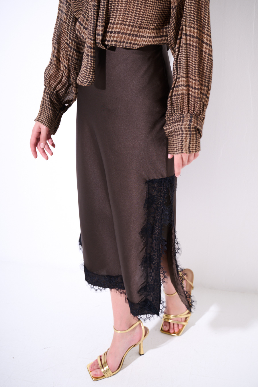 Gonna lunga con pizzo applicato a contrasto, con ampio spacco laterale ed elasticizzata in vita.