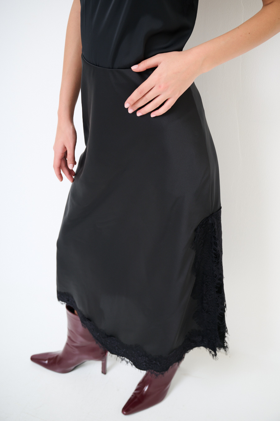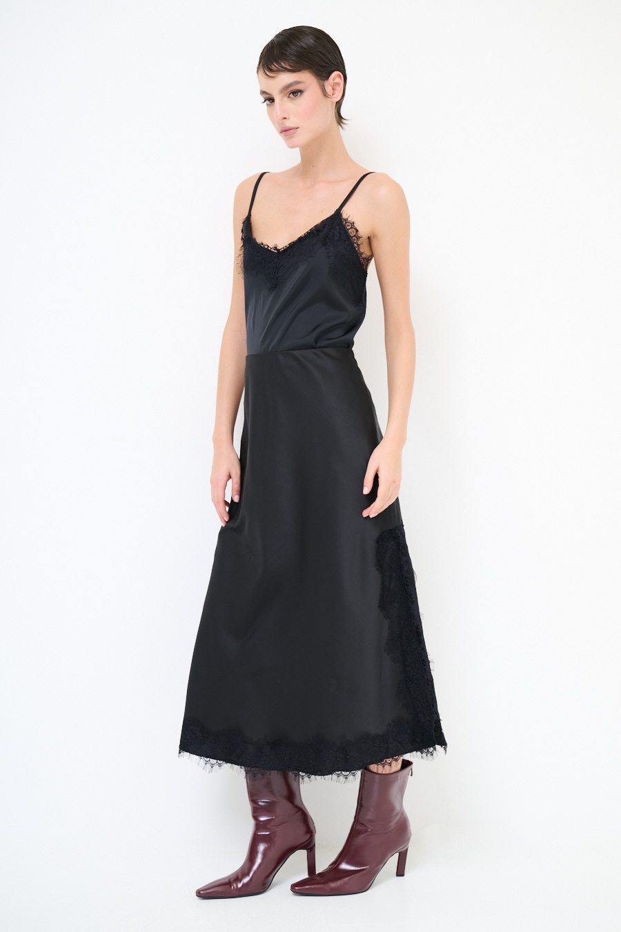Gonna lunga con pizzo applicato a contrasto, con ampio spacco laterale ed elasticizzata in vita.
