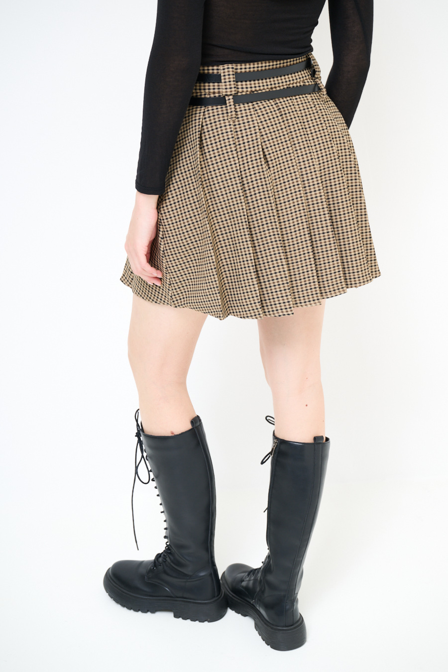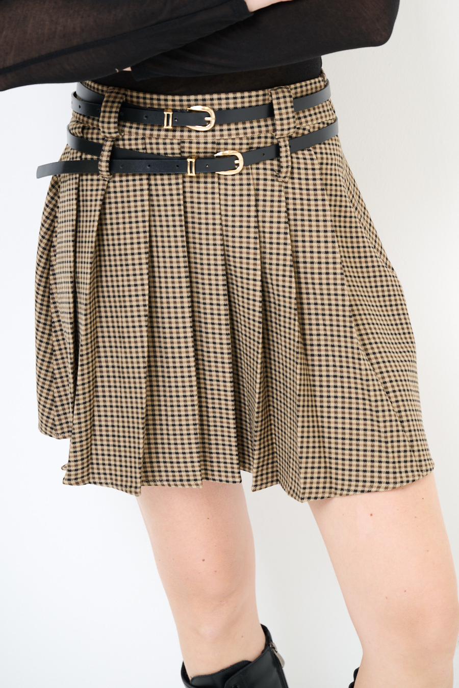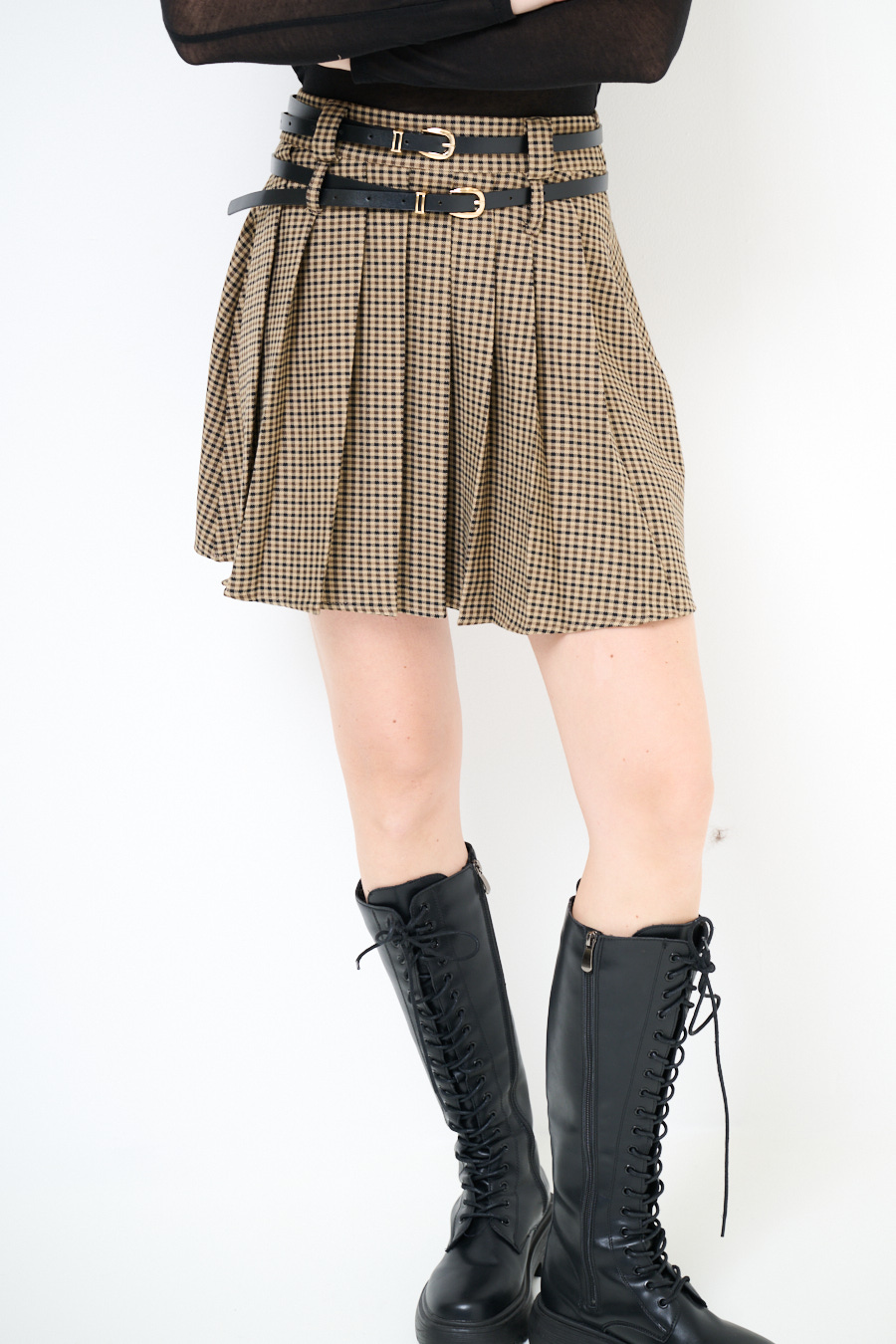 MINI CON PIEGHE DOPPIA CINTURA CHECK MORO