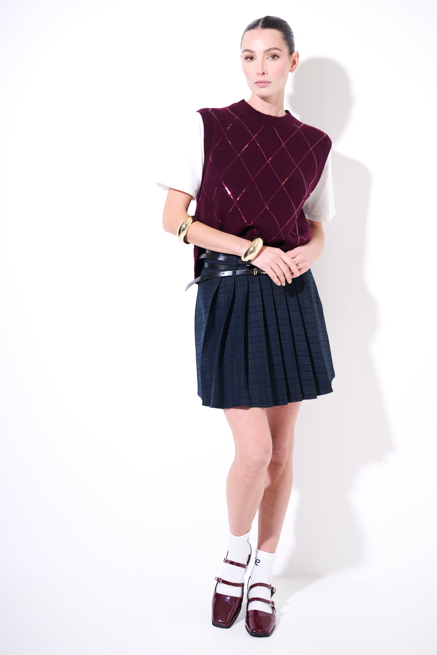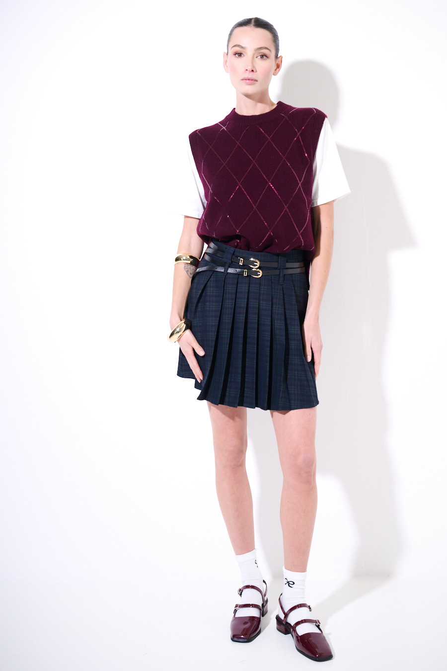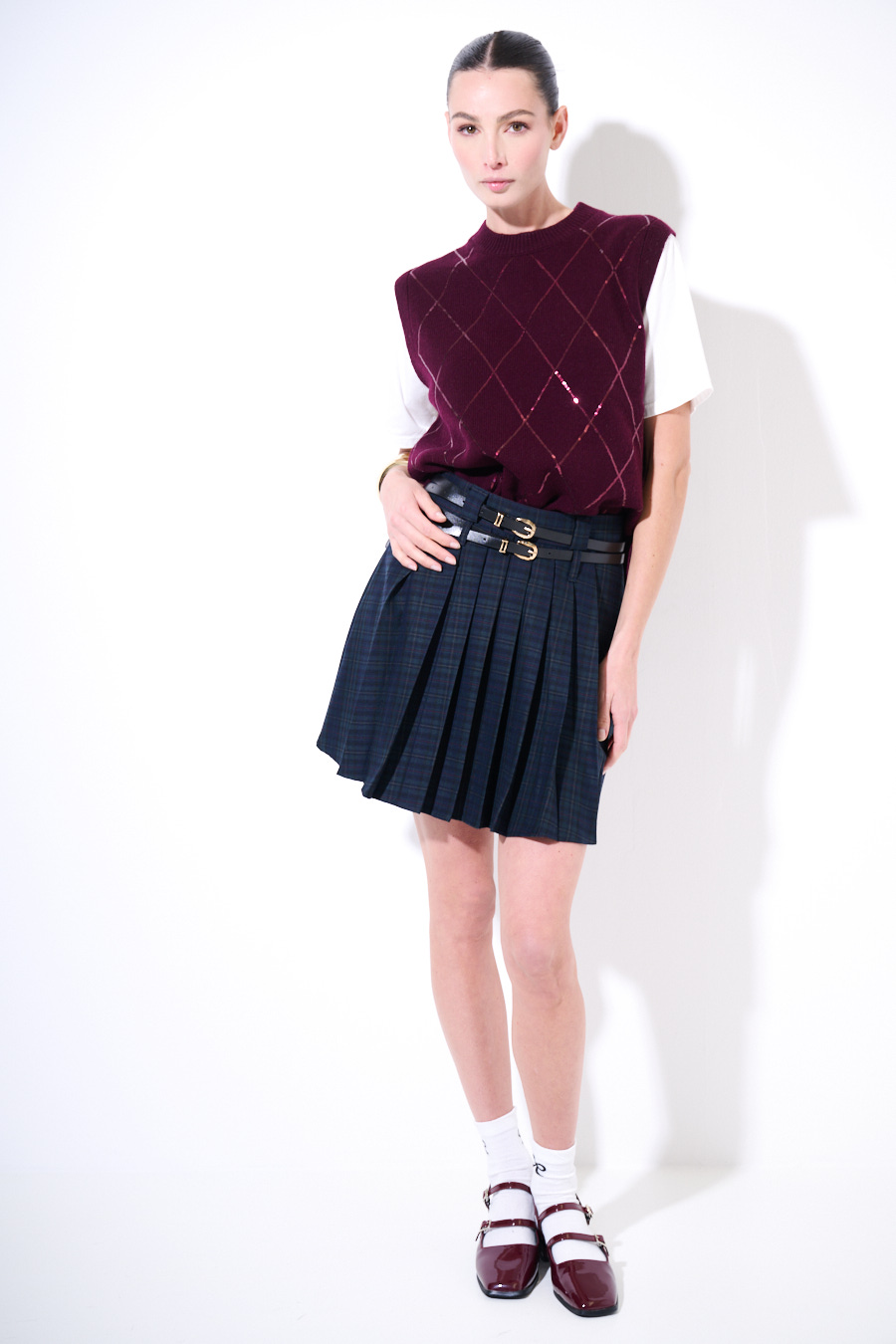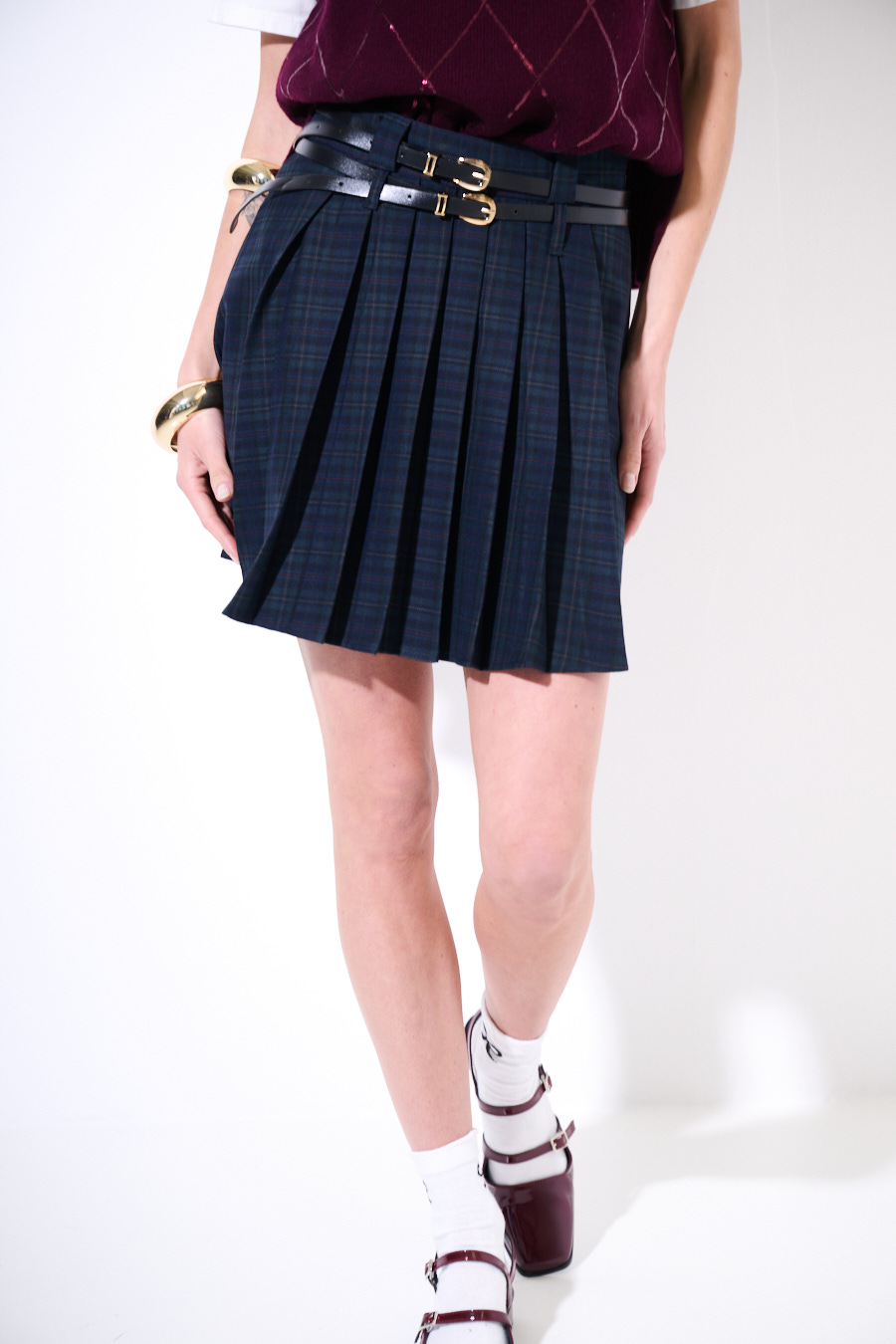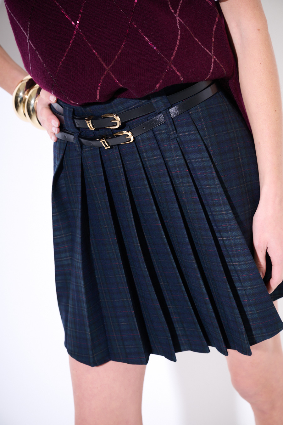 MINI CON PIEGHE DOPPIA CINTURA CHECK VERDE
