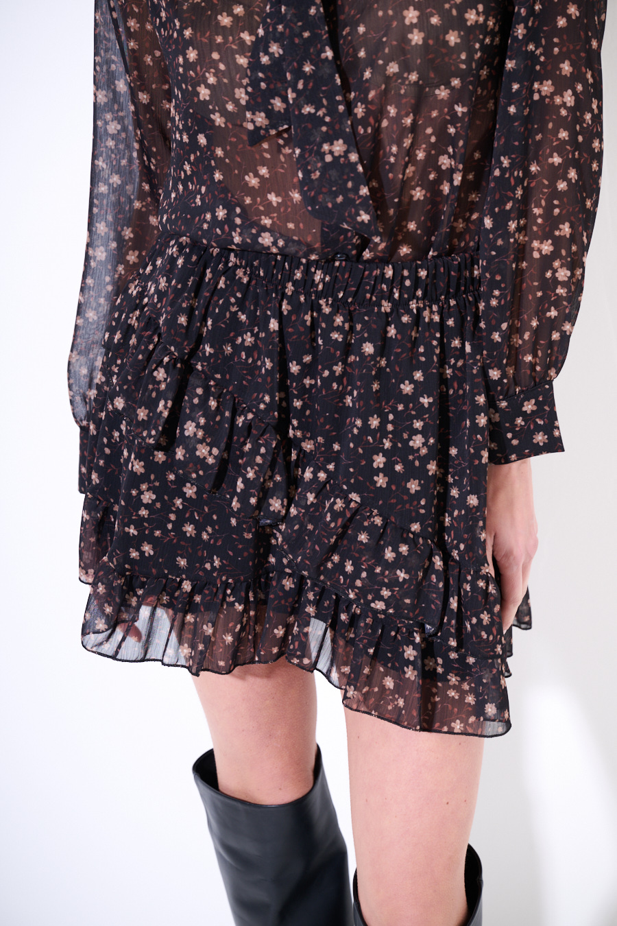 Minigonna stampata con doppie balze ed elastico in vita, semitrasparente, con fodera interna.