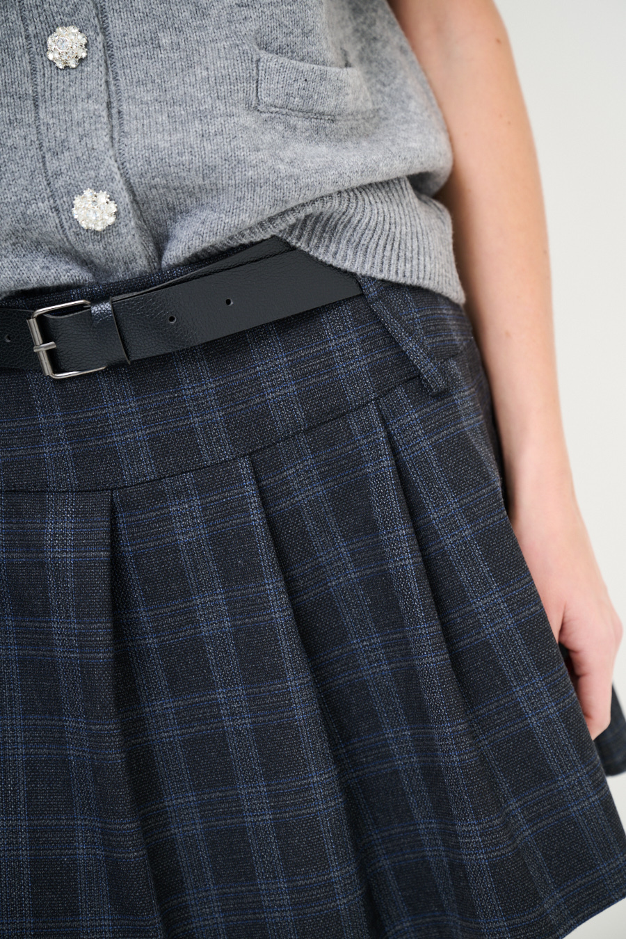 Minigonna a quadri con pieghe e con doppi passanti per cintura.