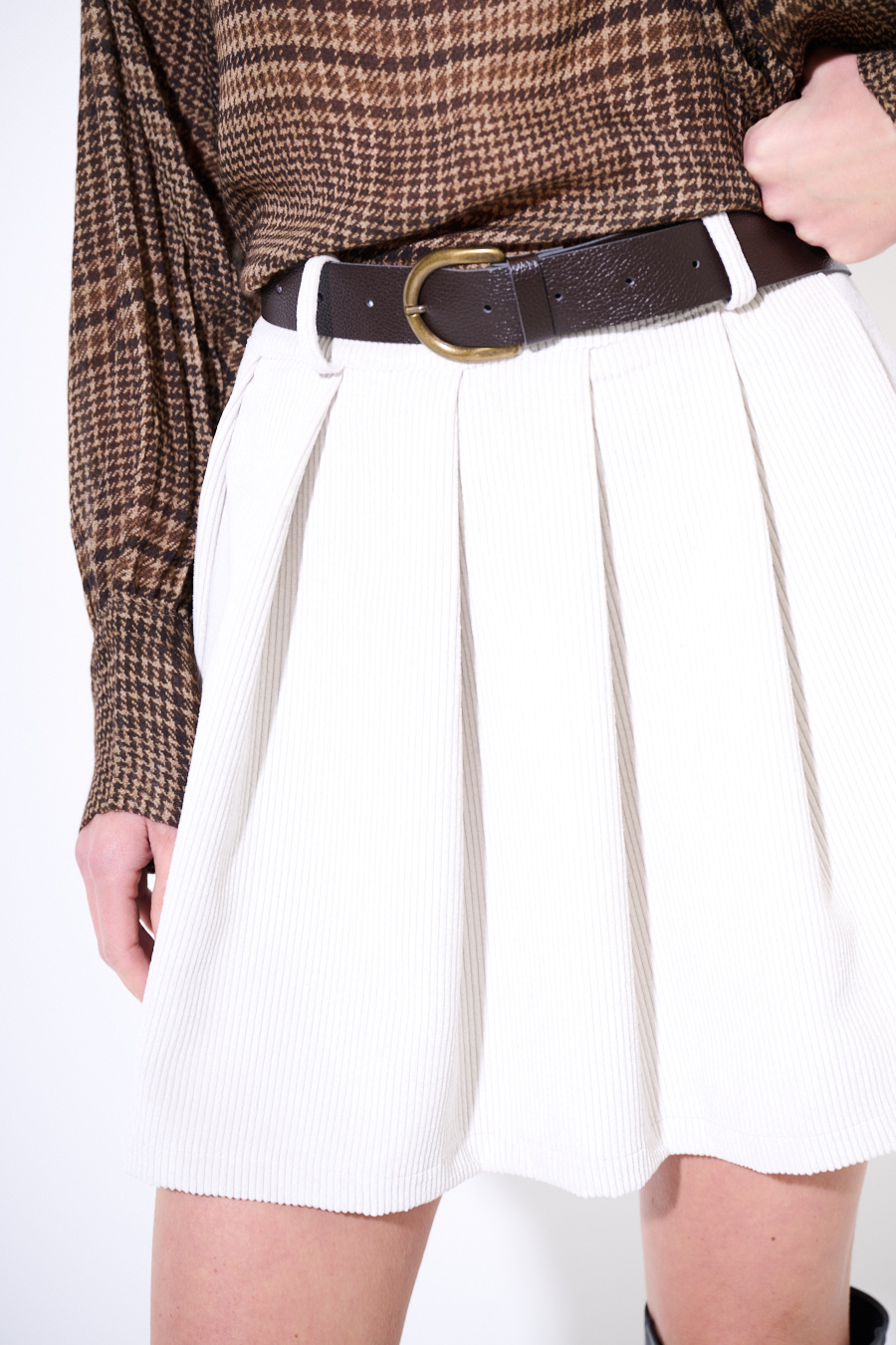 Minigonna a pieghe in velluto a coste con cintura in vita.