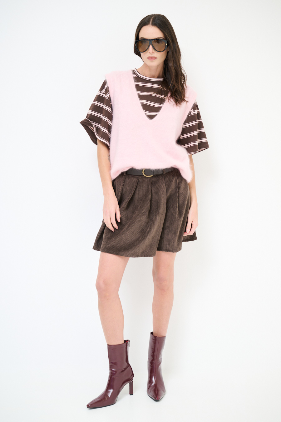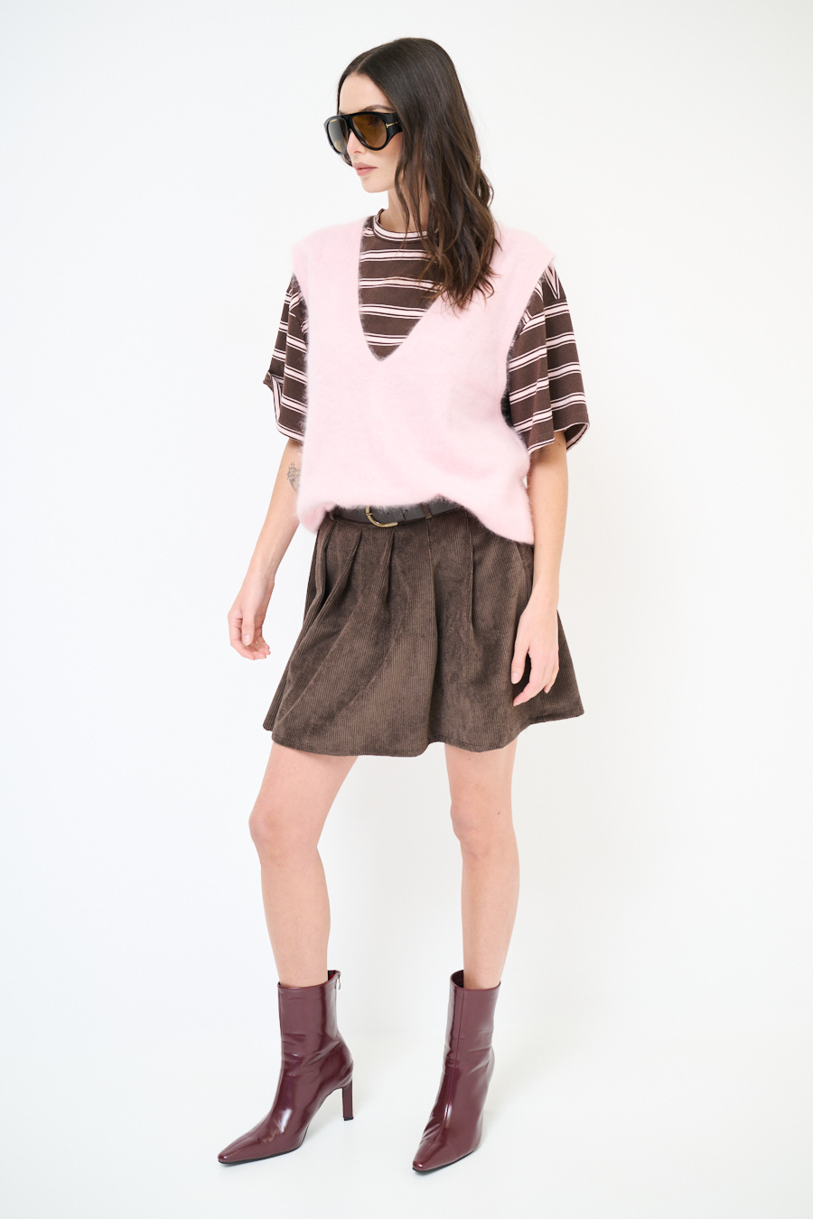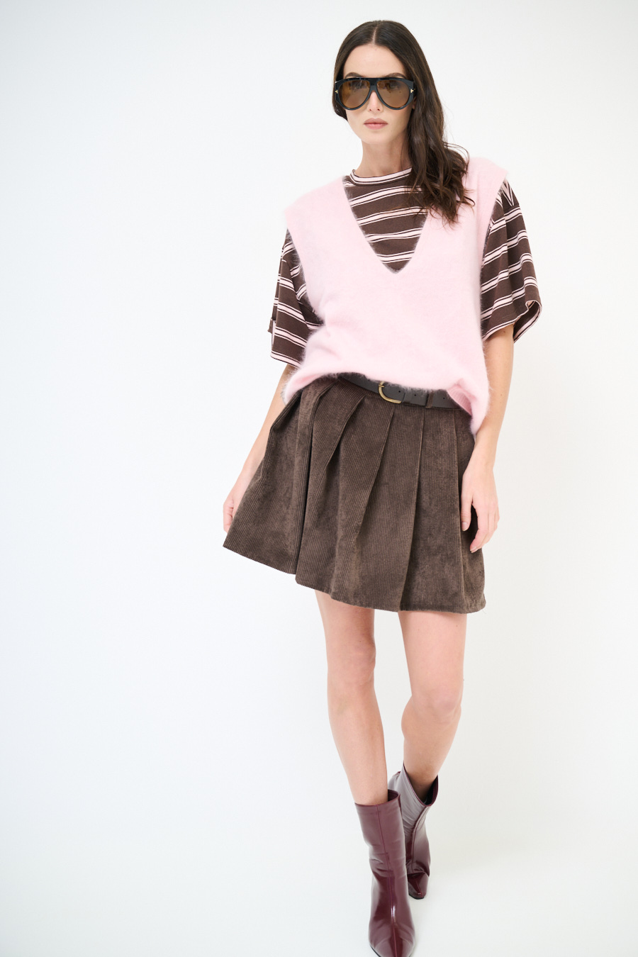 Minigonna a pieghe in velluto a coste con cintura in vita.