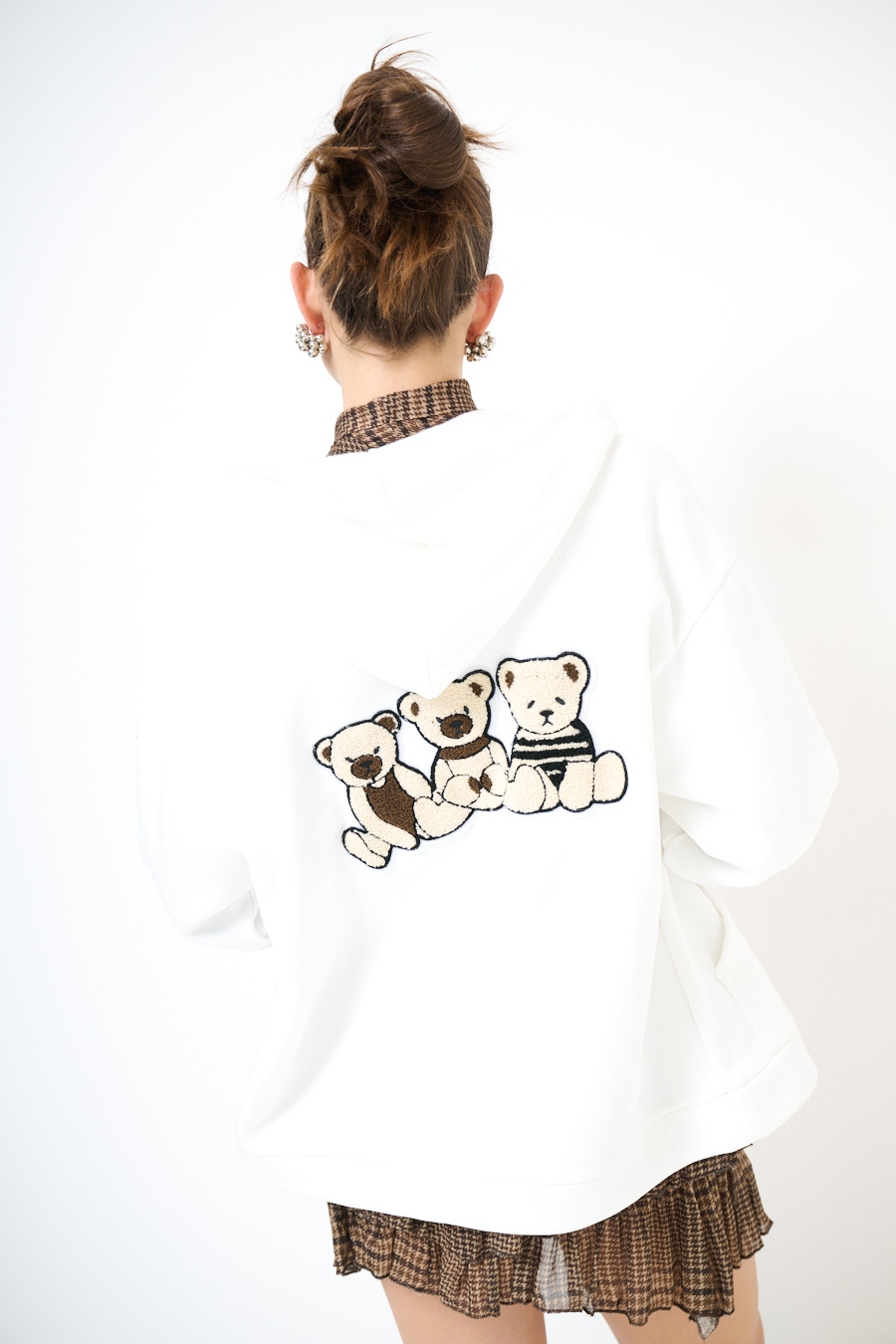Felpa con zip centrale e cappuccio, con patch orsetti sulla schiena, felpata internamente.