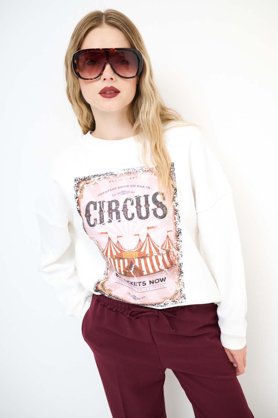 Felpa oversize con spalla calata, stampa Circus e felpata internamente.
