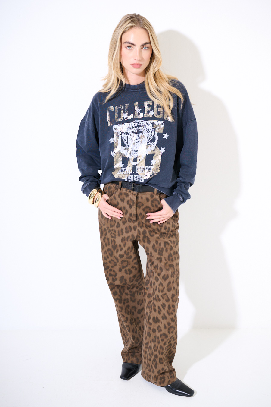 Maglia felpata con effetto marmorizzato vintage con stampa college glitter, spalla calata.