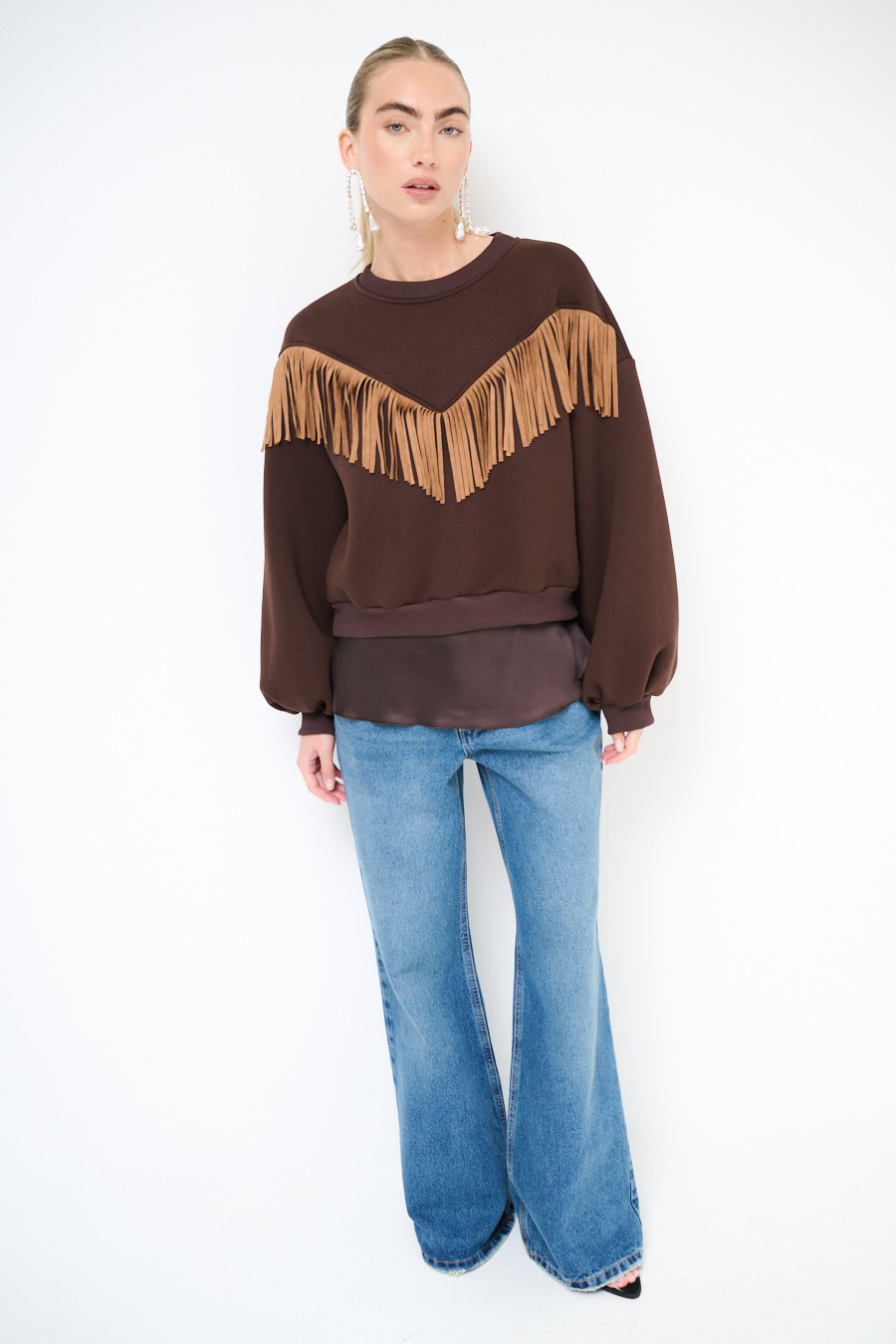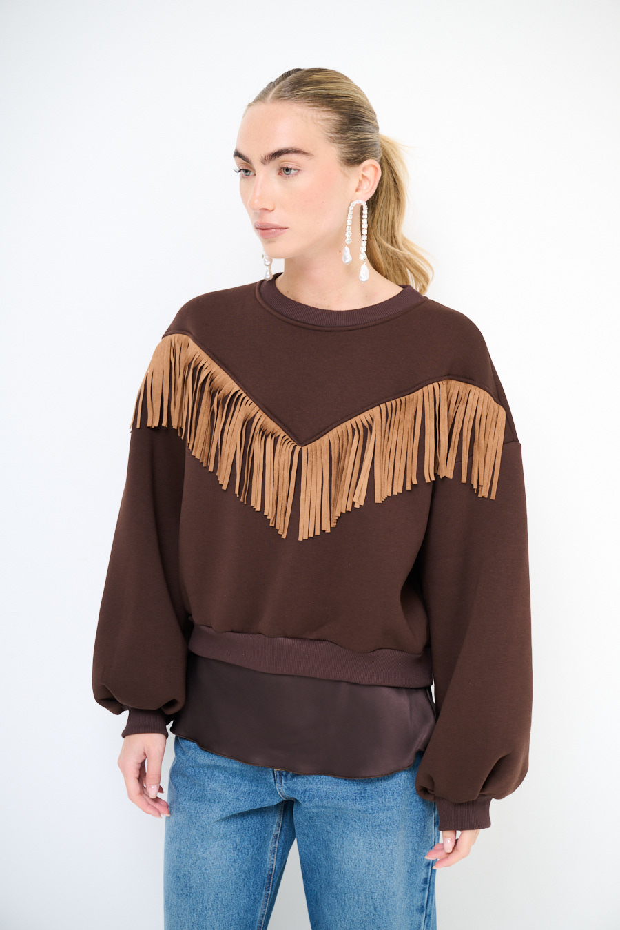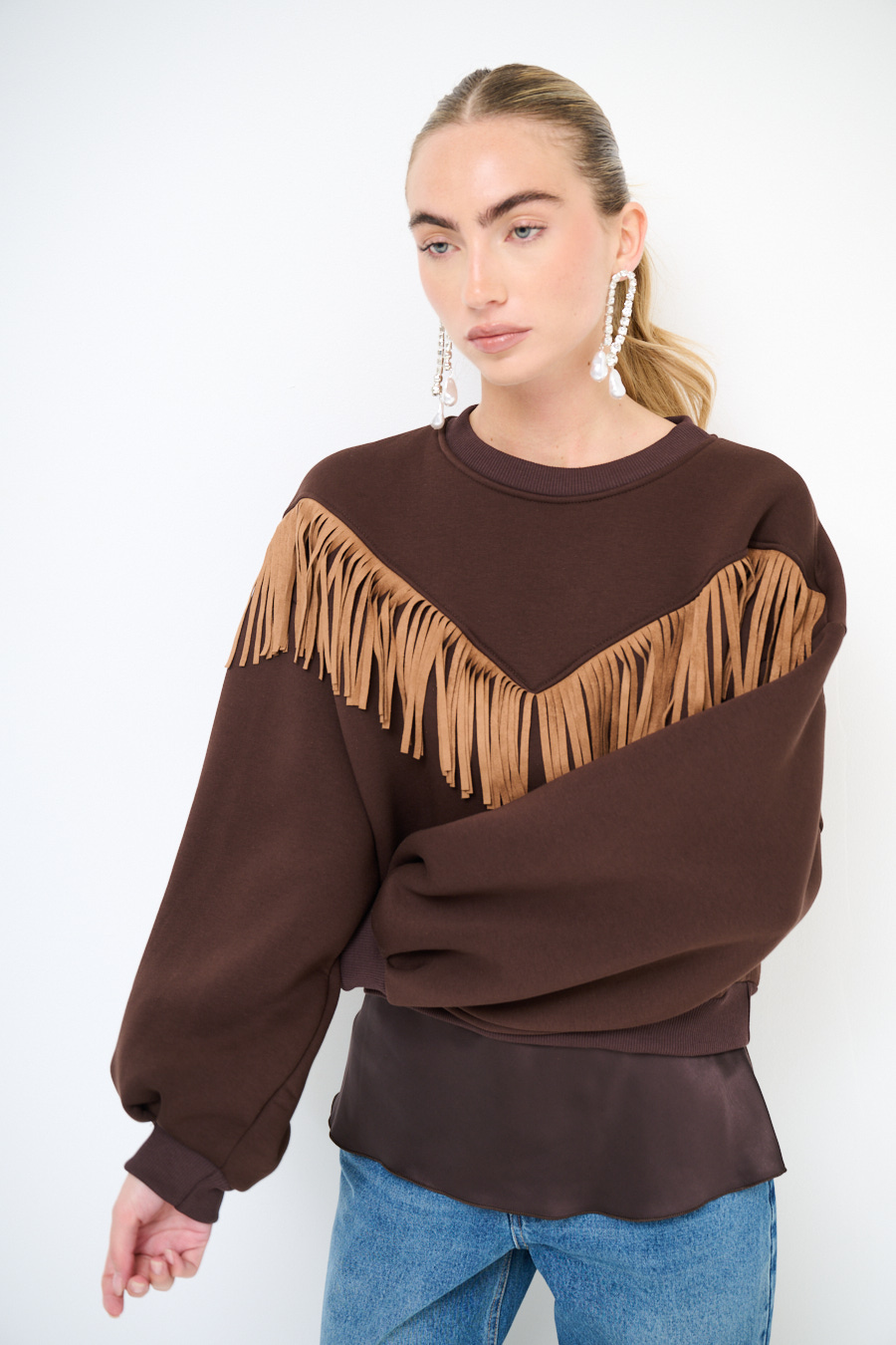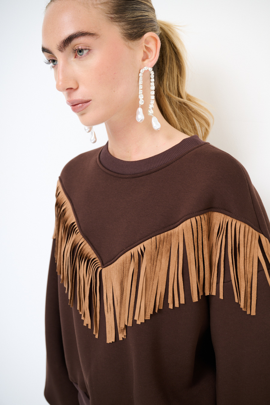 Felpa girocollo warm felpata internamente con frange in dainetto a v applicate sul davanti.