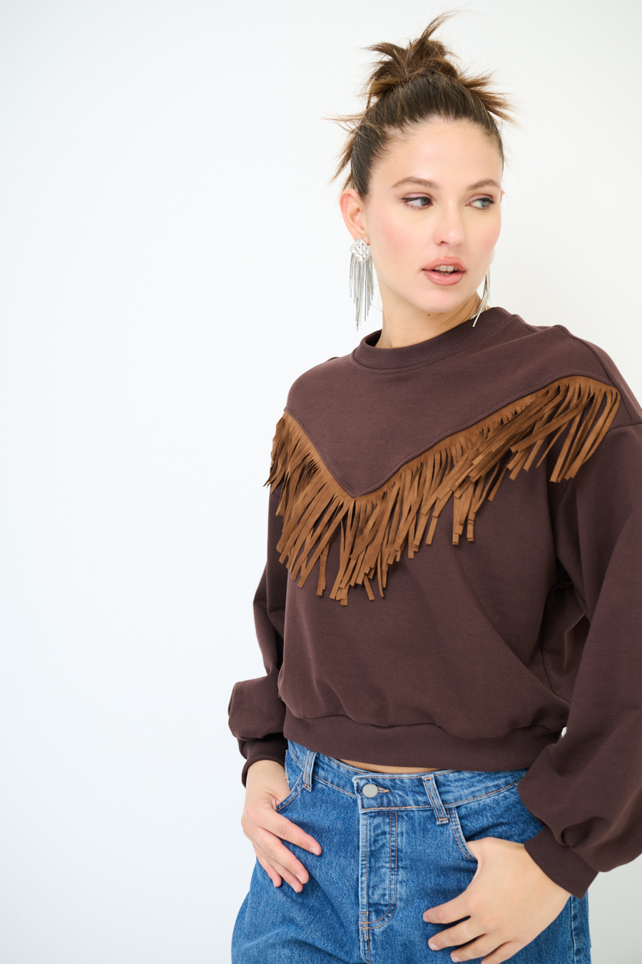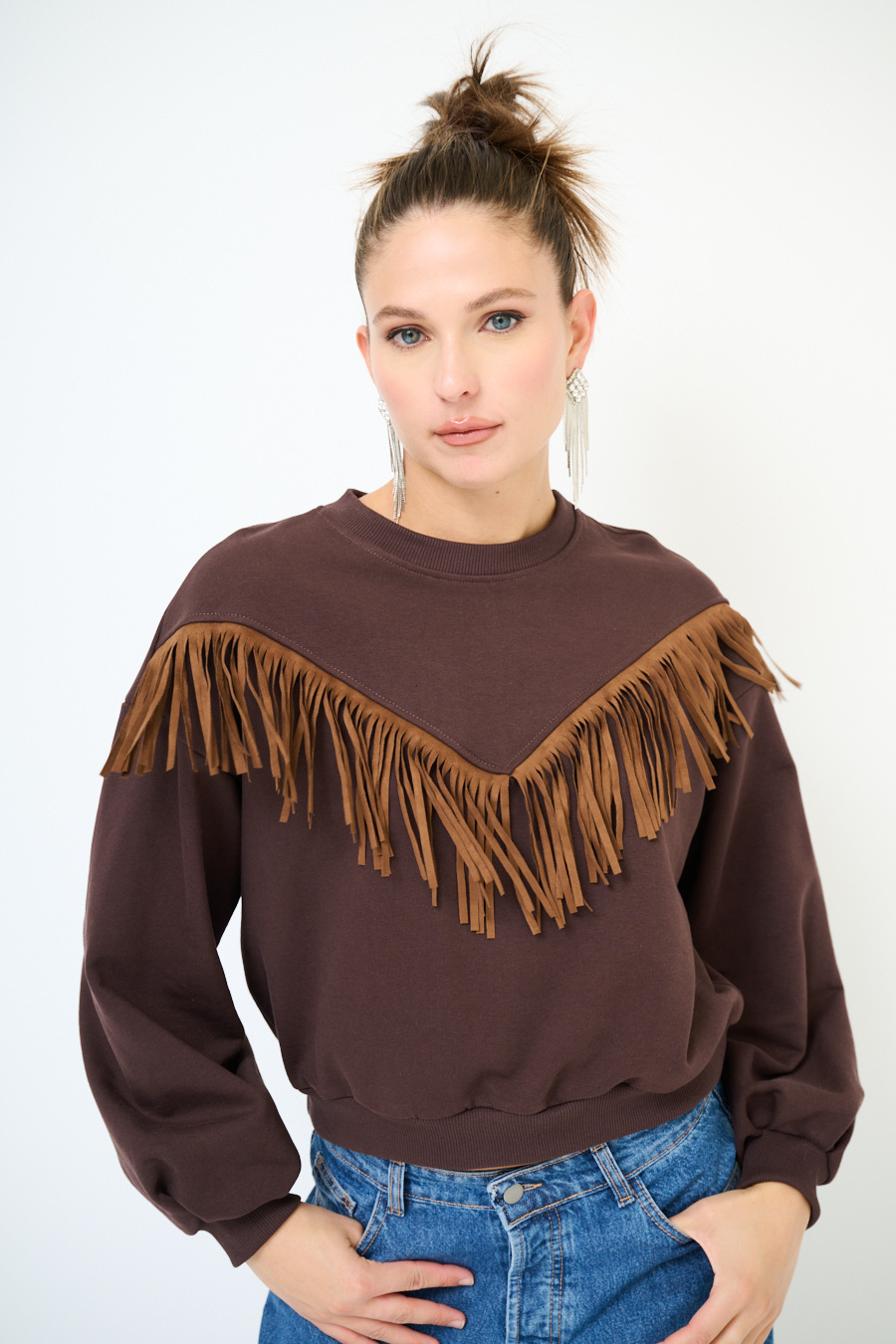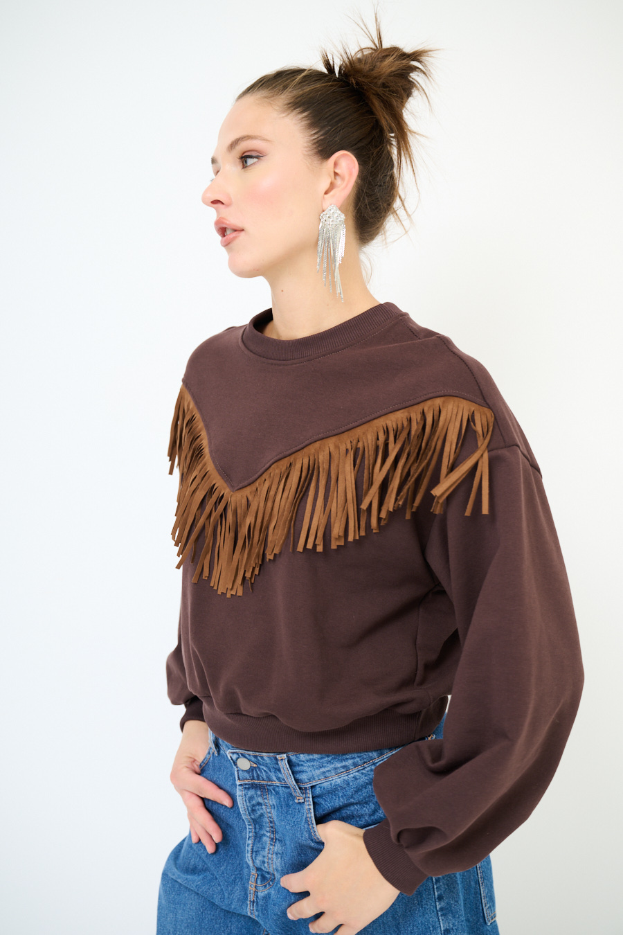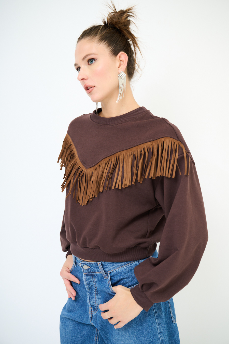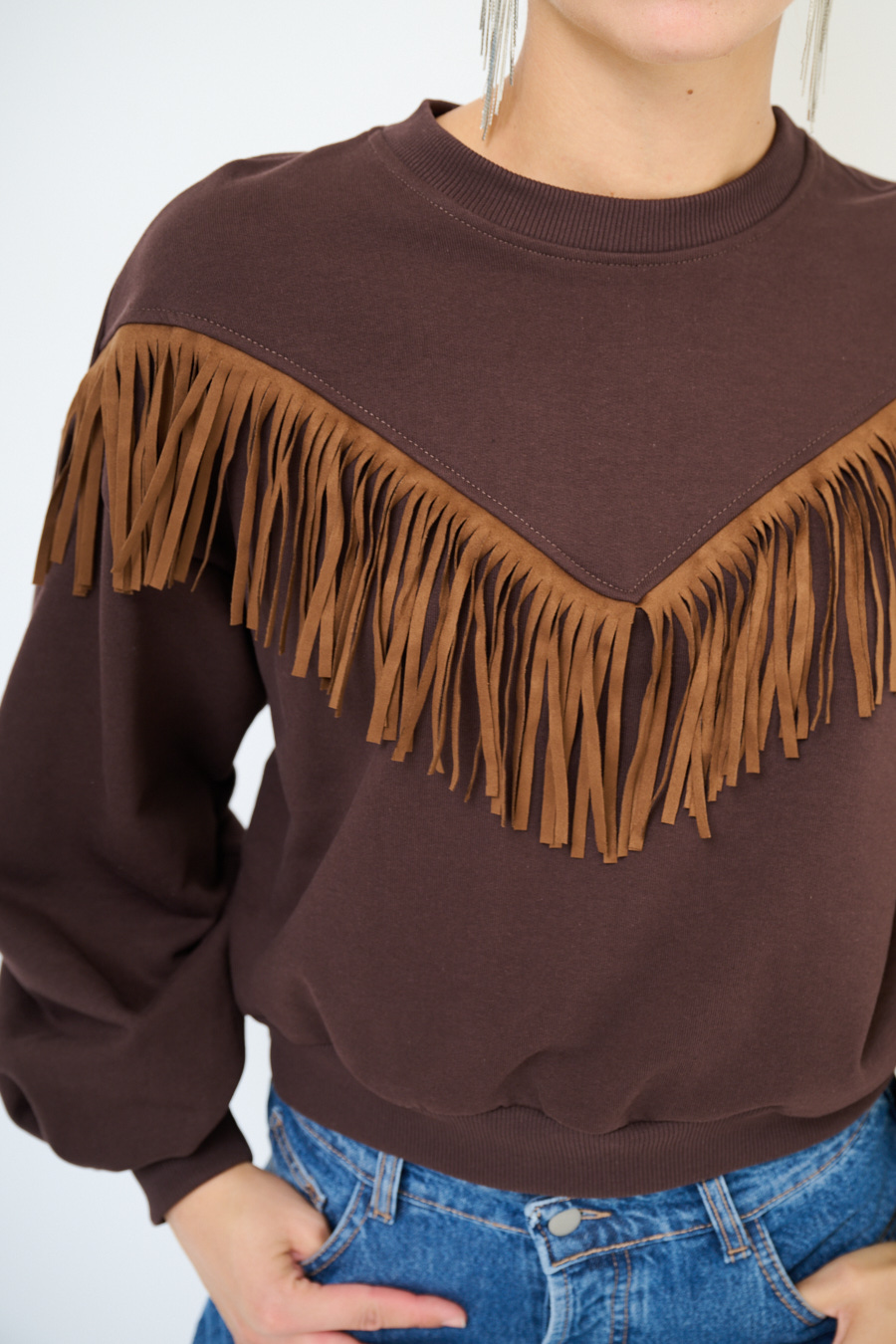 Felpa garzata oversize a girocollo con frange sul davanti in eco dainetto.