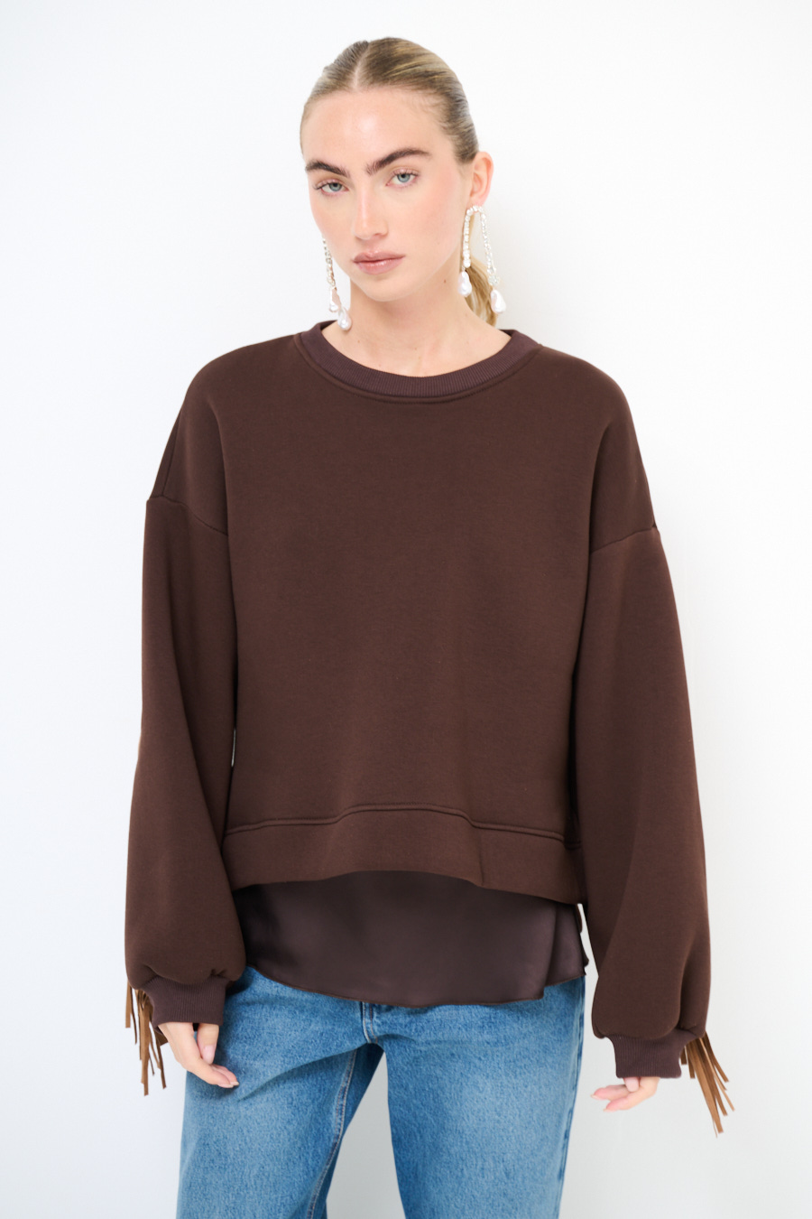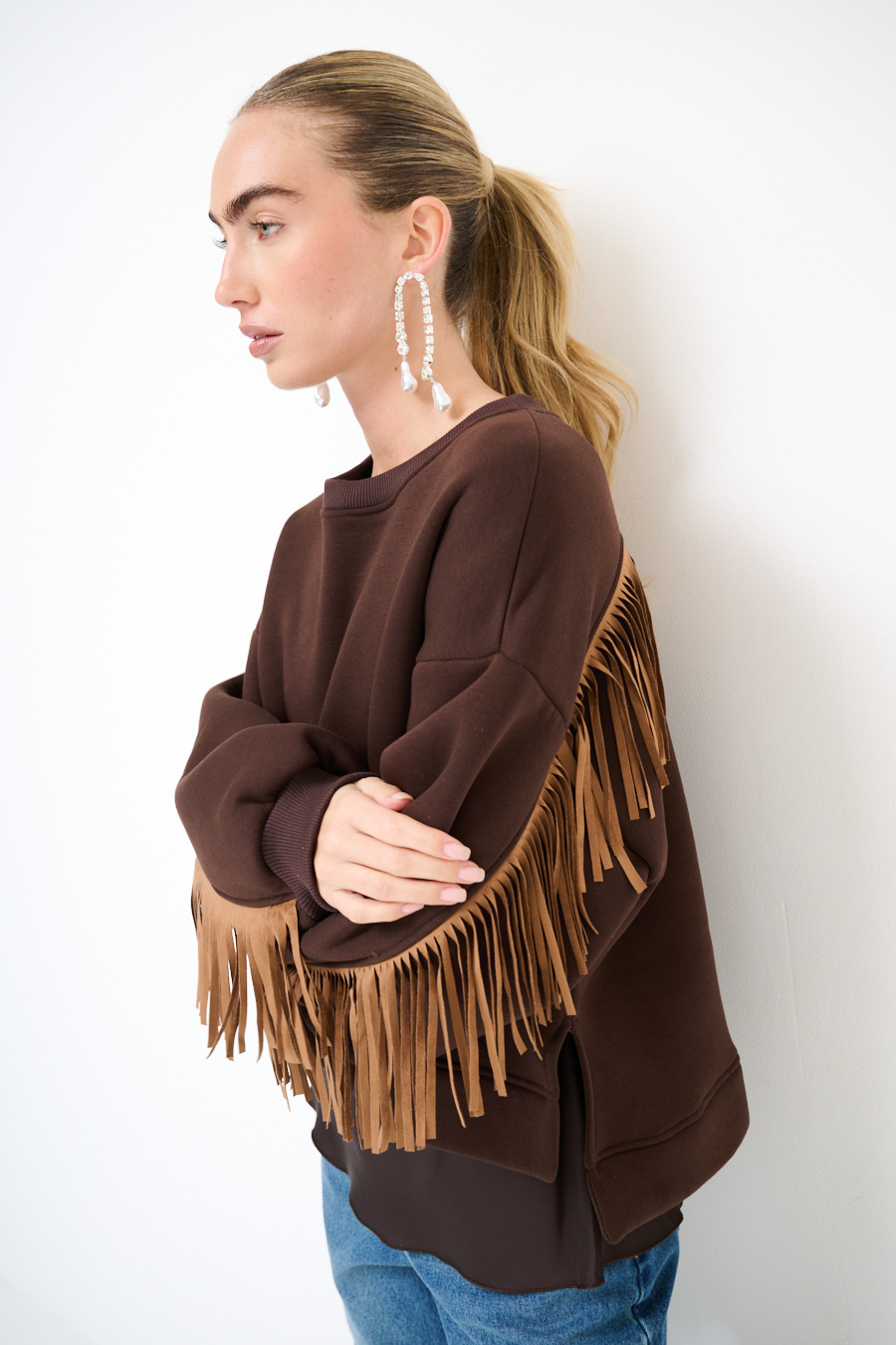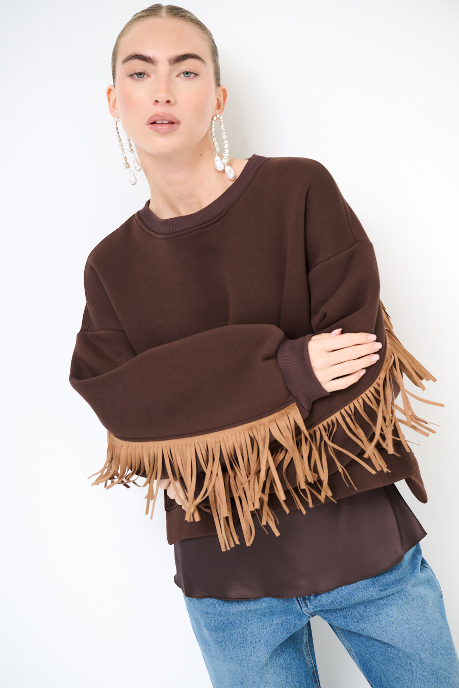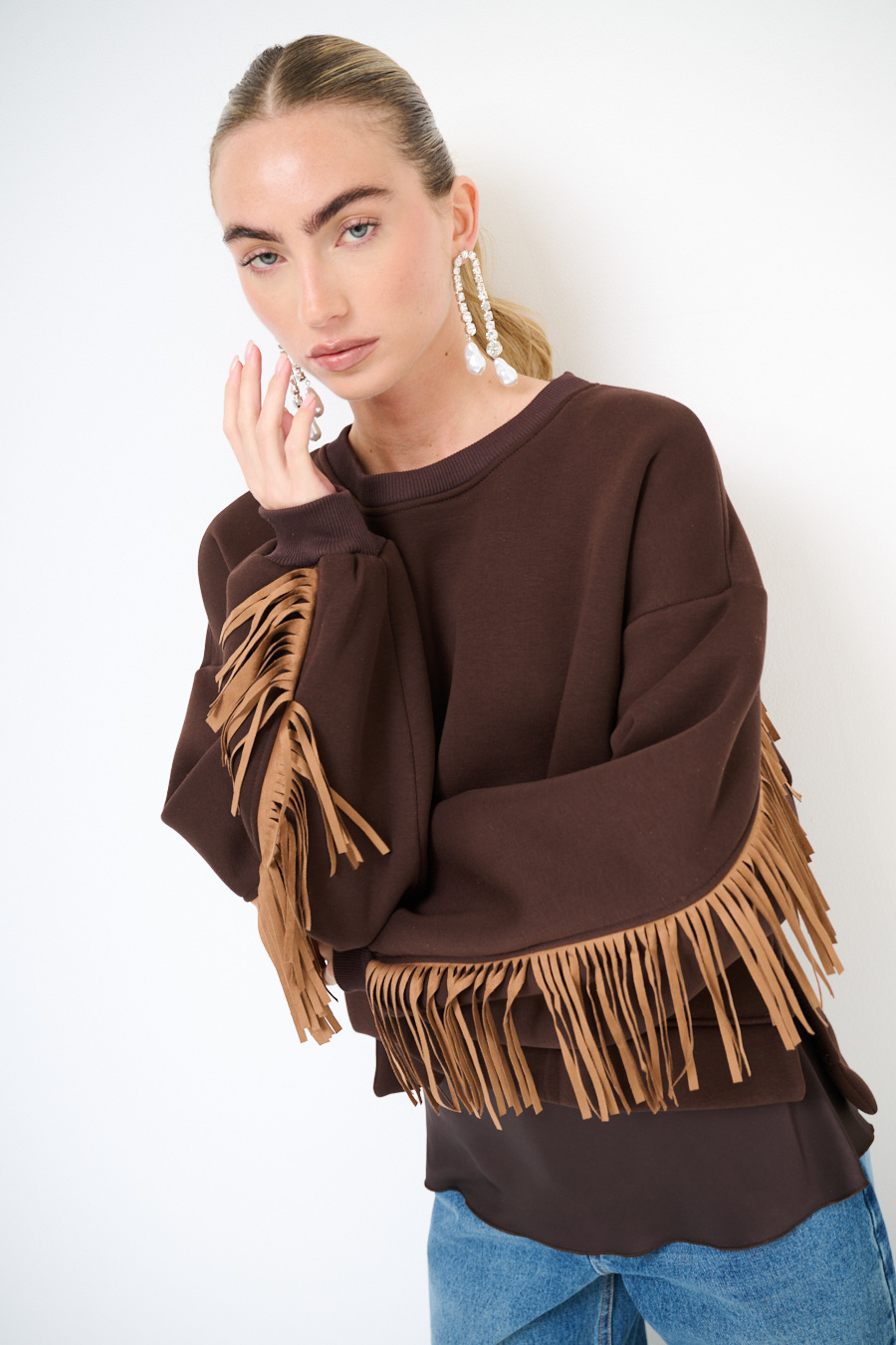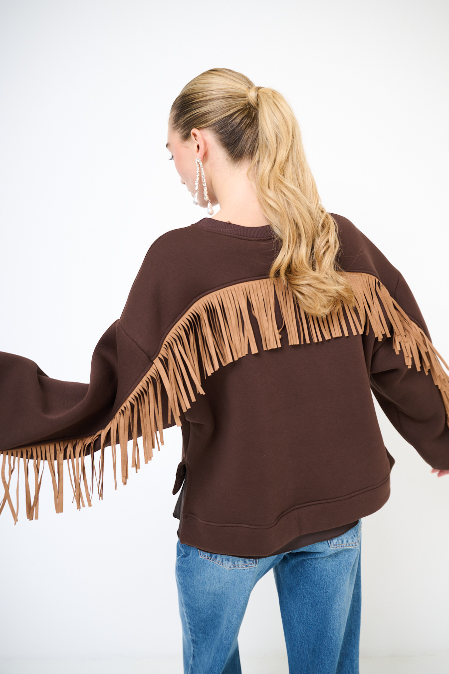 Felpa girocollo warm felpata internamente con frange in dainetto sul retro schiena e manica.