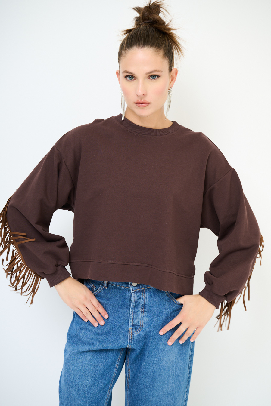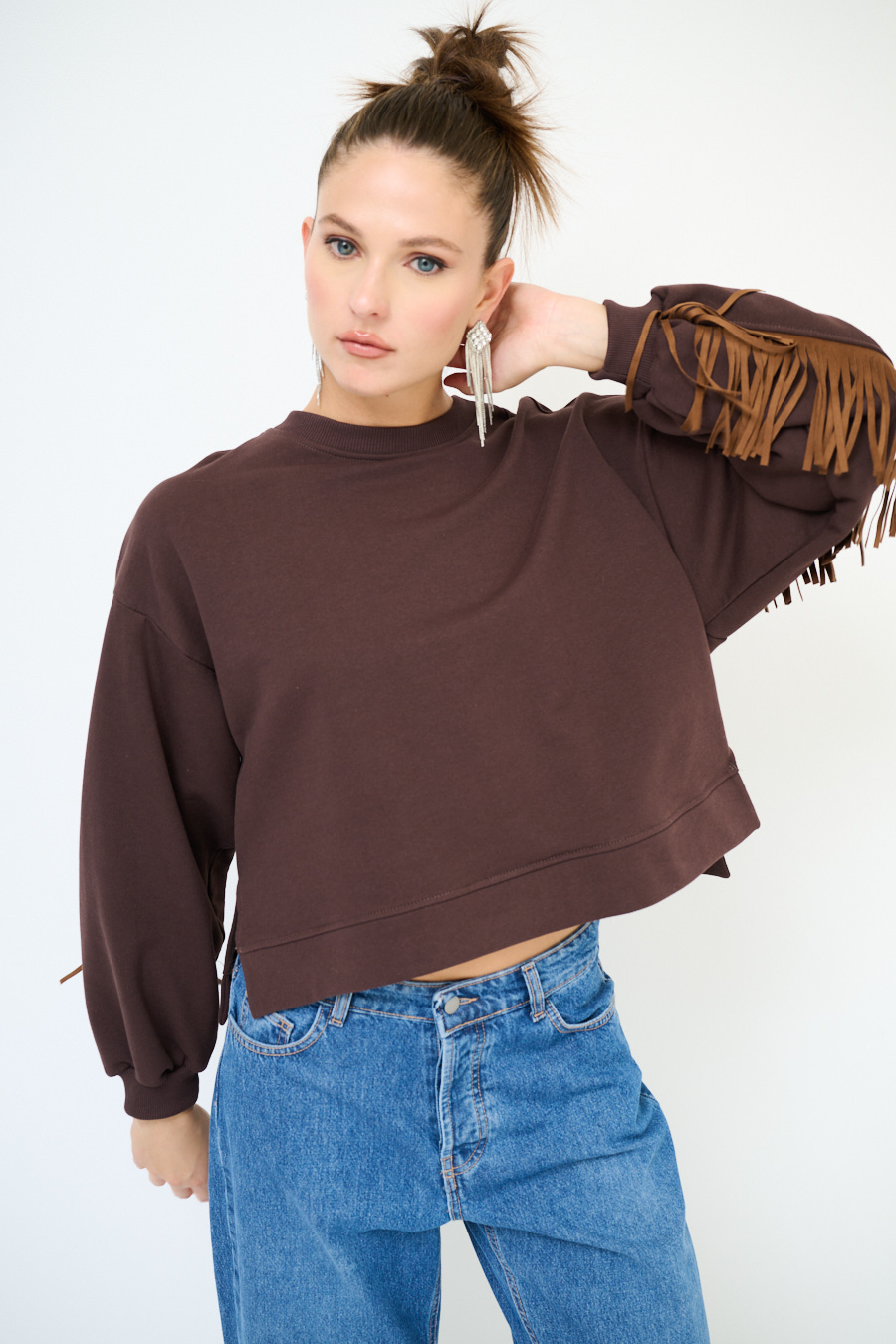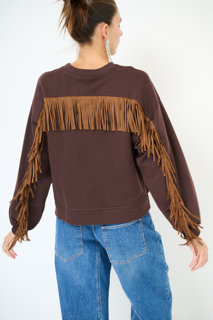 Felpa garzata oversize a girocollo con frange sul retro e sulle maniche in eco dainetto.