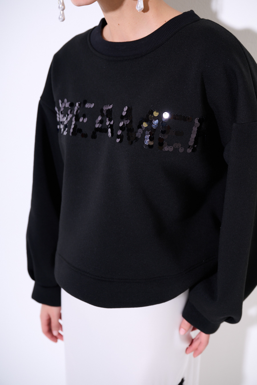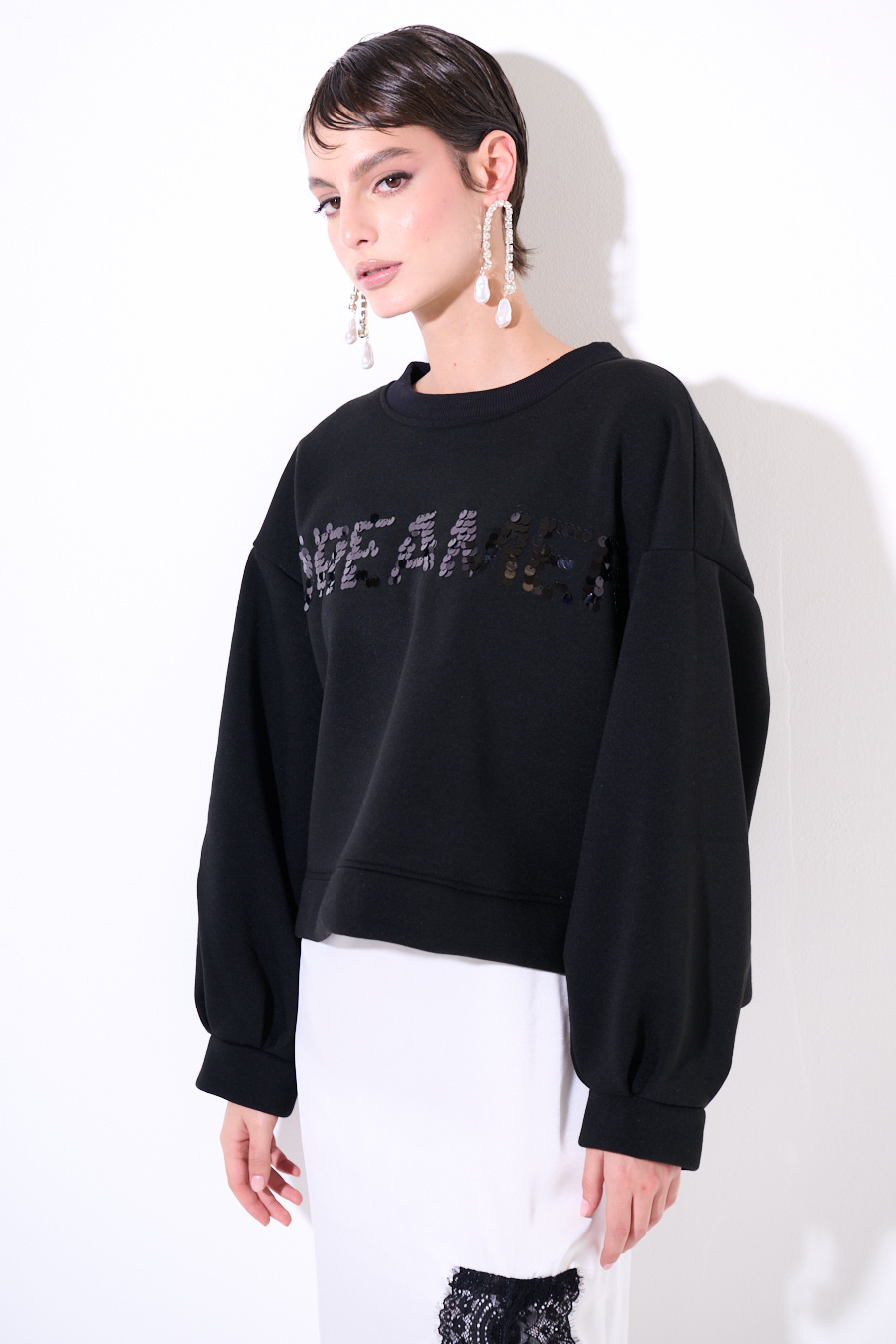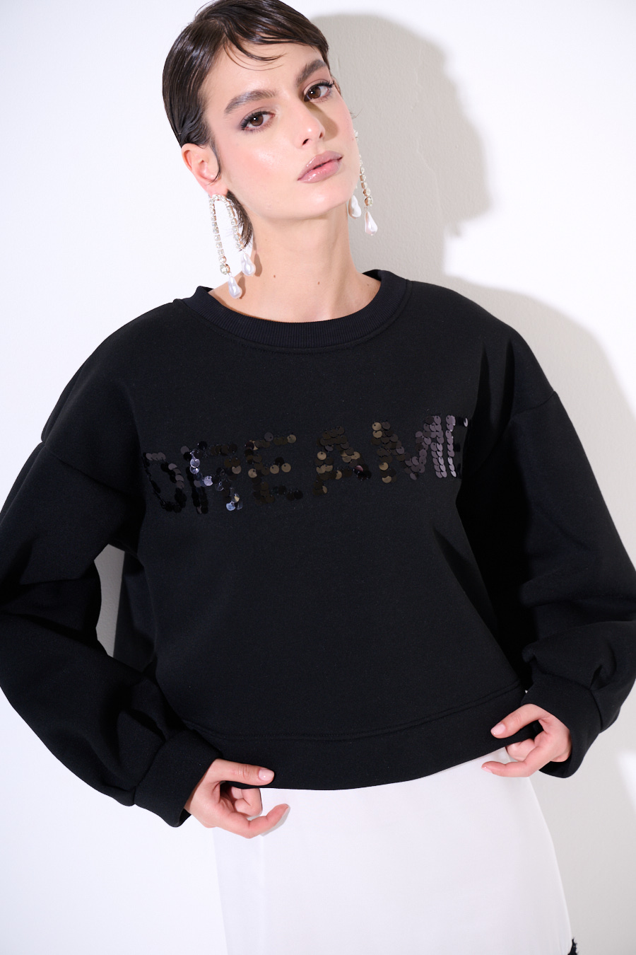 FELPA GARZATA CON SPACCHI SCRITTA PAILLETTES NERO