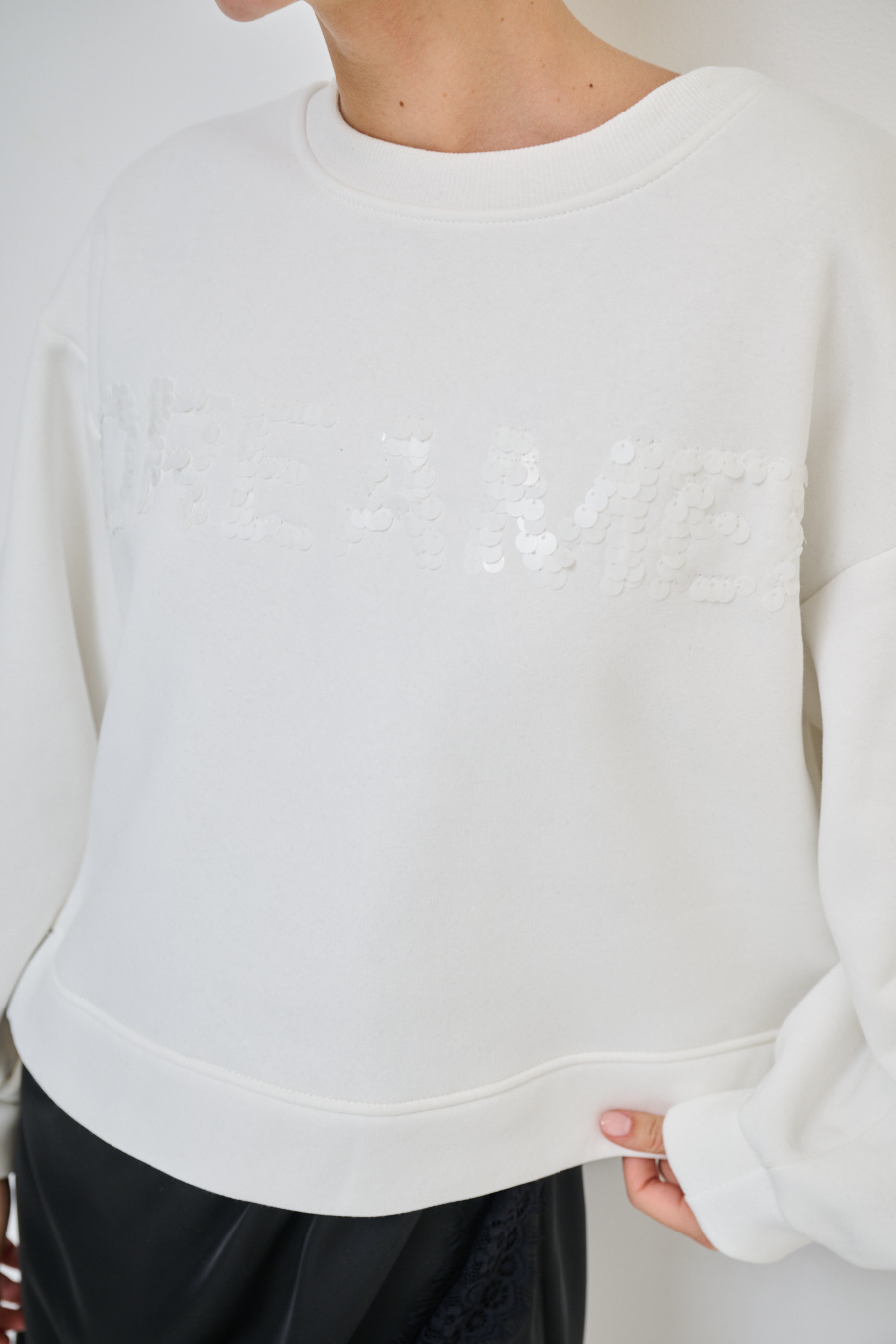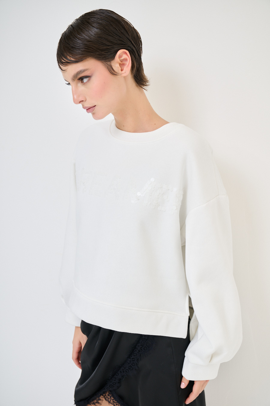 FELPA GARZATA CON SPACCHI SCRITTA PAILLETTES PANNA