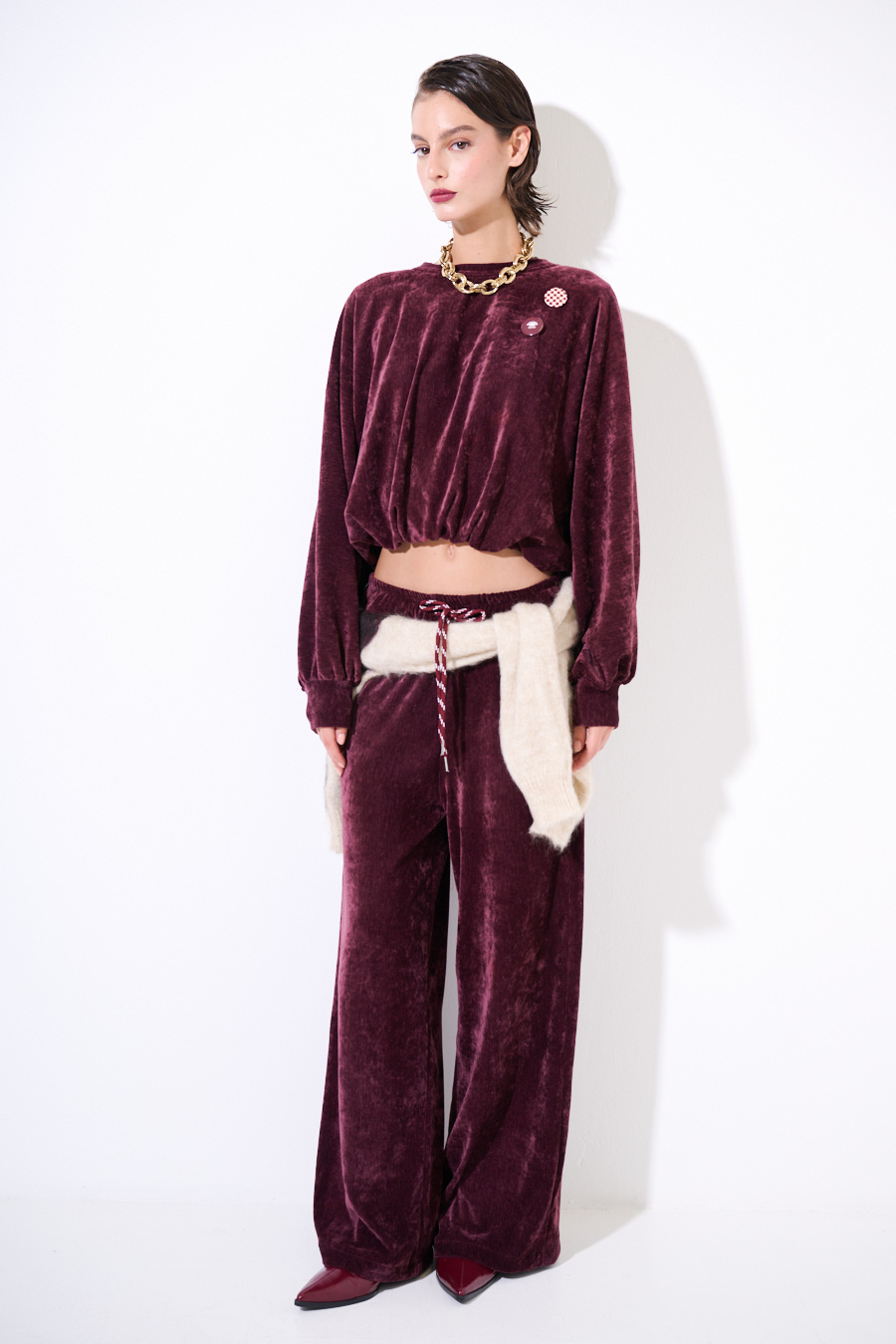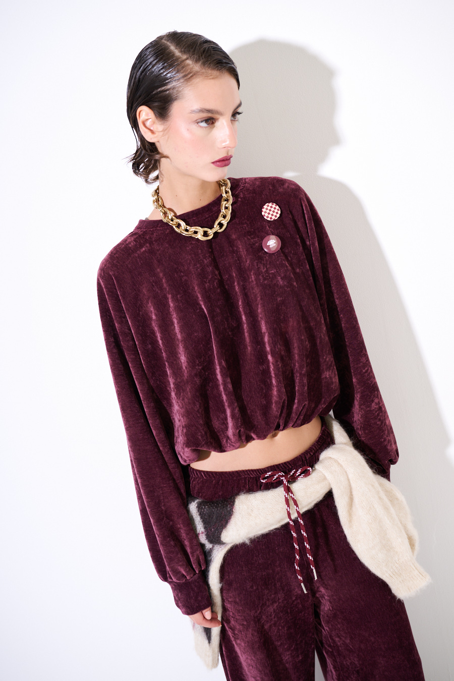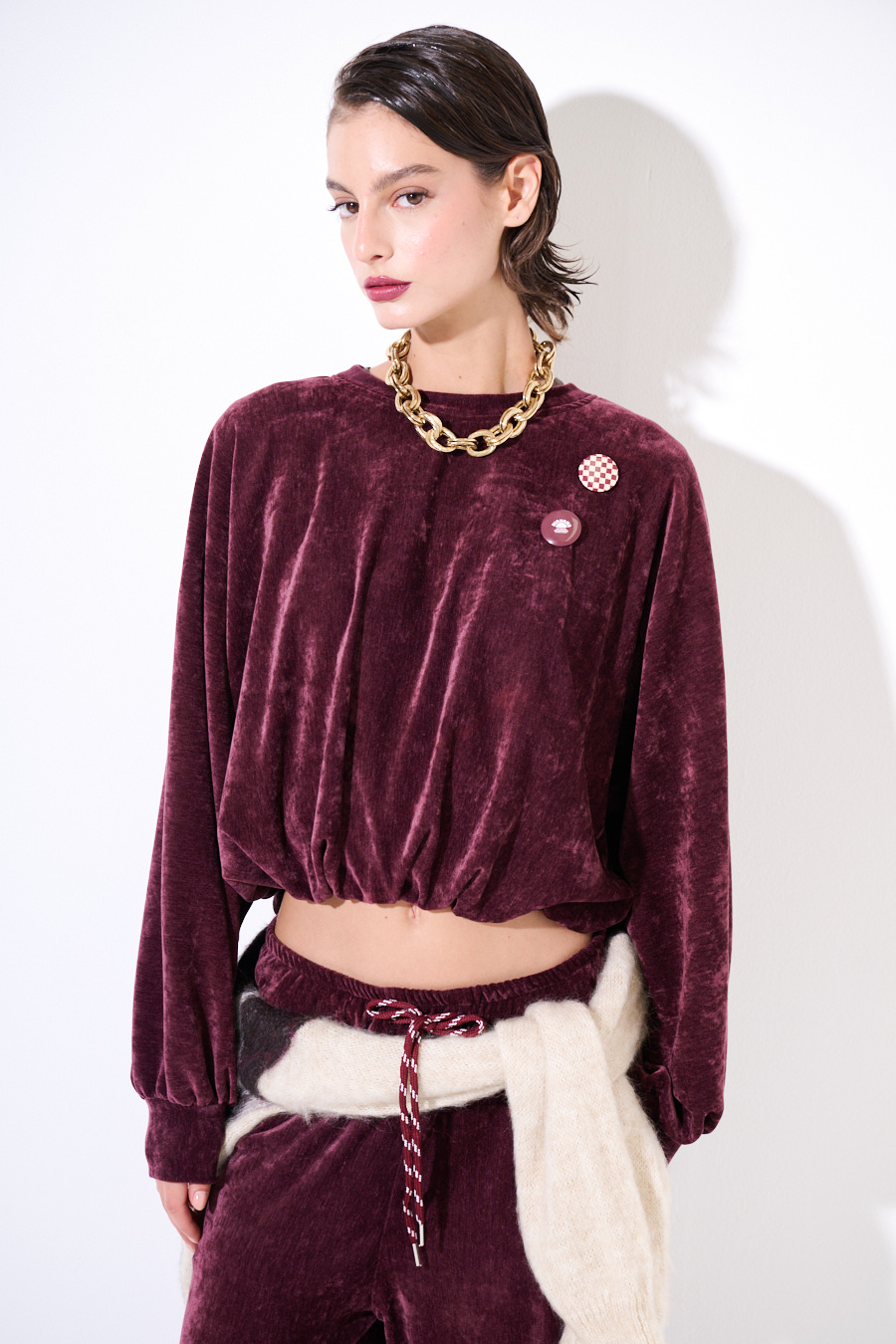 Felpa oversize crop in velluto a girocollo con elastico sul fondo e applicazioni spille sul fronte.