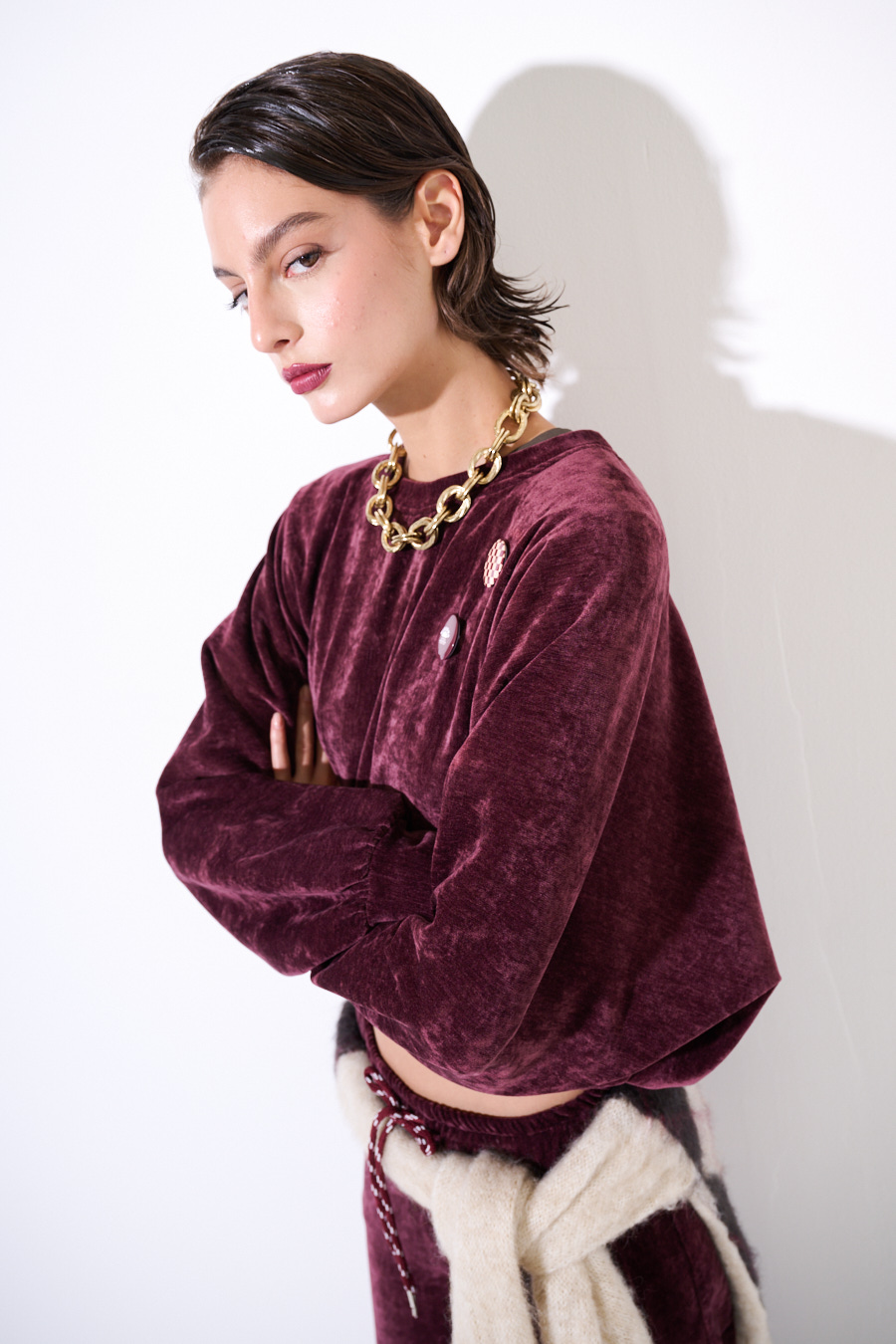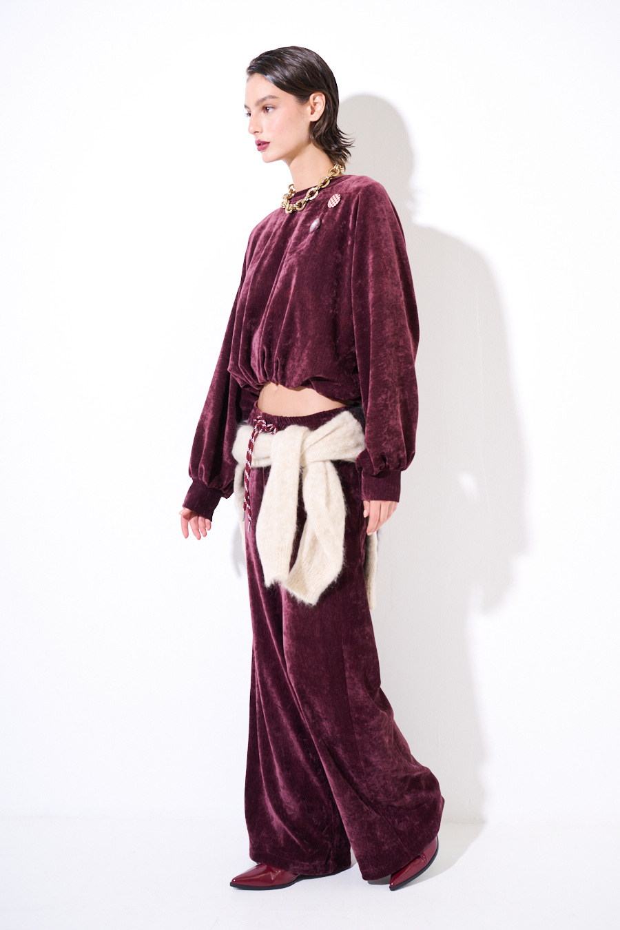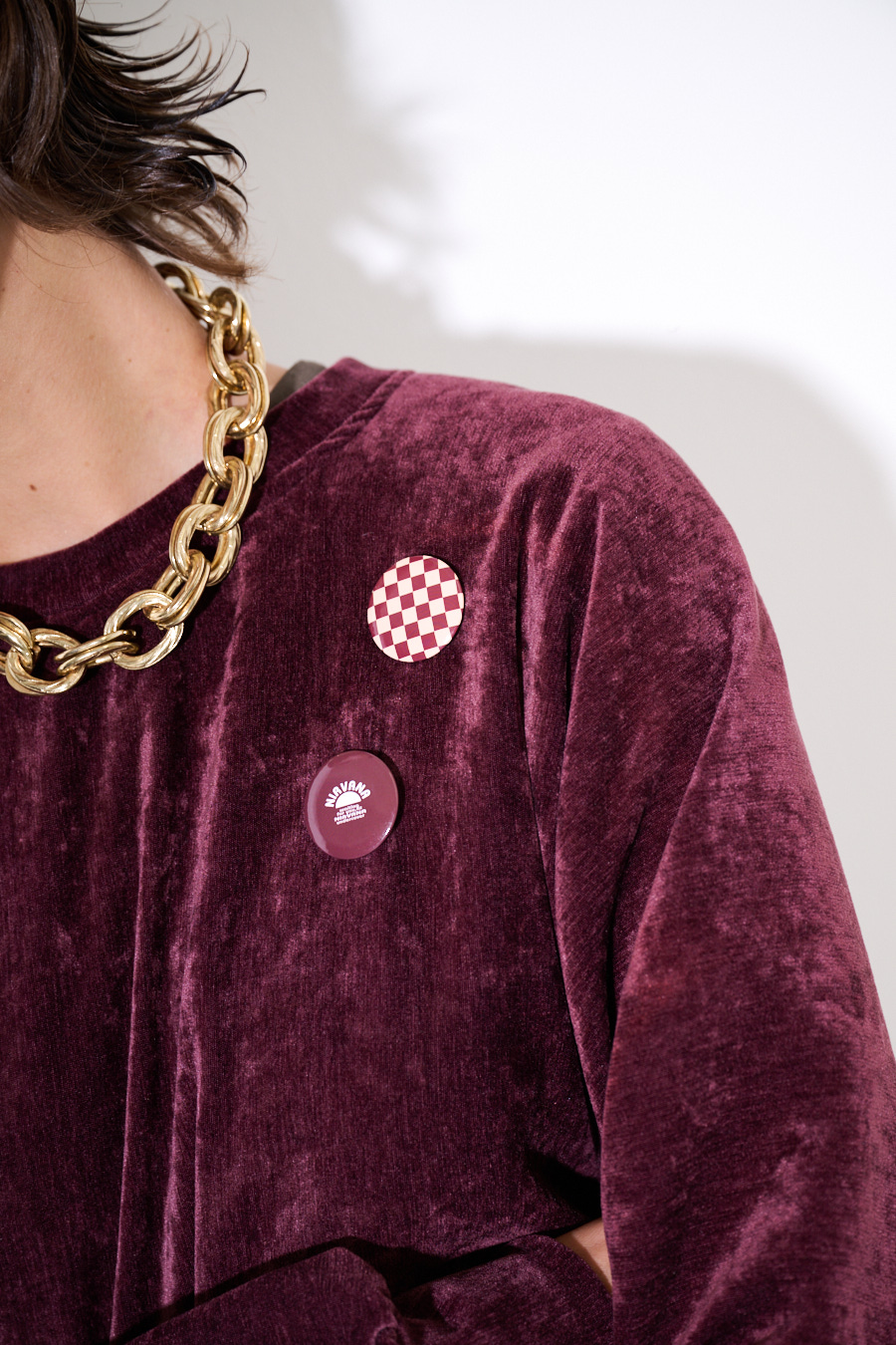 Felpa oversize crop in velluto a girocollo con elastico sul fondo e applicazioni spille sul fronte.