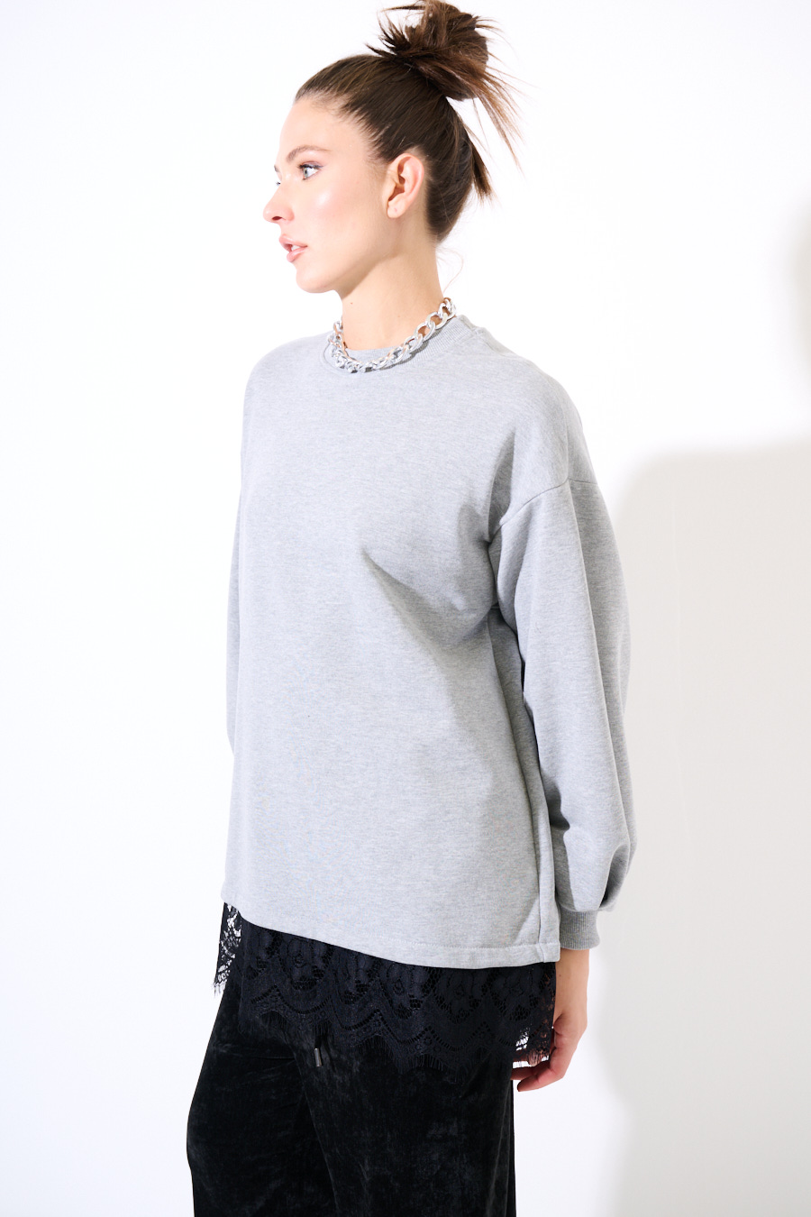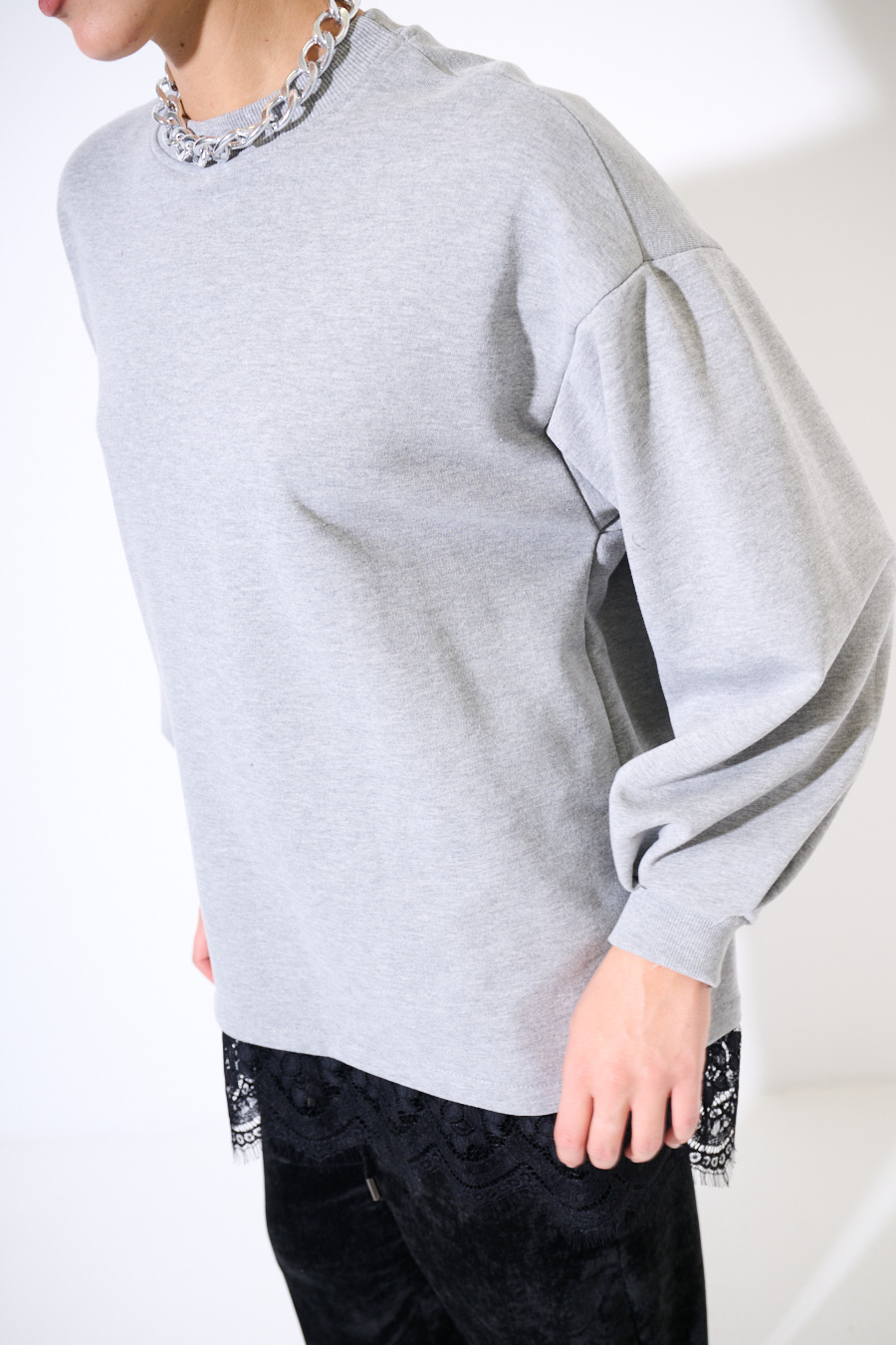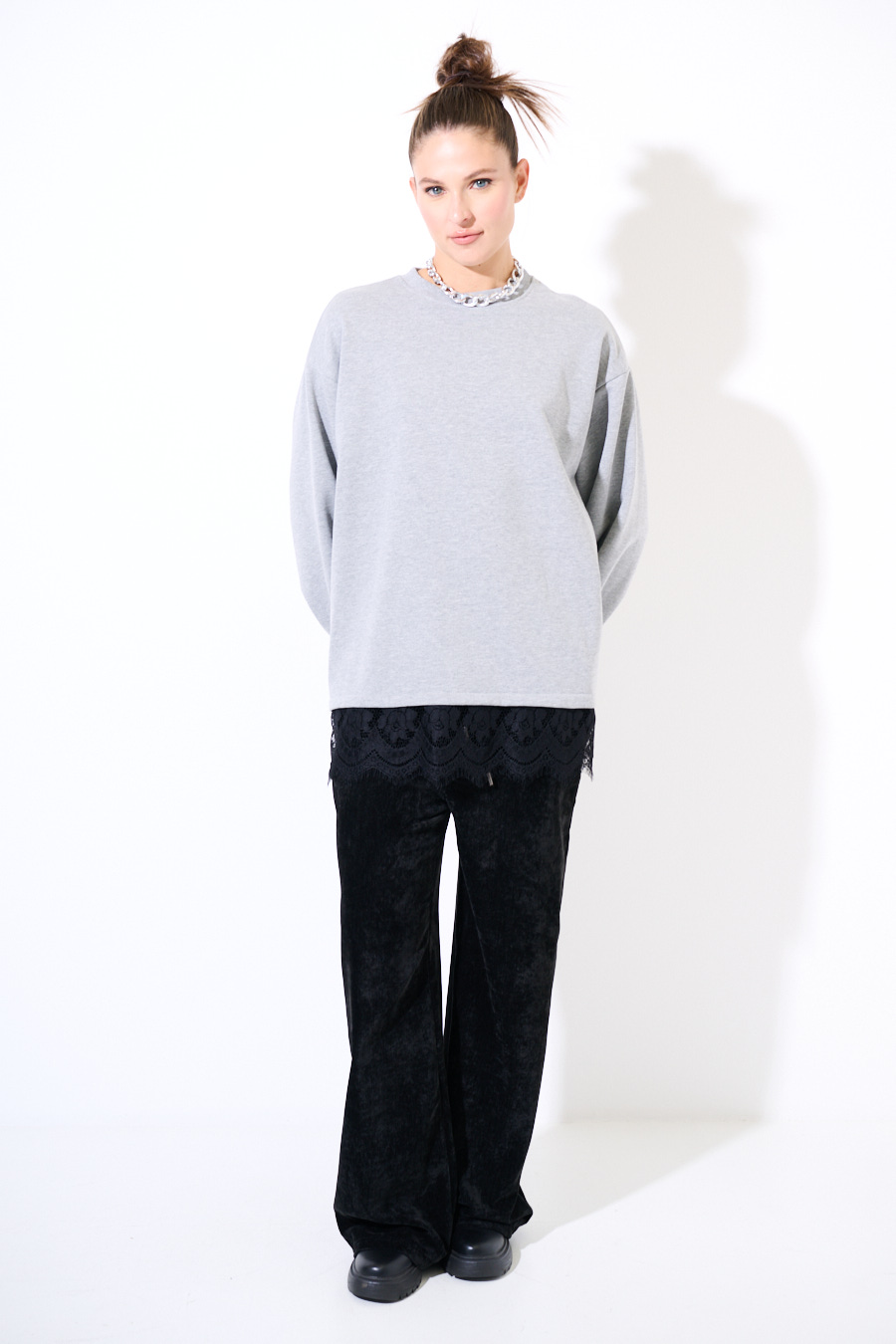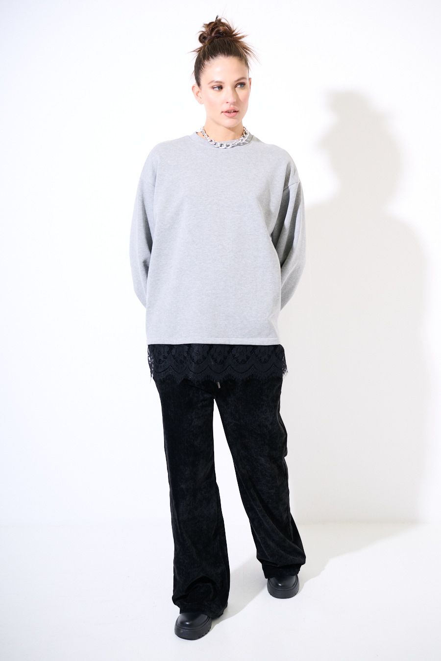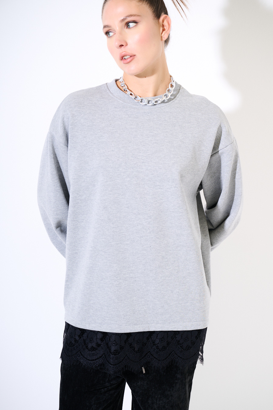 Felpa lunga oversize garzata a girocollo con inserto in pizzo sul fondo.