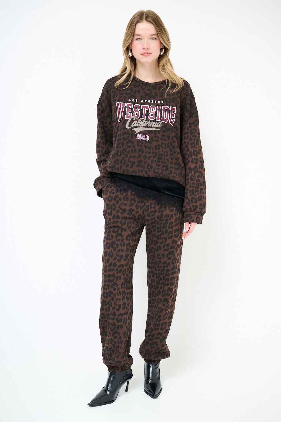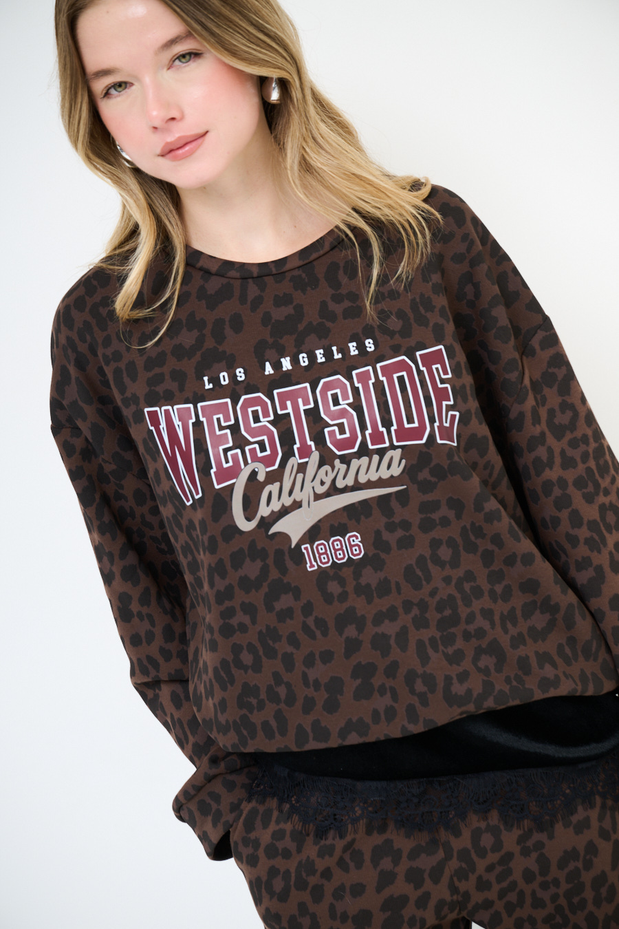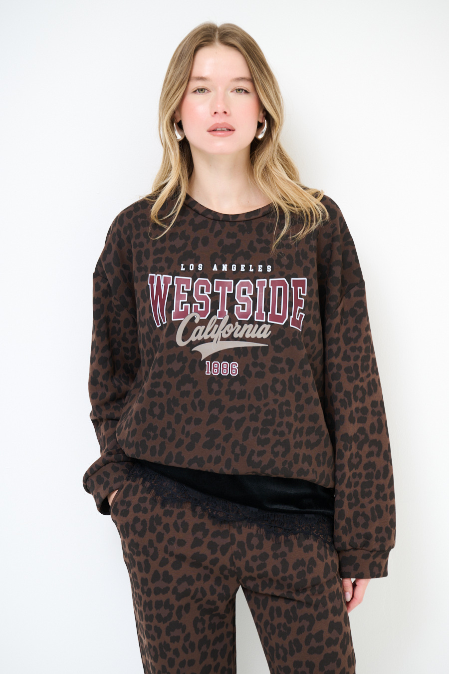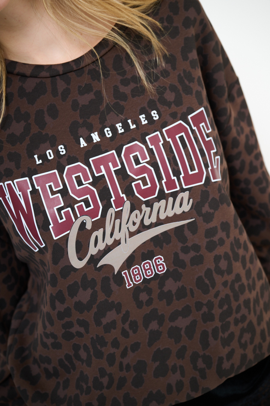 Felpa a ovetto con stampa animalier e Scritta California, felpata internamente.