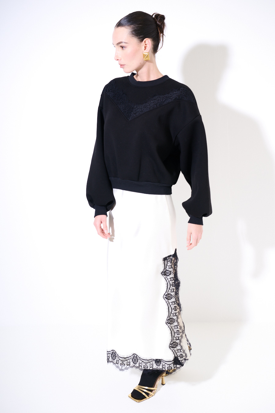 Hoodie paricollo warm, felpata internamente, con inserto in pizzo a v sul davanti e spalla calata.