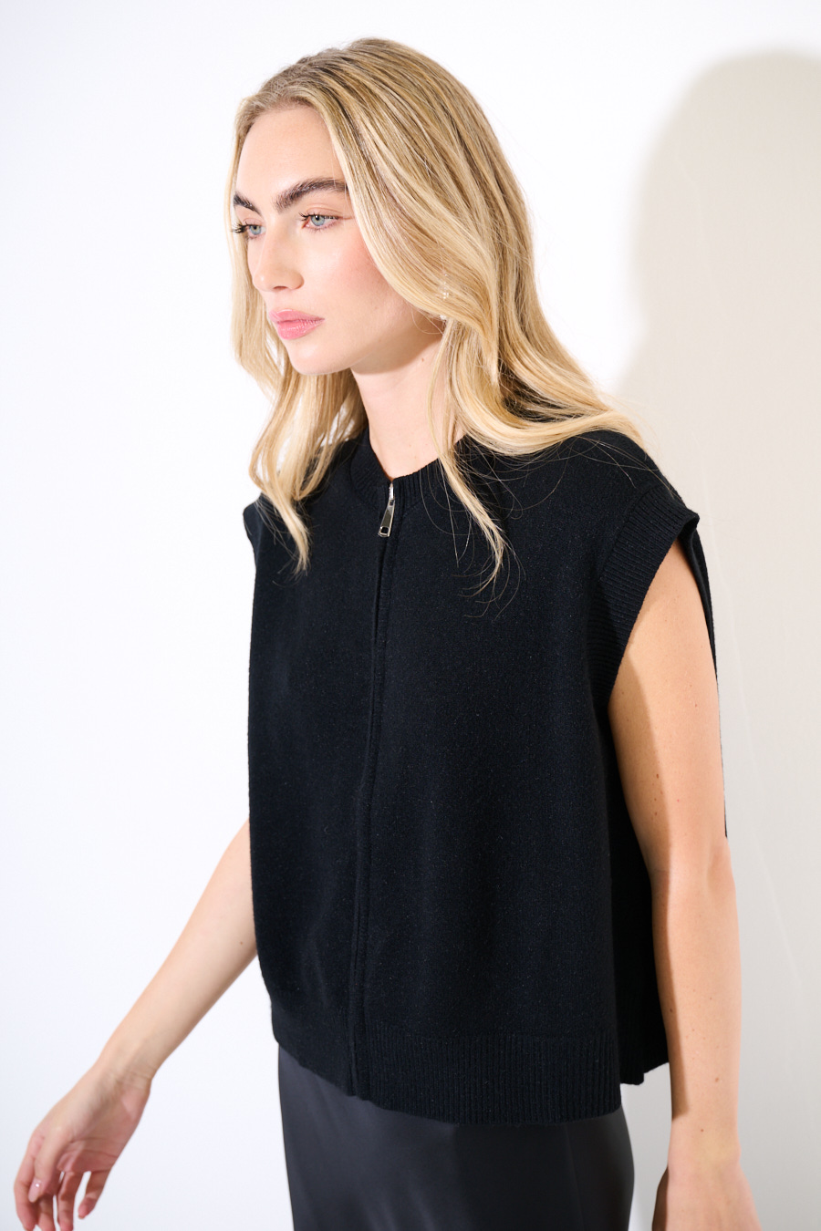 Gilet maglia smanicato con zip di chiusura centrale.