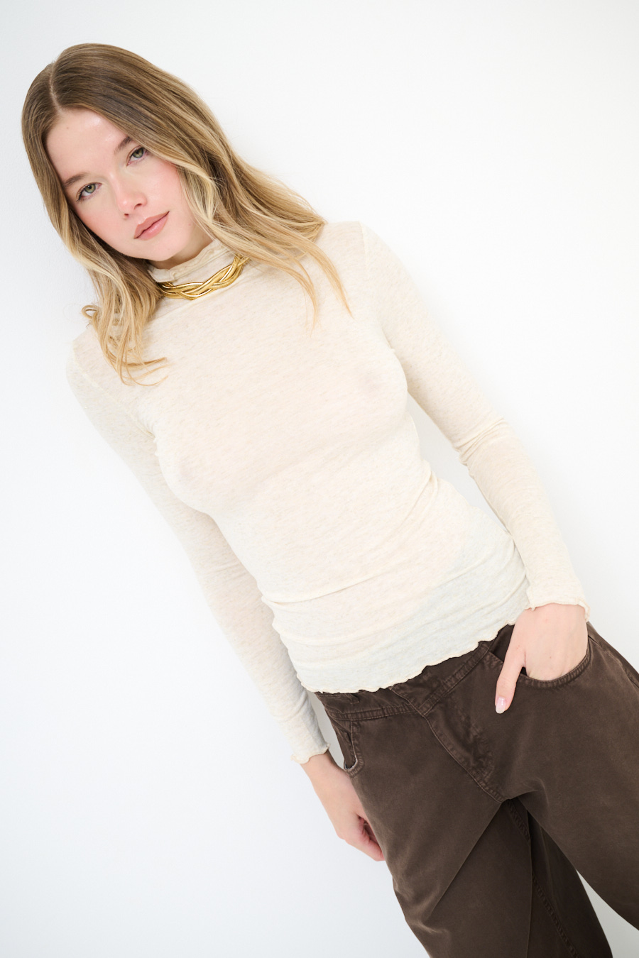 Maglia a collo alto semitrasparente con filo lurex.