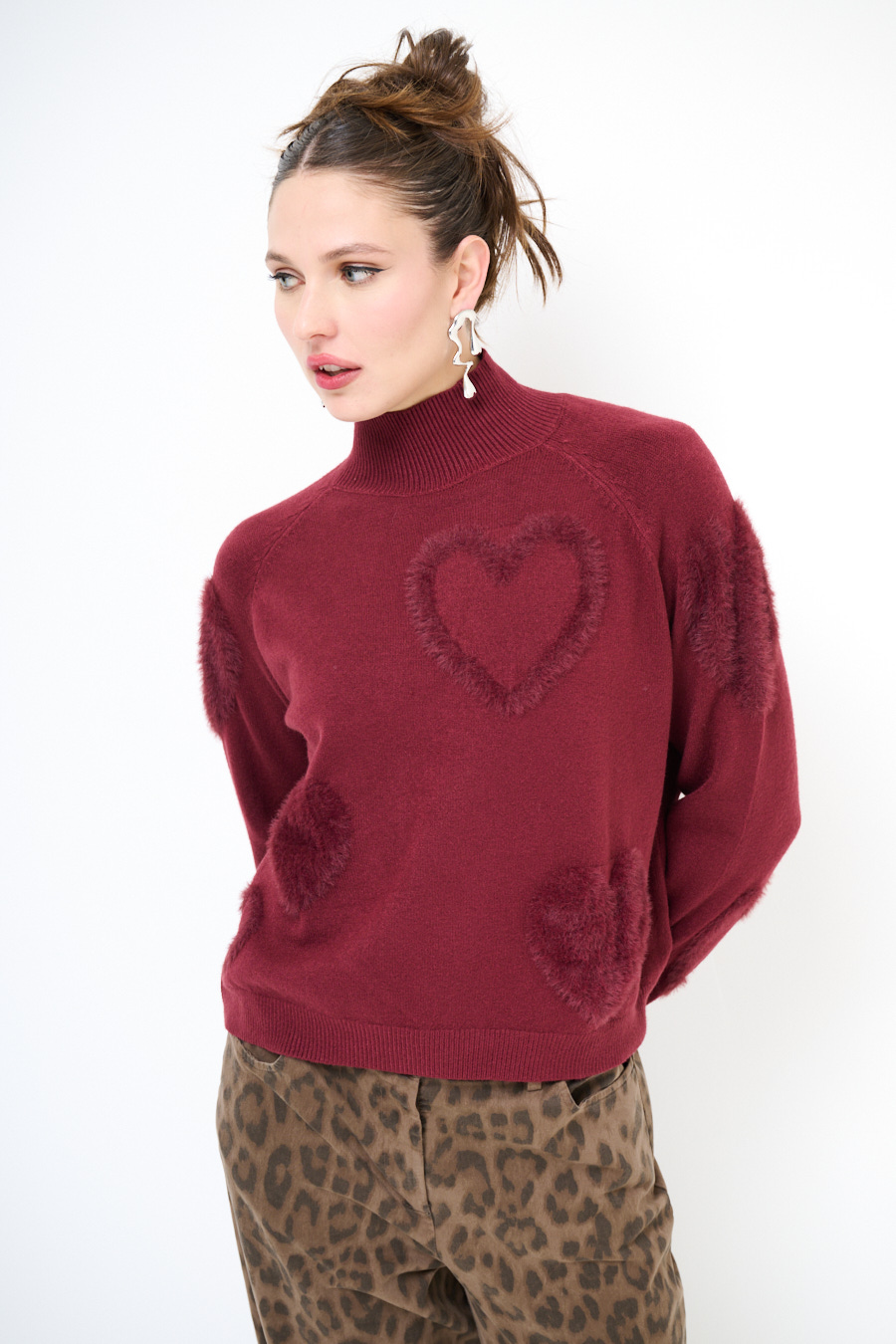 MAGLIA COLLO CRATERE CUORI PELLICCIA VINO
