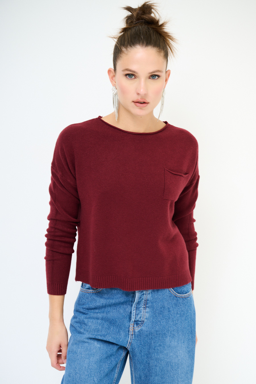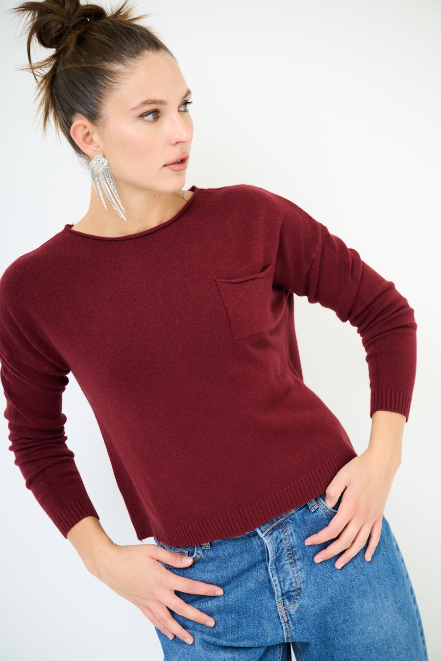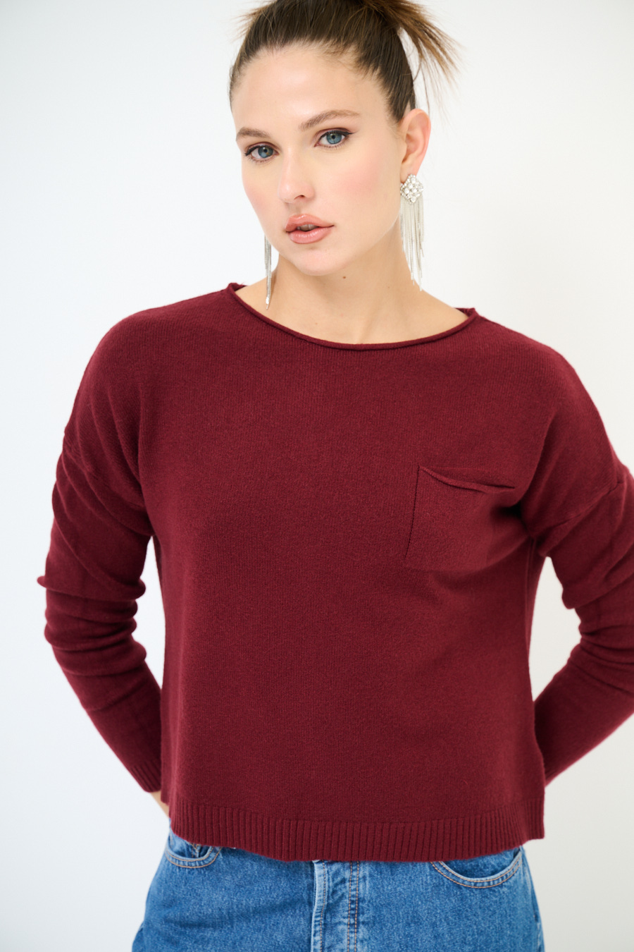 Maglia over con scollo a barca, taschino frontale e spalla calata.