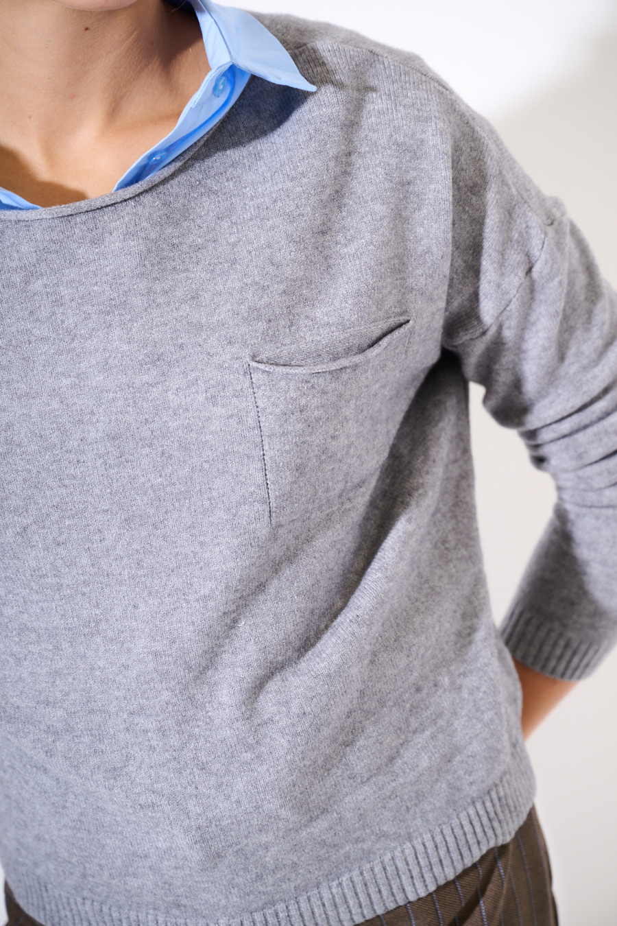 Maglia over con scollo a barca, taschino frontale e spalla calata.
