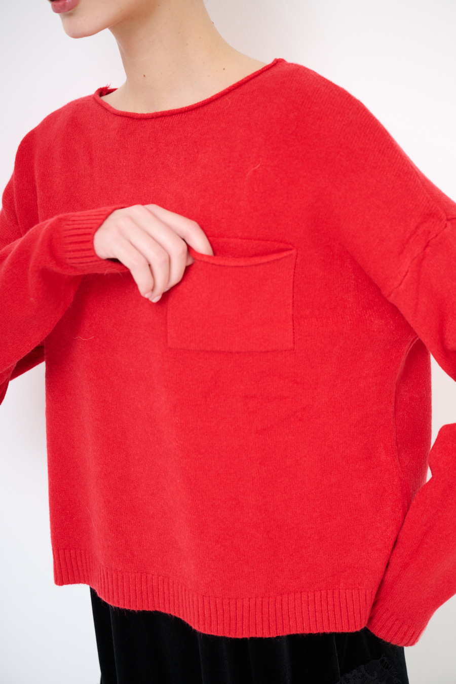 Maglia over con scollo a barca, taschino frontale e spalla calata.