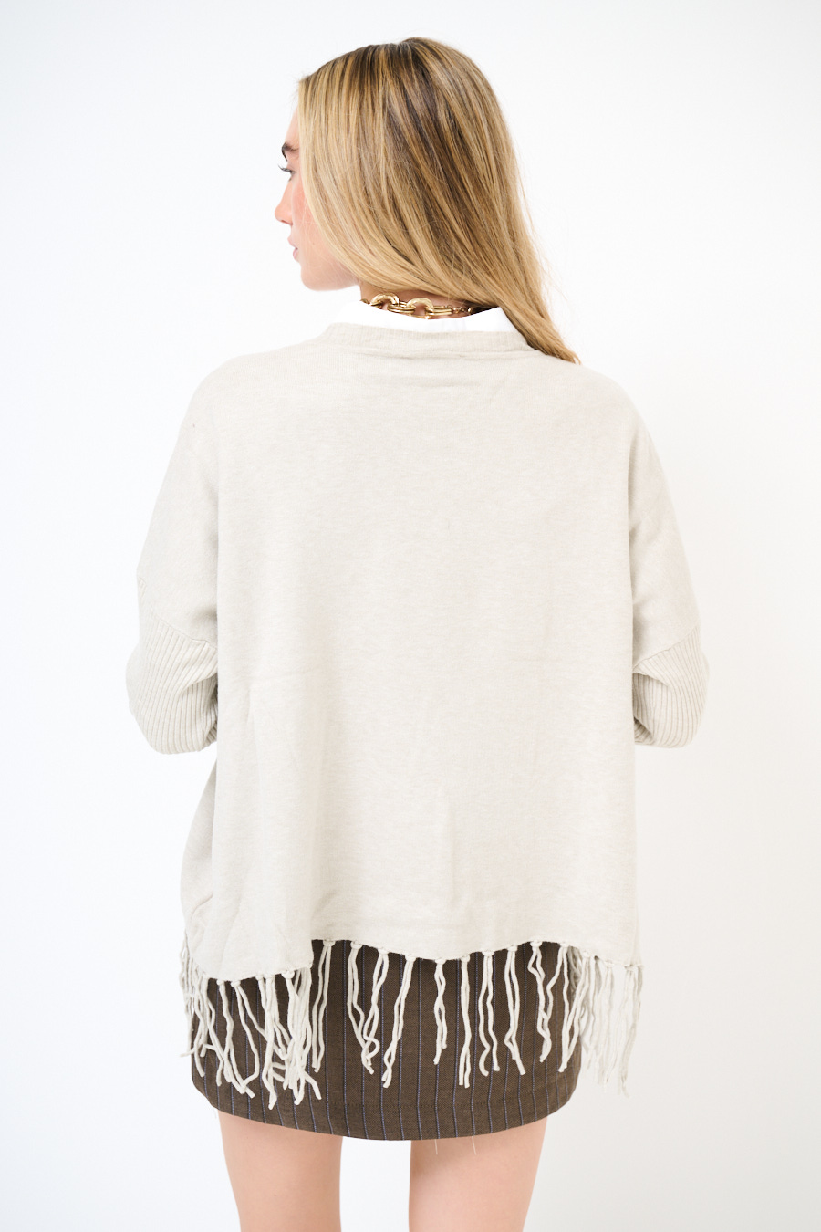 Maglia crop oversize con manica stretta a coste e frange sul fondo.