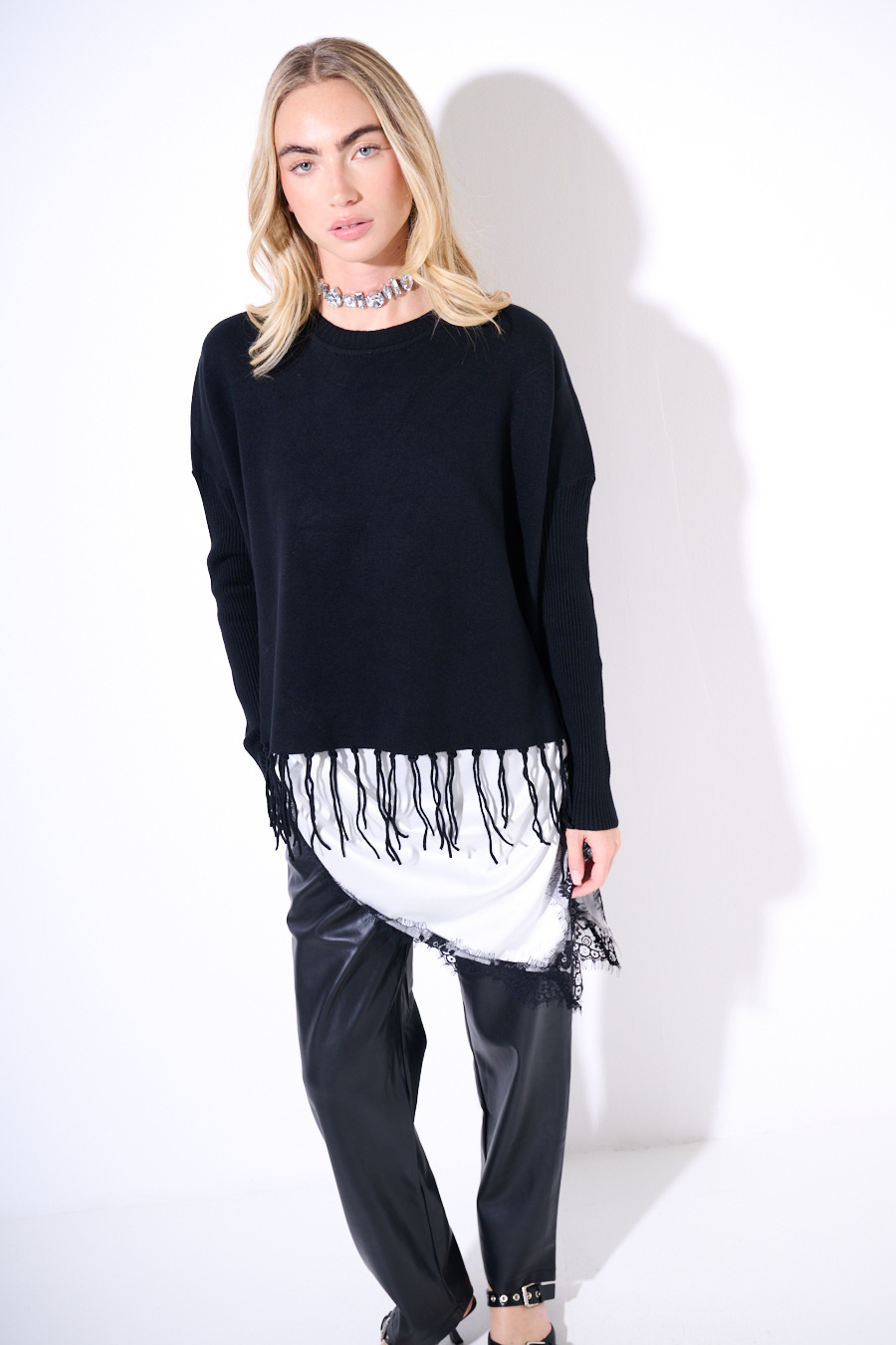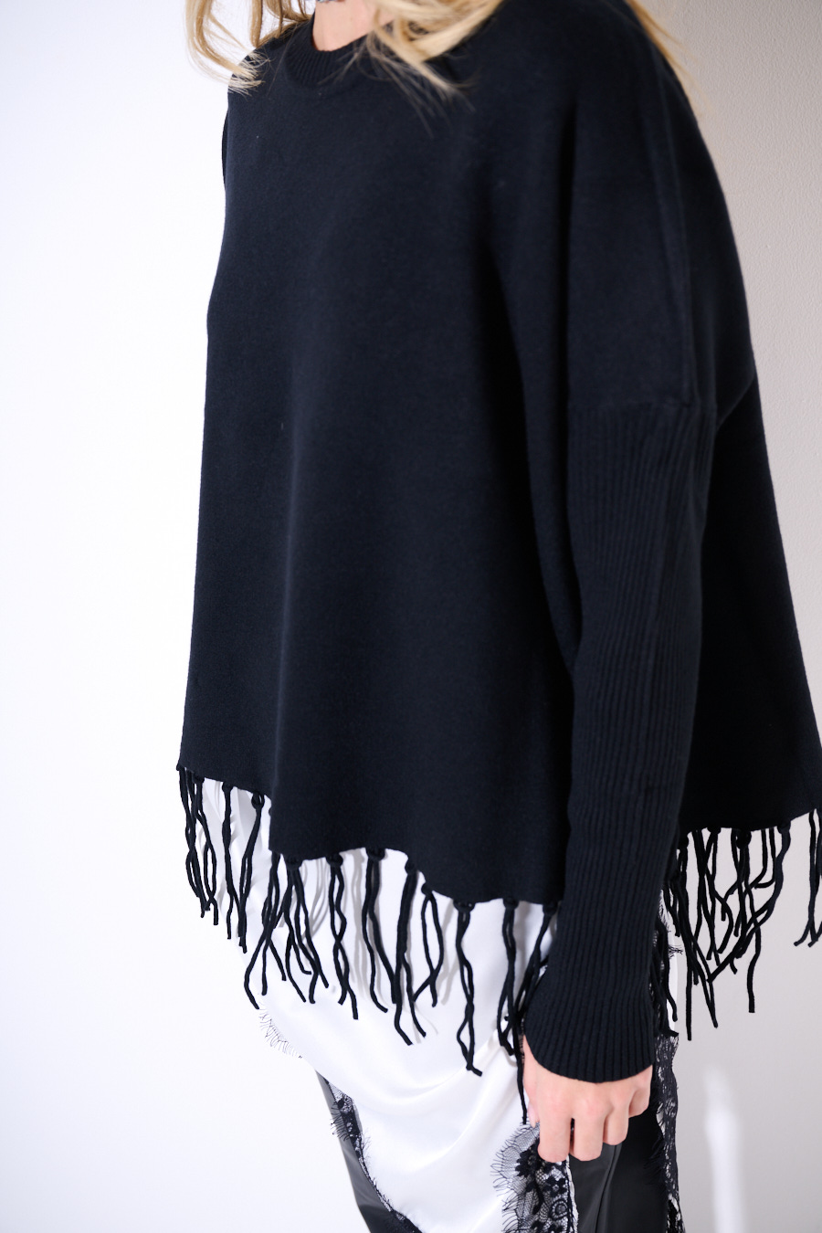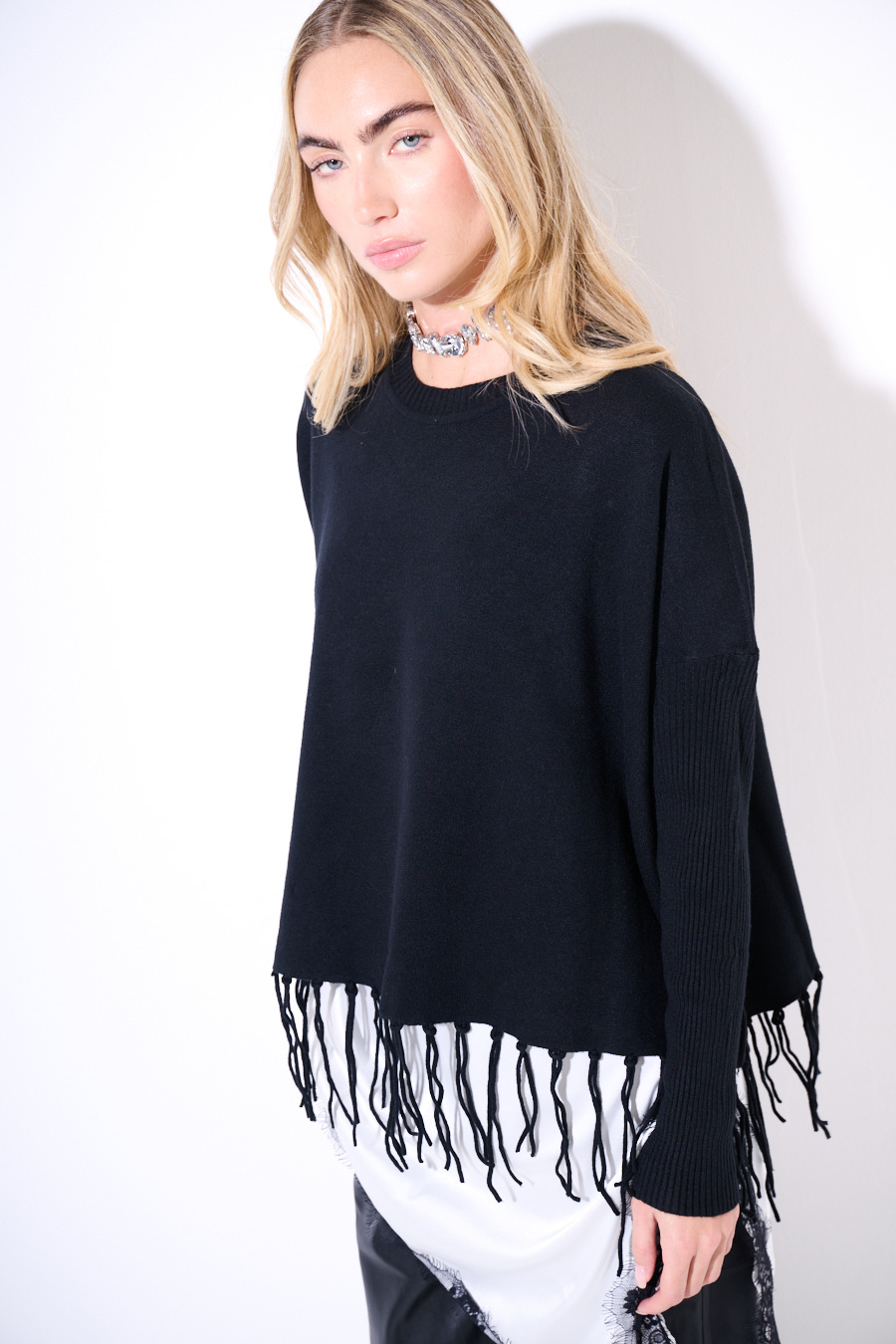 Maglia crop oversize con manica stretta a coste e frange sul fondo.