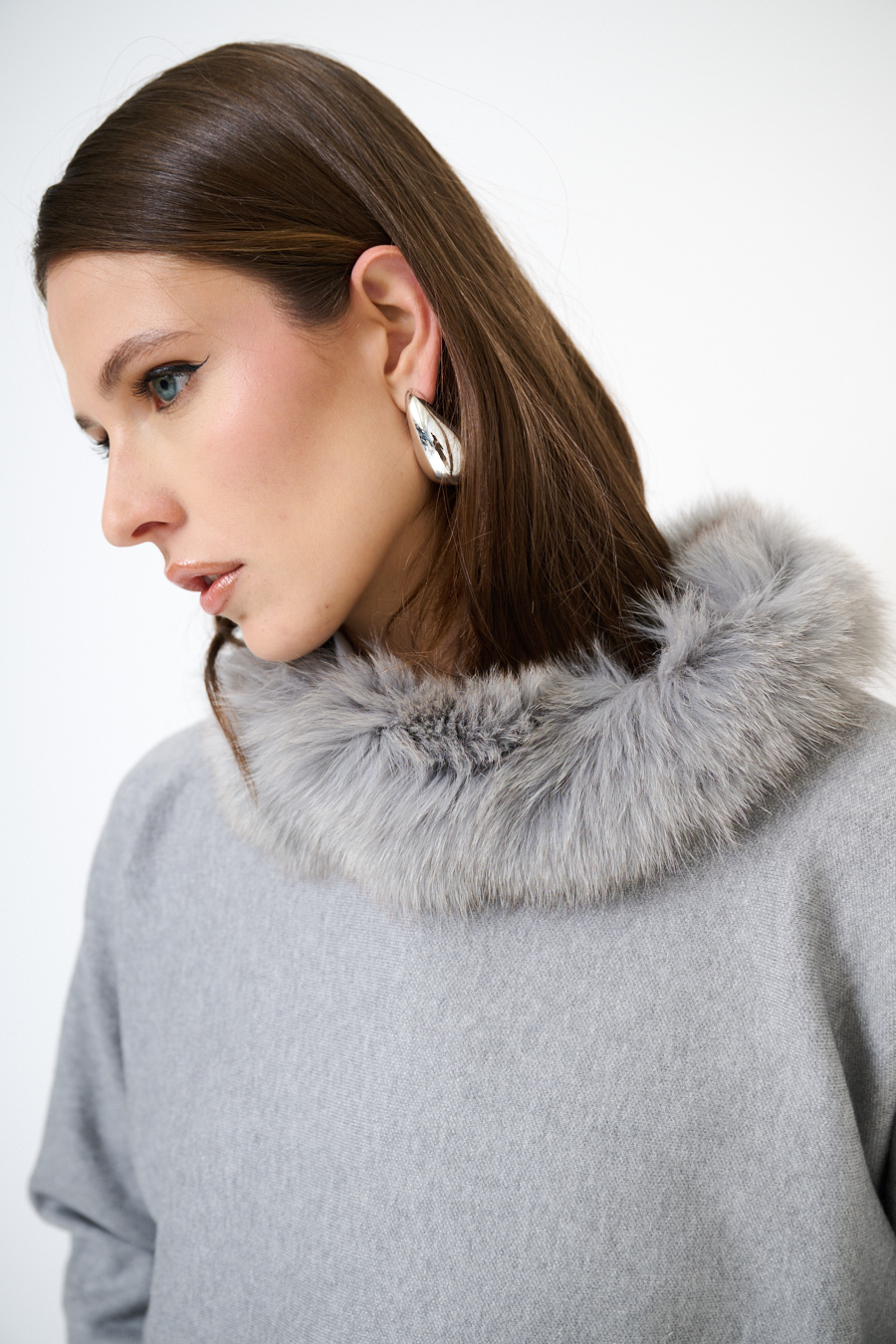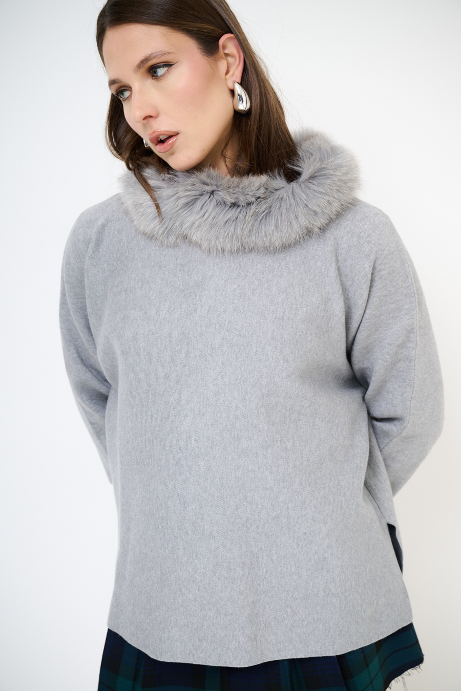 MAGLIA MANTELLA CON COLLO PELLICCIA GRIGIO