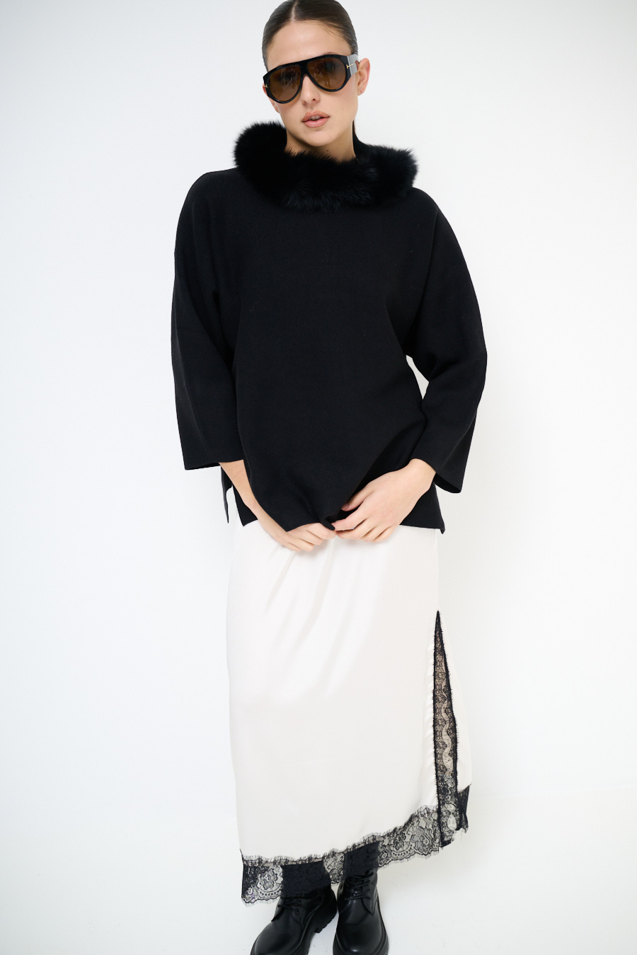 Maglia a mantella ampia con manica a 3/4, spalla calata e collo removibile in pelliccia.