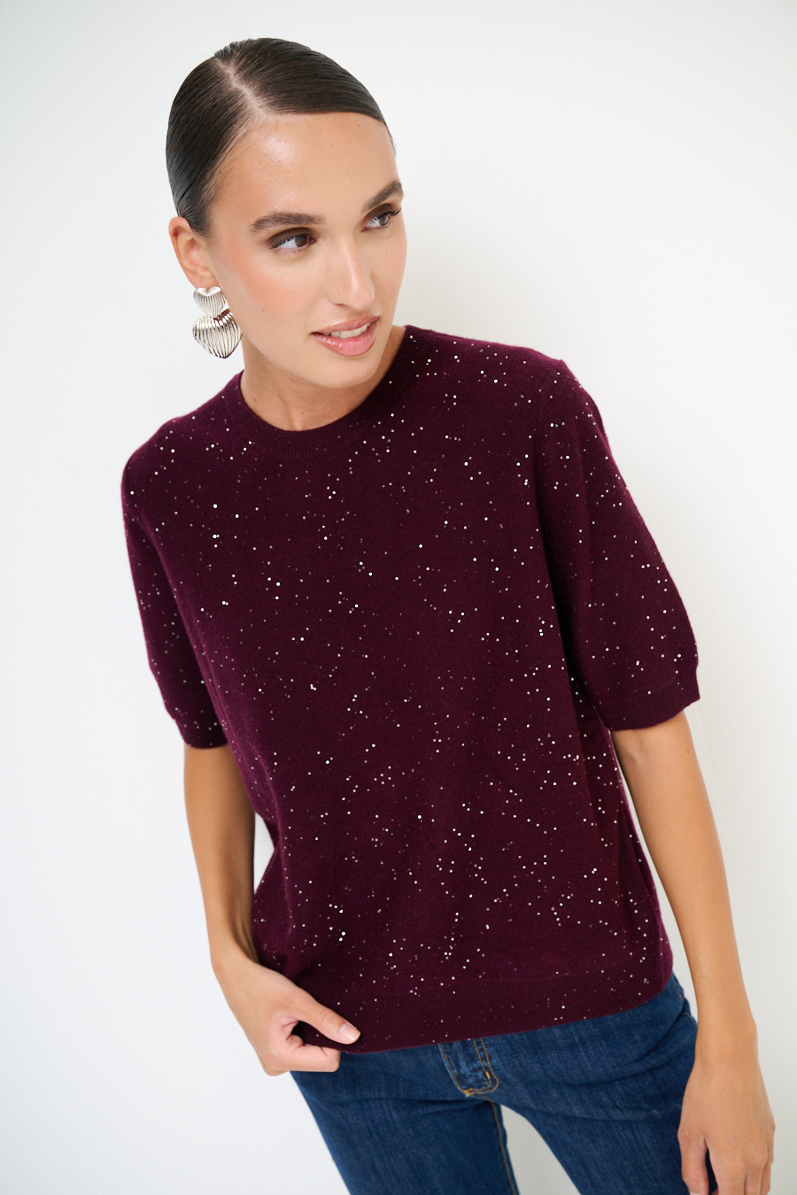 MAGLIA MEZZAMANICA MICROPAILLETTES LANA CACHEMIRE VINO