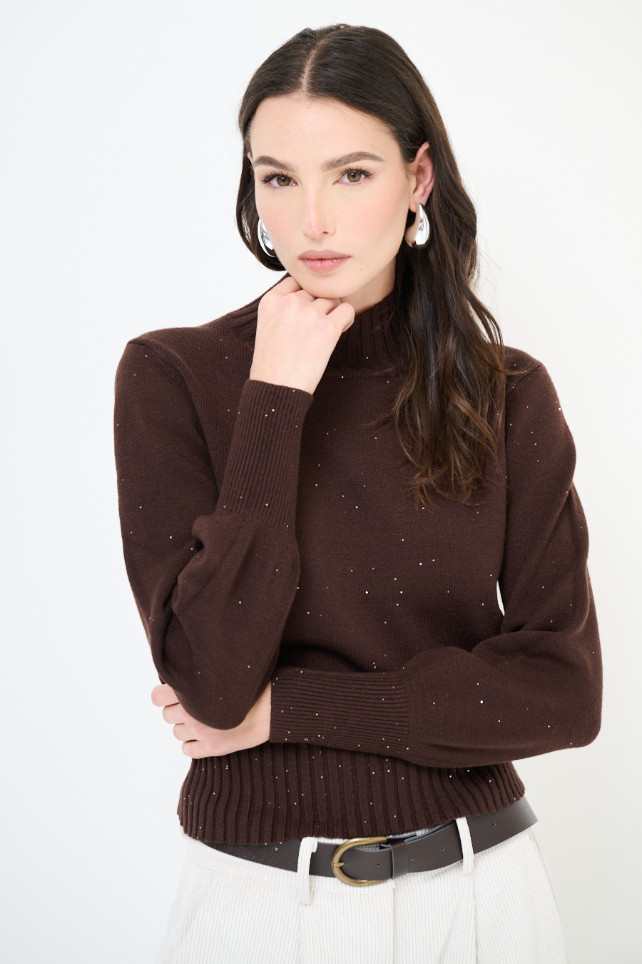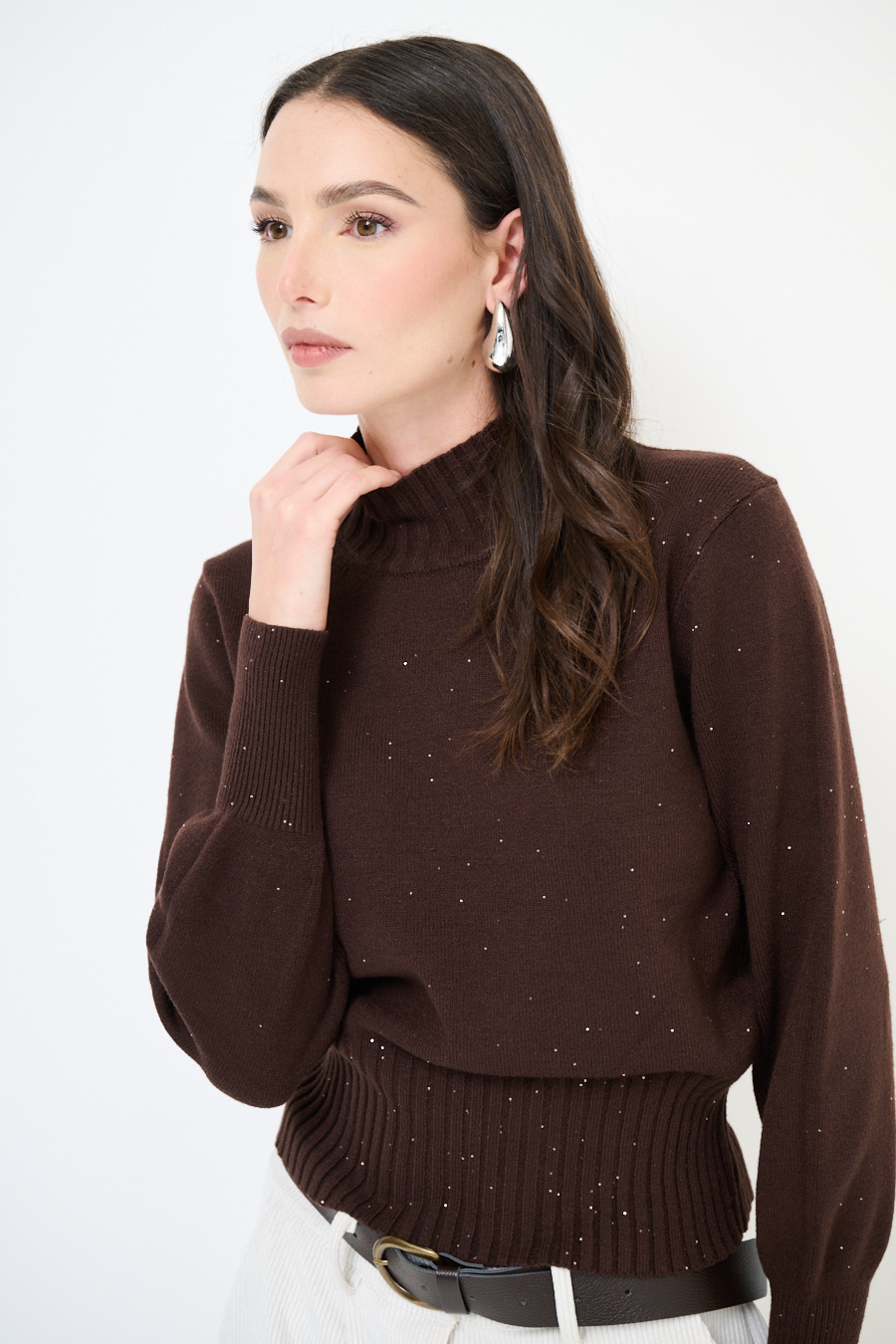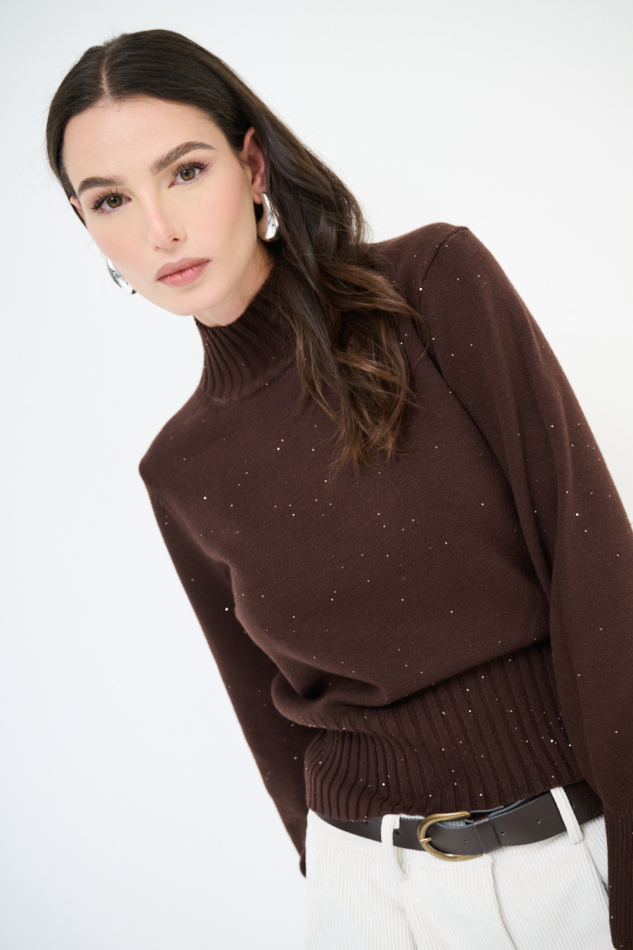 MAGLIA MEZZO COLLO A COSTE MICRO PAILLETTES COFFEE