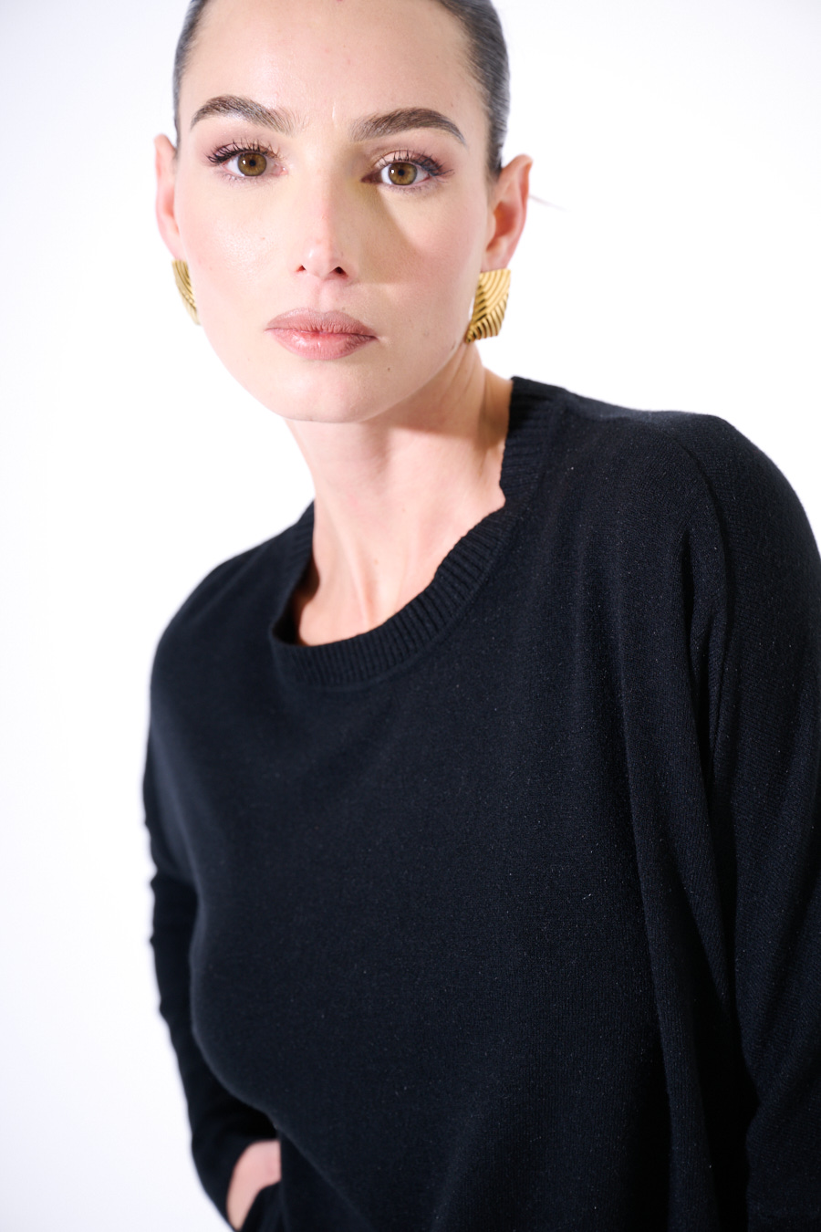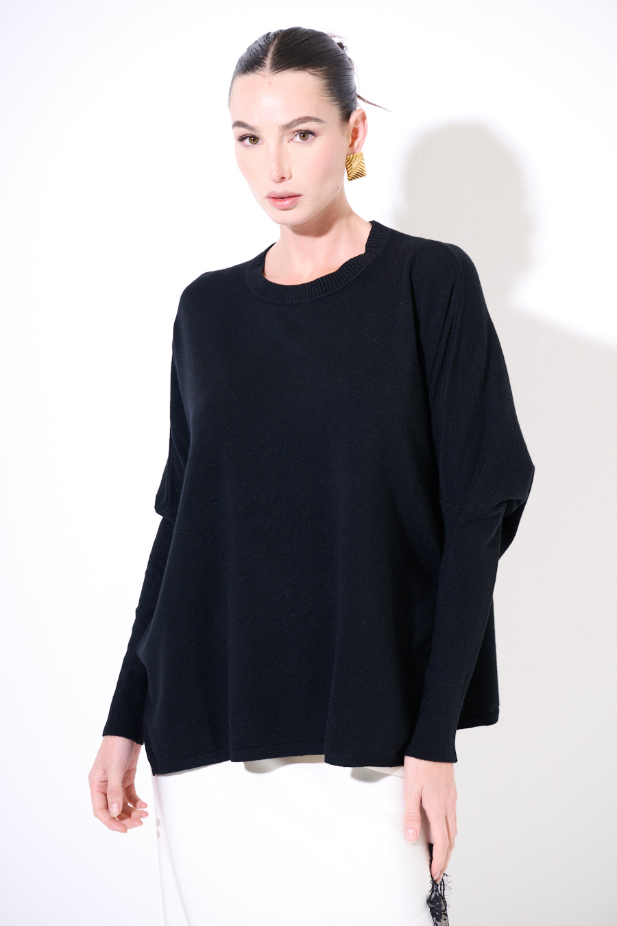 Maglia oversize paricollo con spalla calata e spacchi sui lati.
