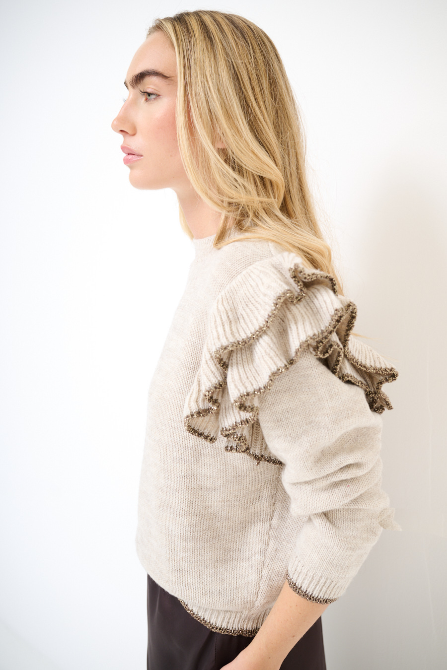 Maglia paricollo con rouches sulla spalla con profilo lurex.