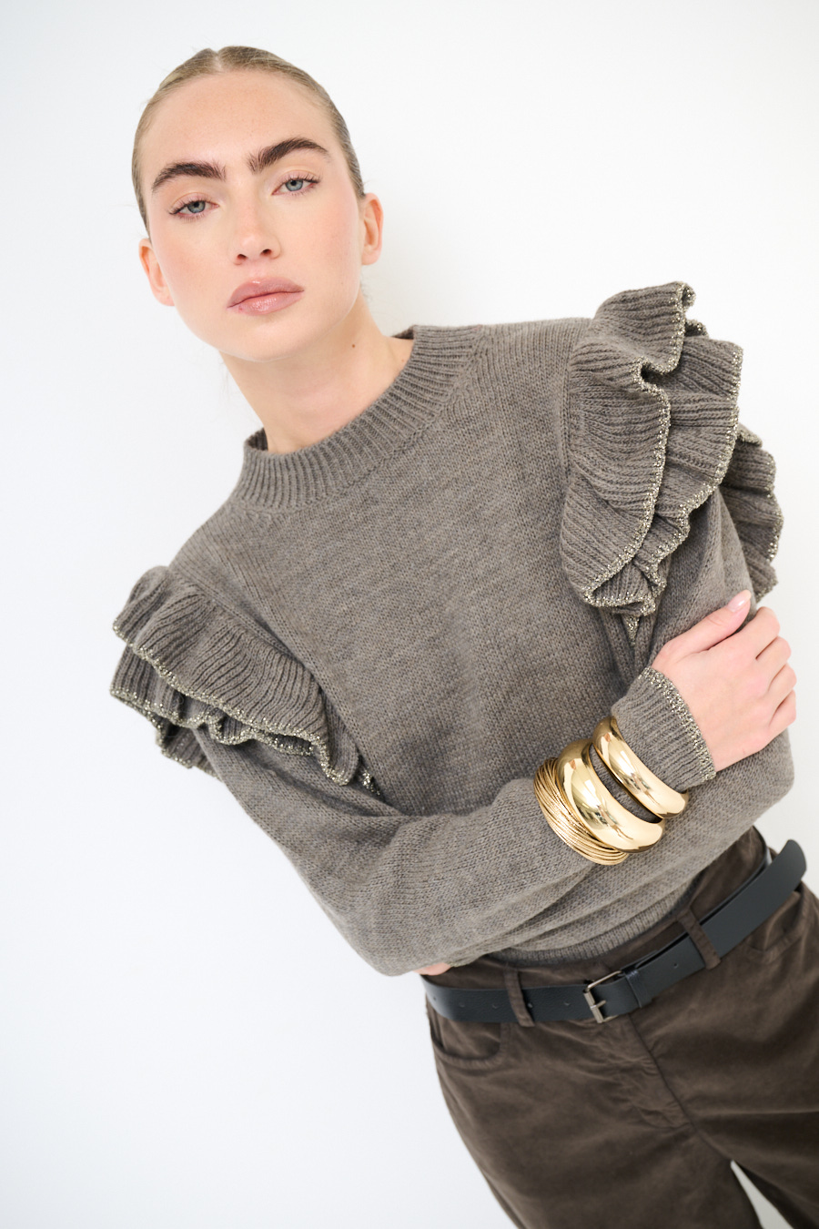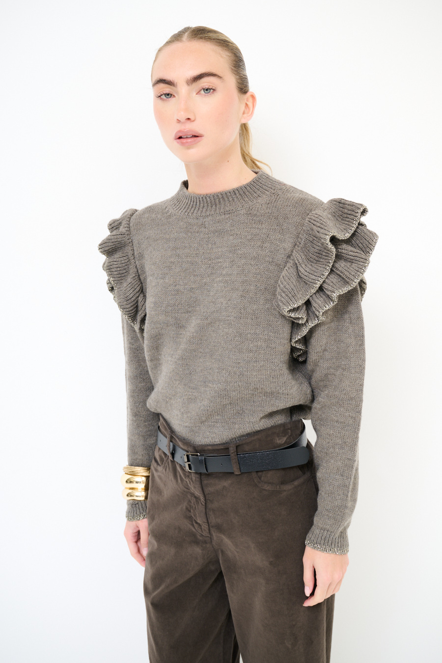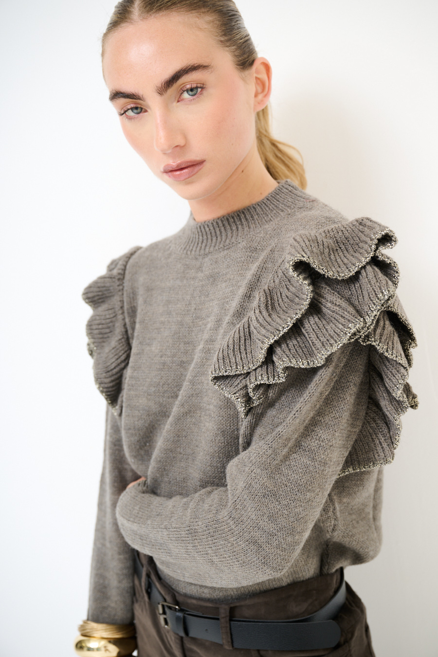 Maglia paricollo con rouches sulla spalla con profilo lurex.