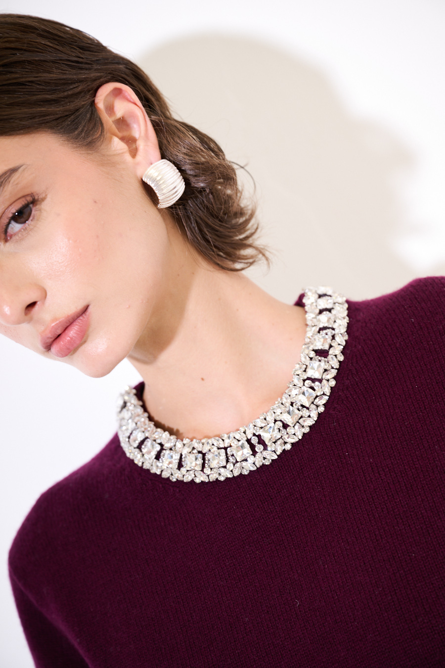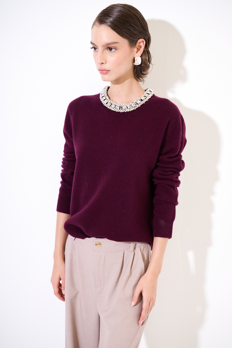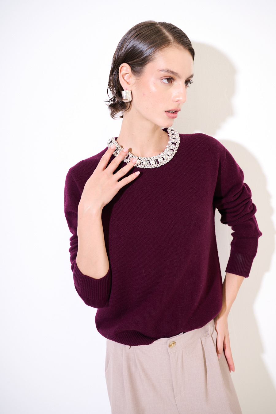 MAGLIA PARICOLLO STRASS LANA CACHEMIRE VINO