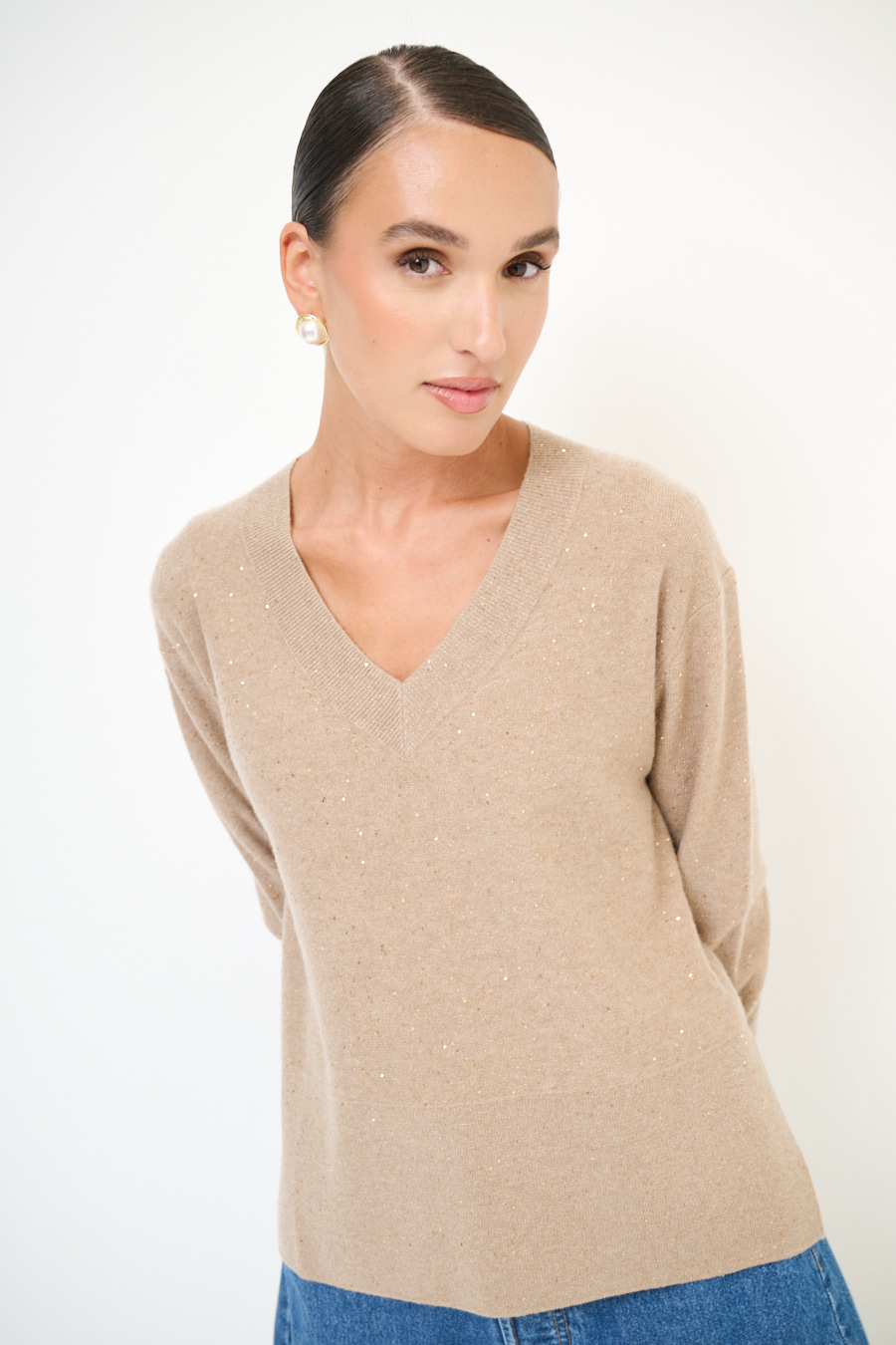 MAGLIA SCOLLO V MICROPAILLETTES LANA CACHEMIRE CAMMELLO
