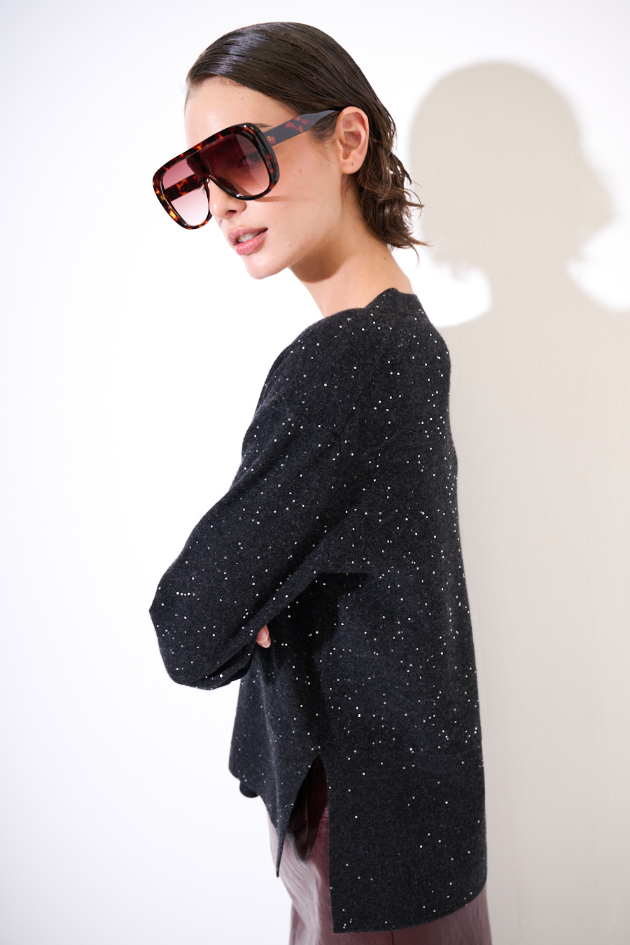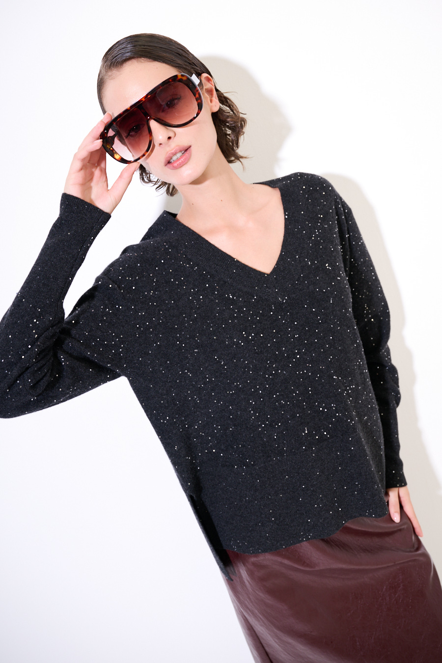 Maglia in misto cashmere con micro paillettes con scollo a v.