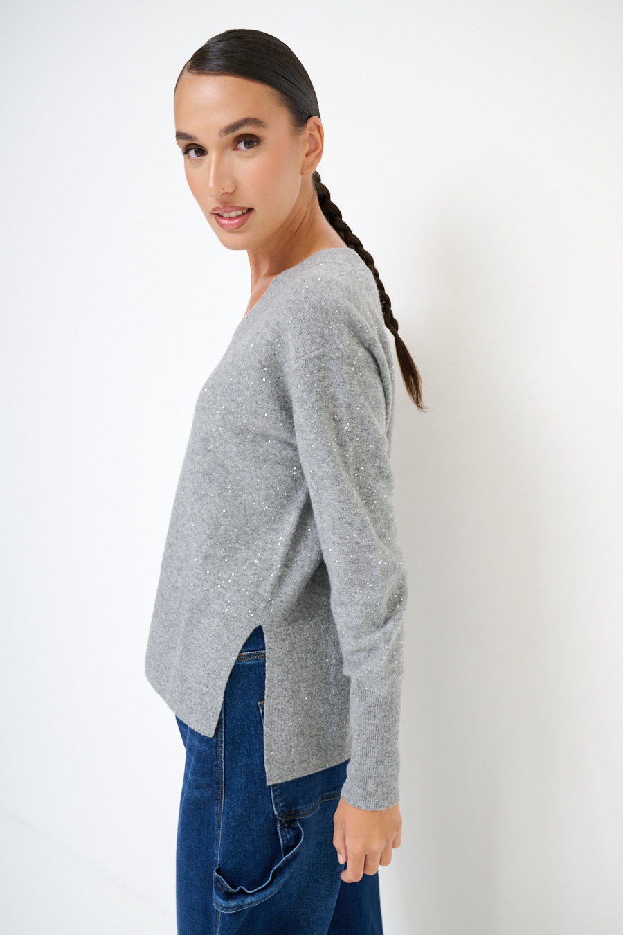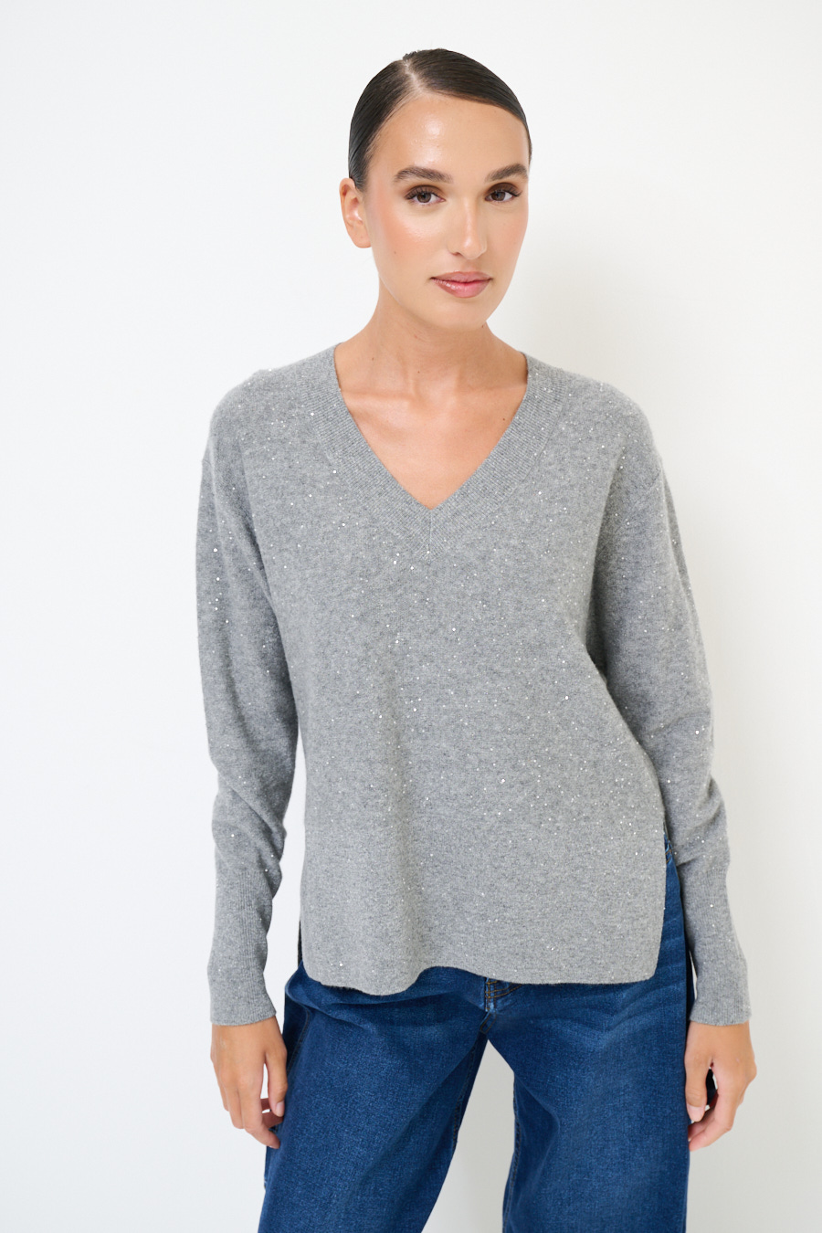MAGLIA SCOLLO V MICROPAILLETTES LANA CACHEMIRE GRIGIO MEDIO