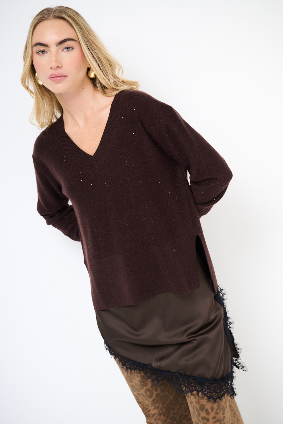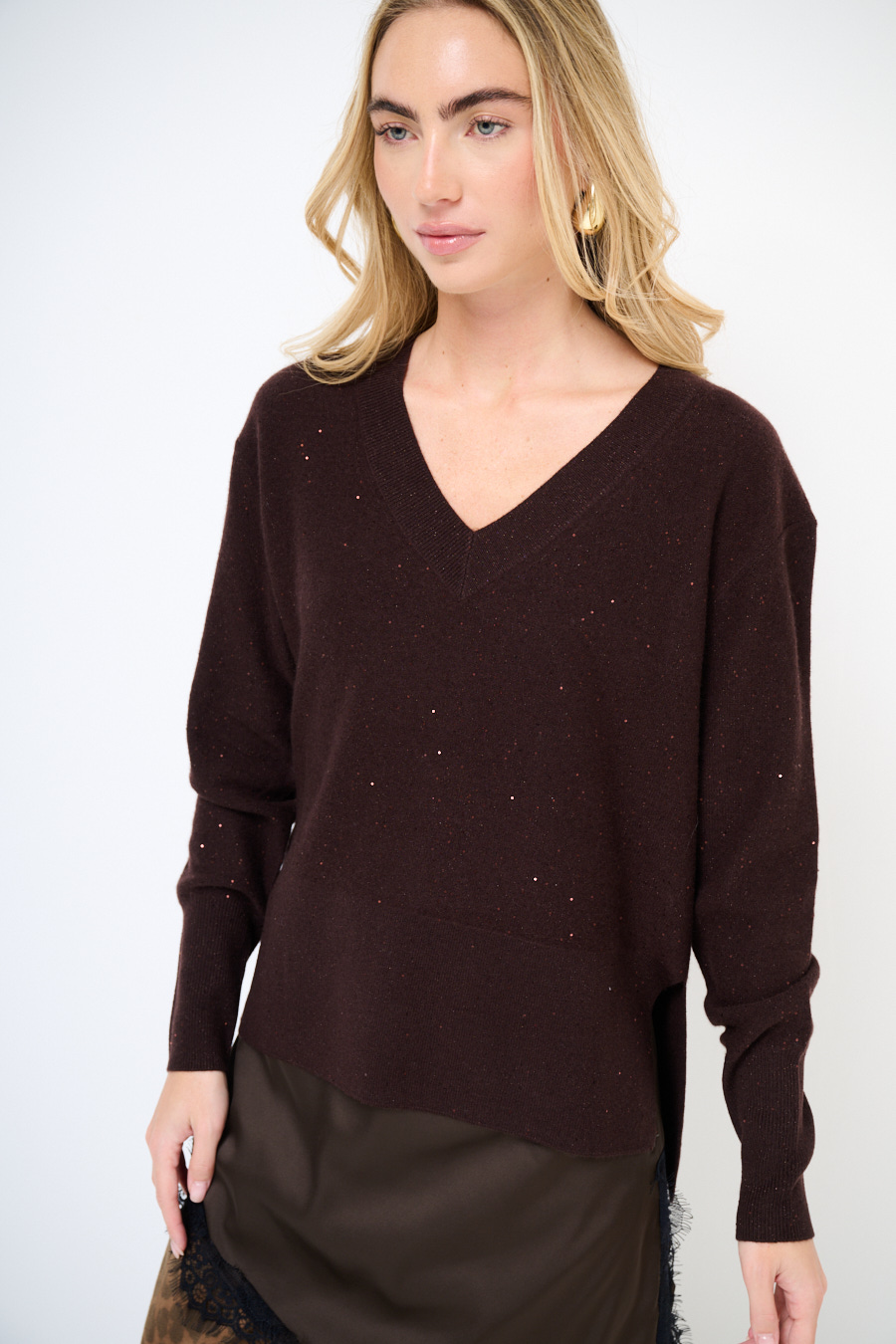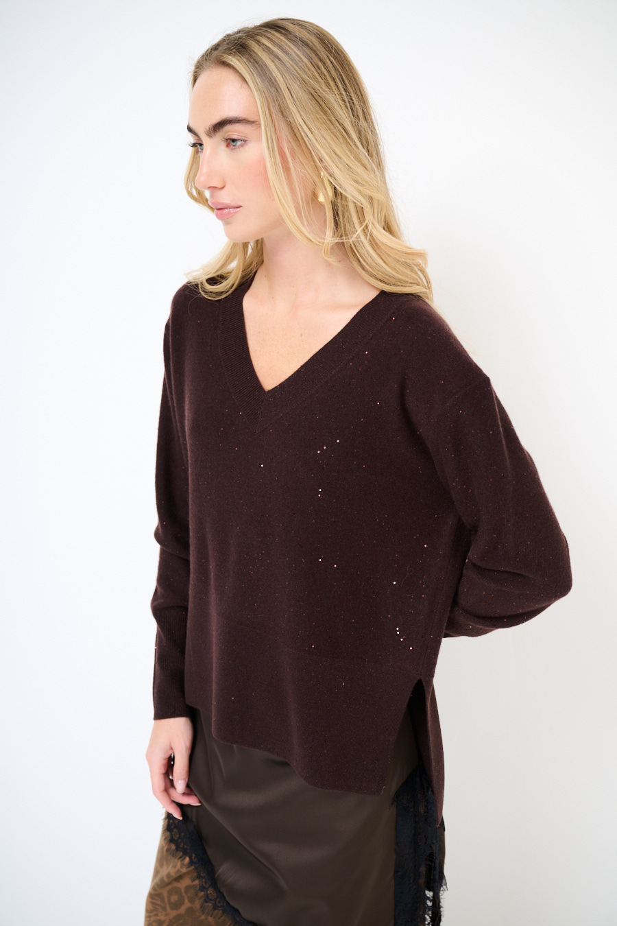 MAGLIA SCOLLO V MICROPAILLETTES LANA CACHEMIRE MORO