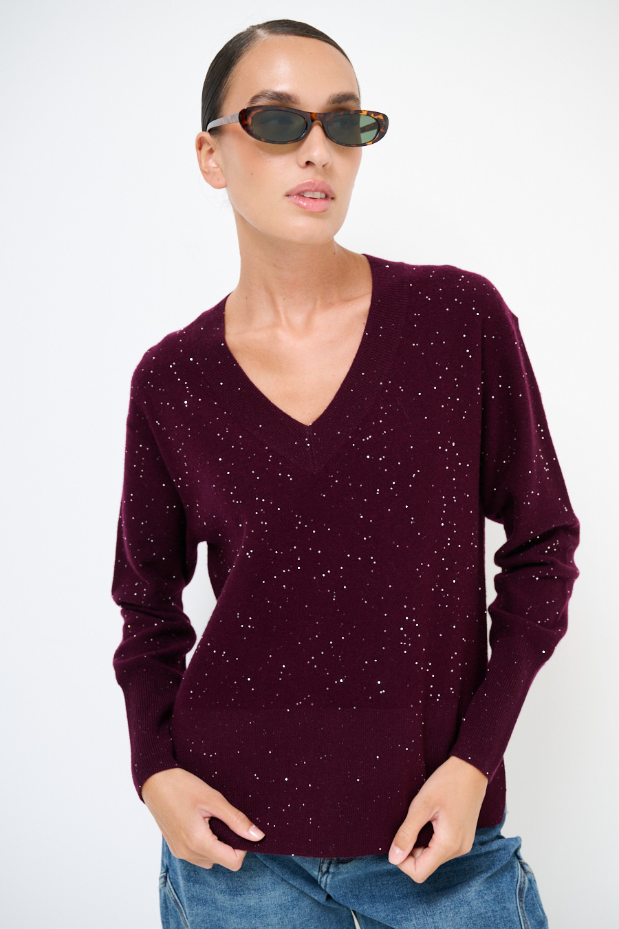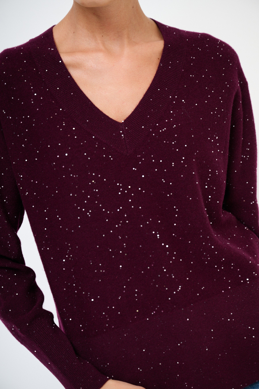 MAGLIA SCOLLO V MICROPAILLETTES LANA CACHEMIRE VINO