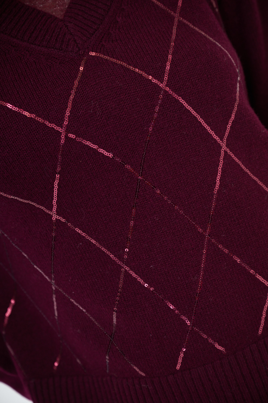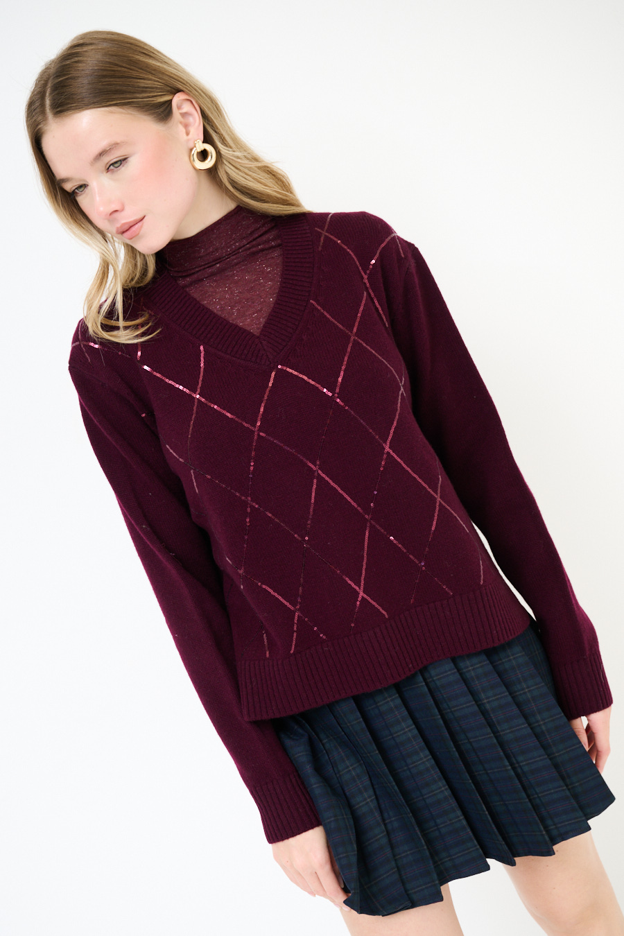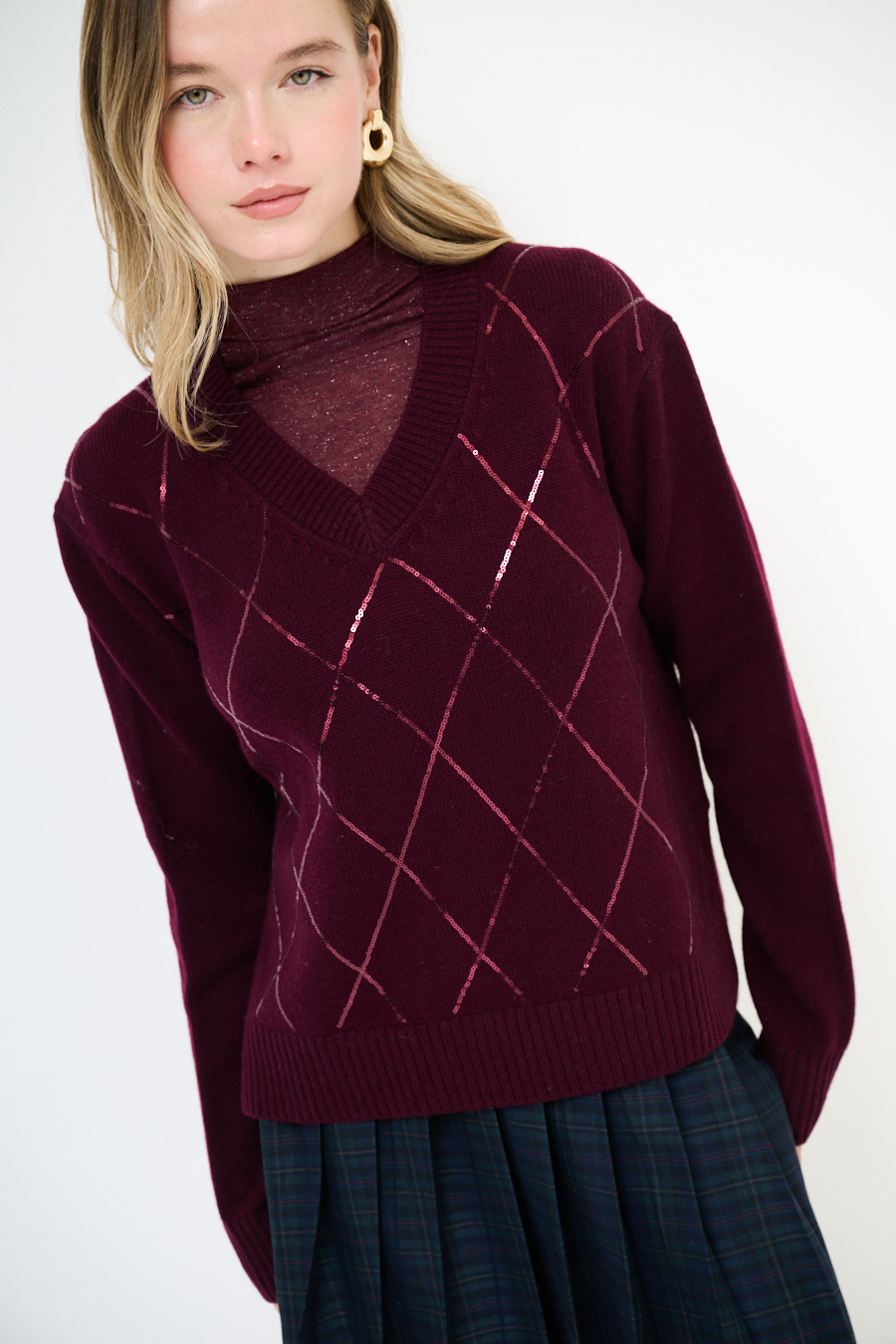 MAGLIA SCOLLO V ROMBI PAILLETTES VINO